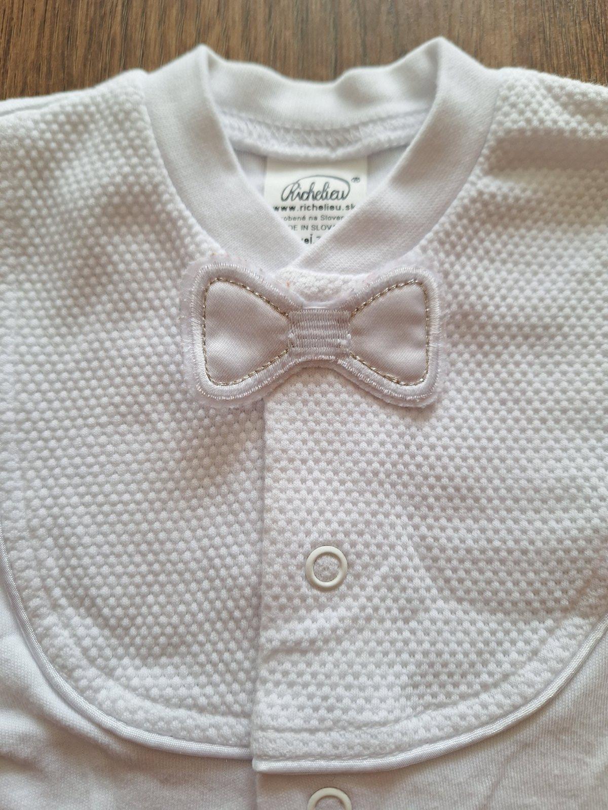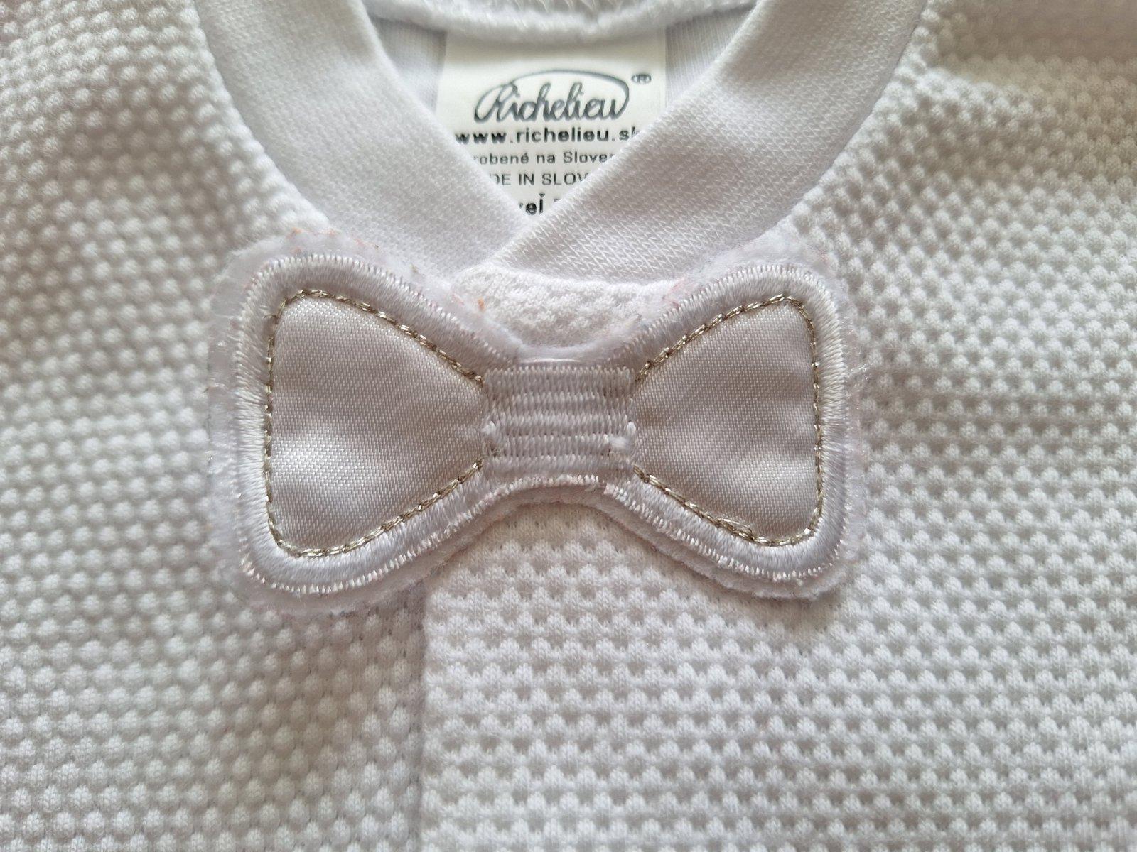 Novy svetrik (pulovrik) pre chlapca na krst alebo specialnu prilezitost. Nenoseny. Kvalitna znacka Richelieu, kvalitne prevedenie. Motylik je lemovany zlatou nitou.