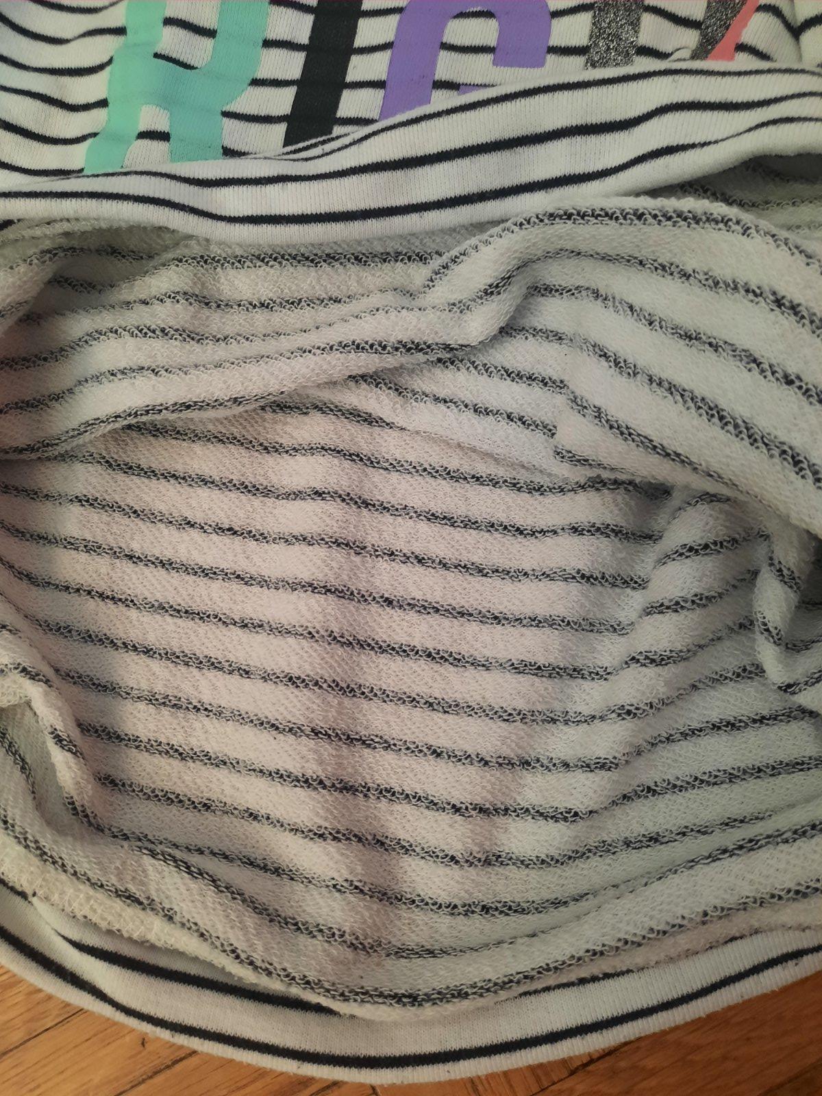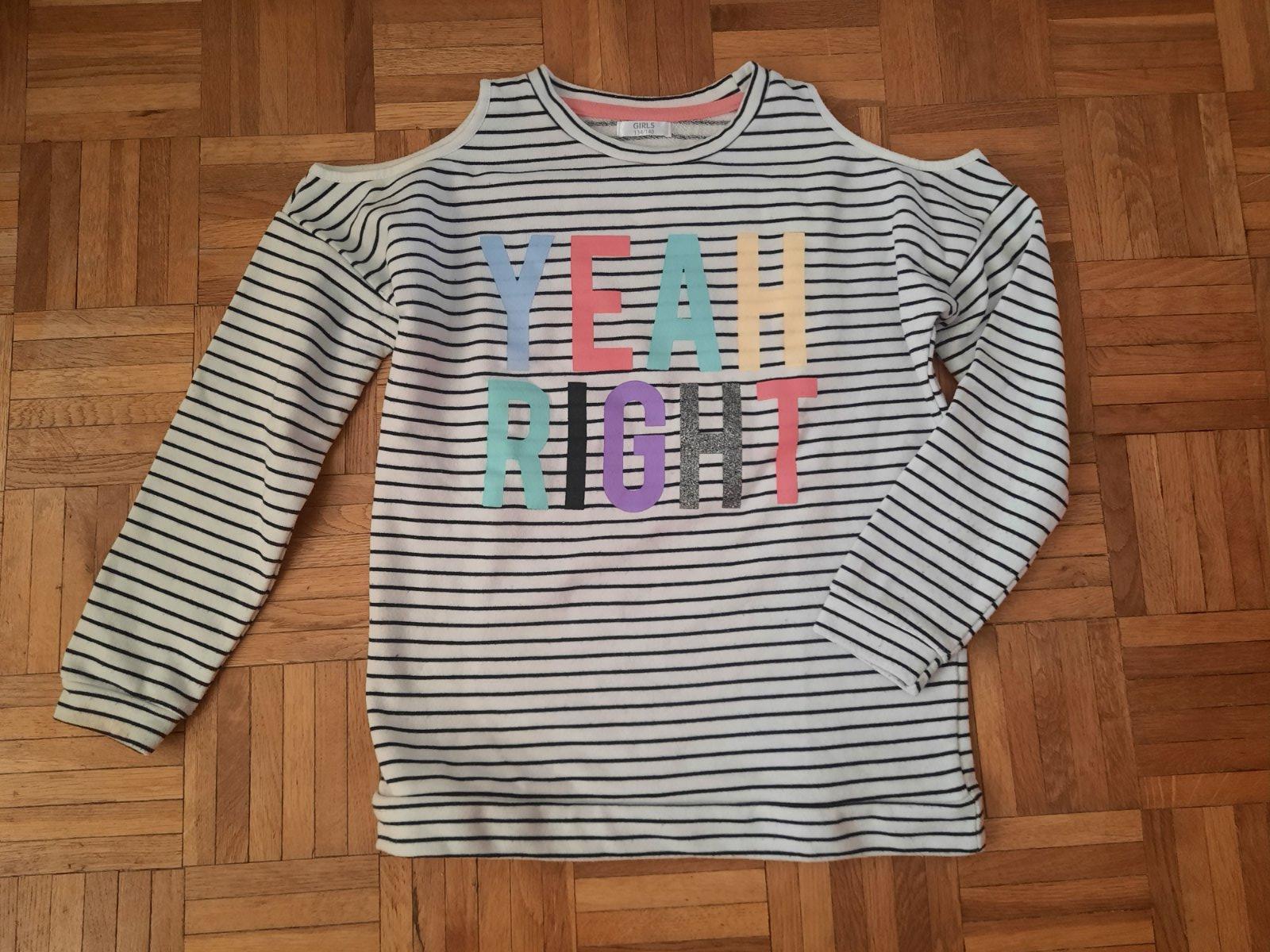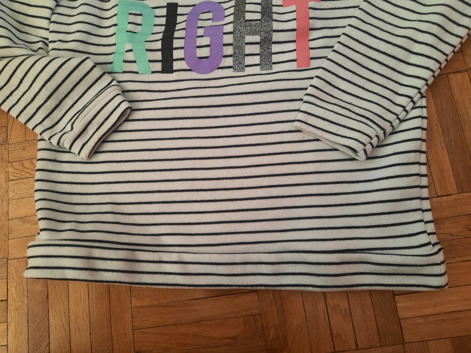 Pekná mikina so zaujímavým riešením pri ramenách- sú tam otvory. Nápis vpredu nie je popukaný. Na spodku aj rukávoch sú manžety.