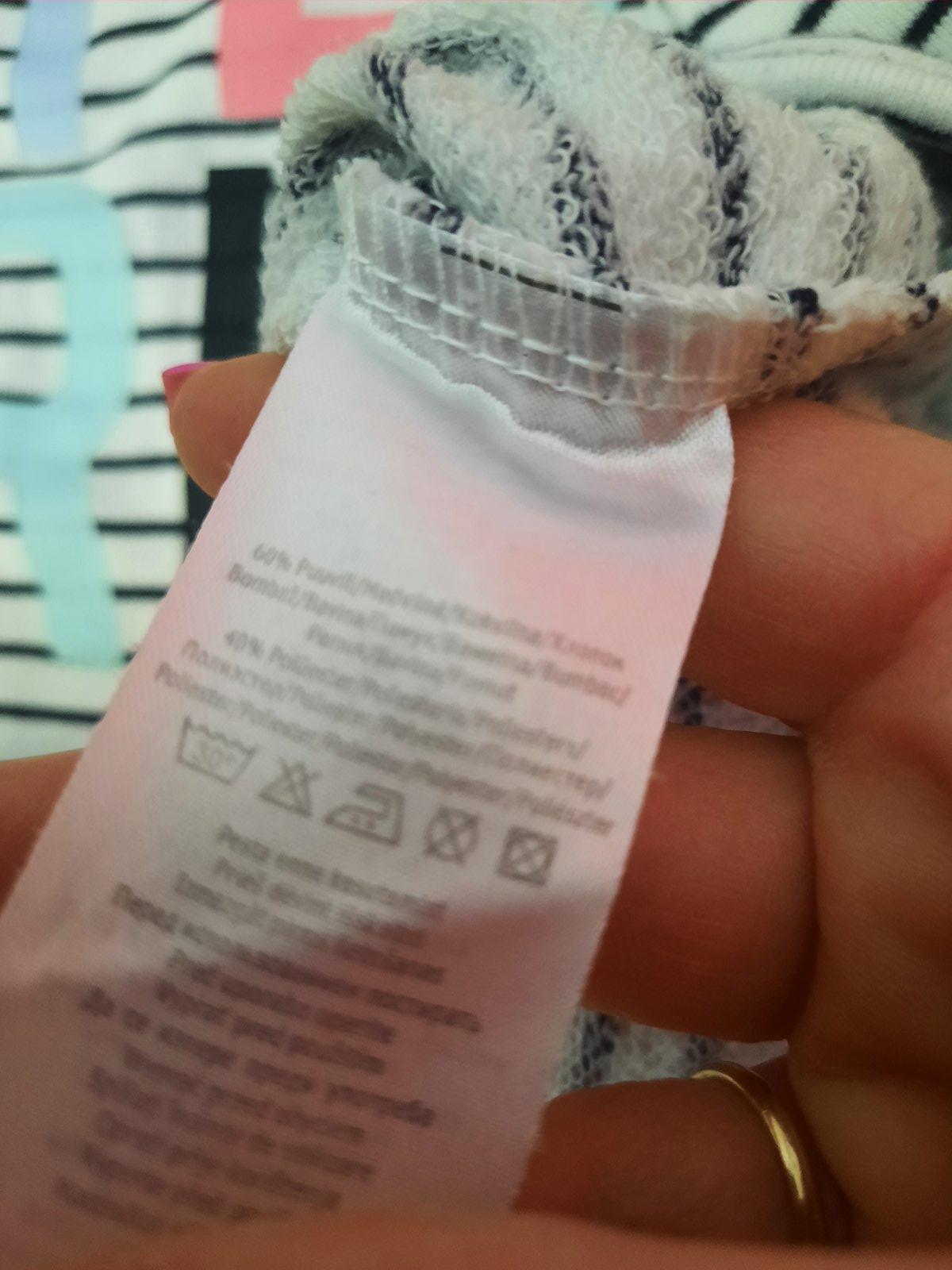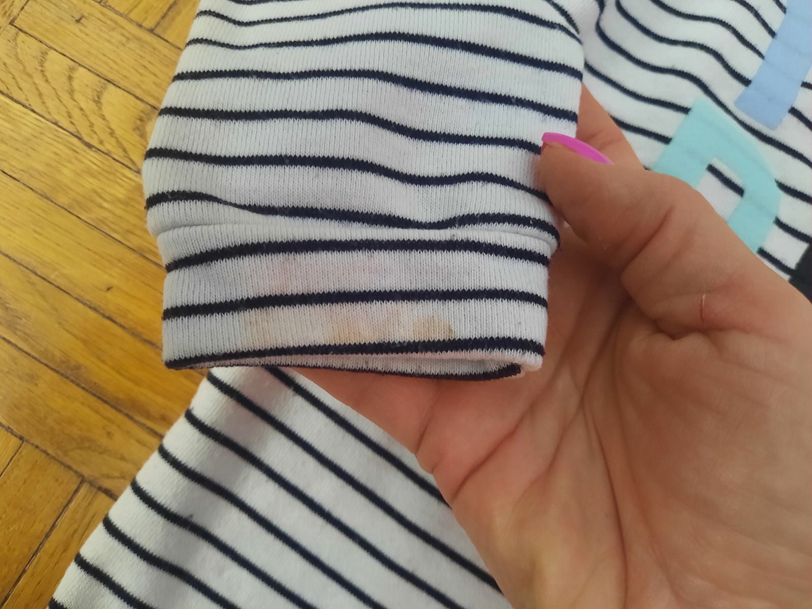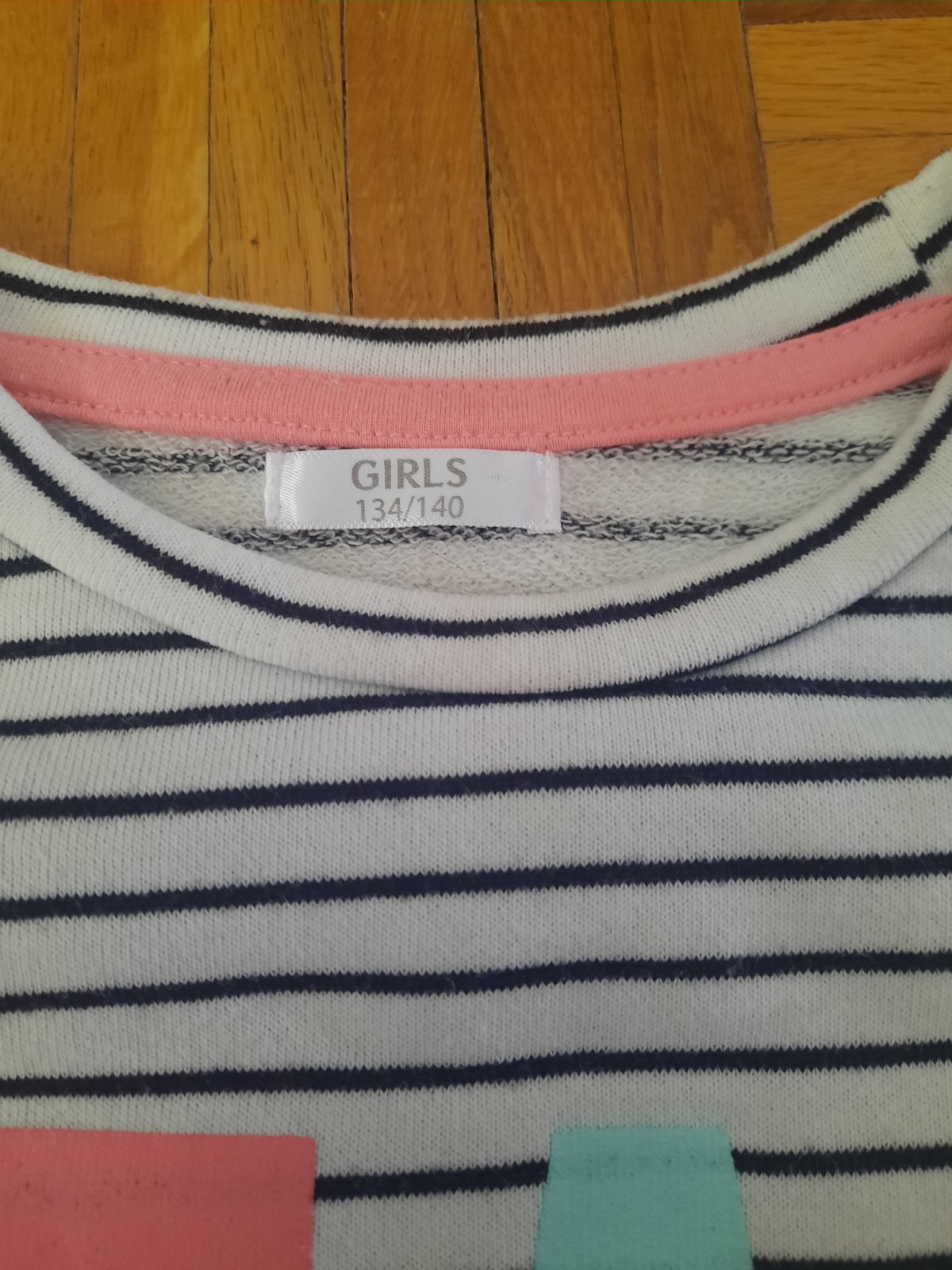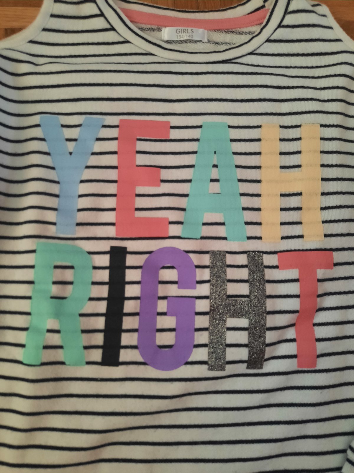 Pekná mikina so zaujímavým riešením pri ramenách- sú tam otvory. Nápis vpredu nie je popukaný. Na spodku aj rukávoch sú manžety.