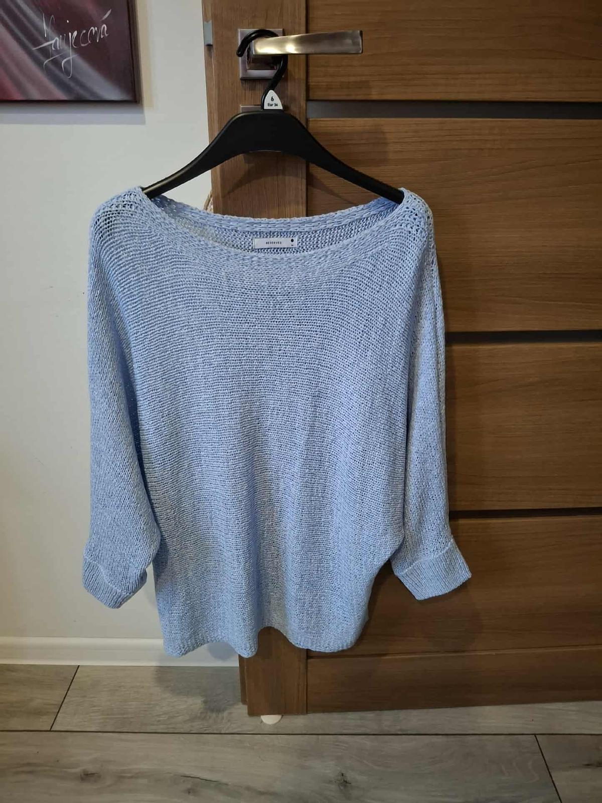 Bledomodrý svetrík, málo nosený. Cena vr. poštového.