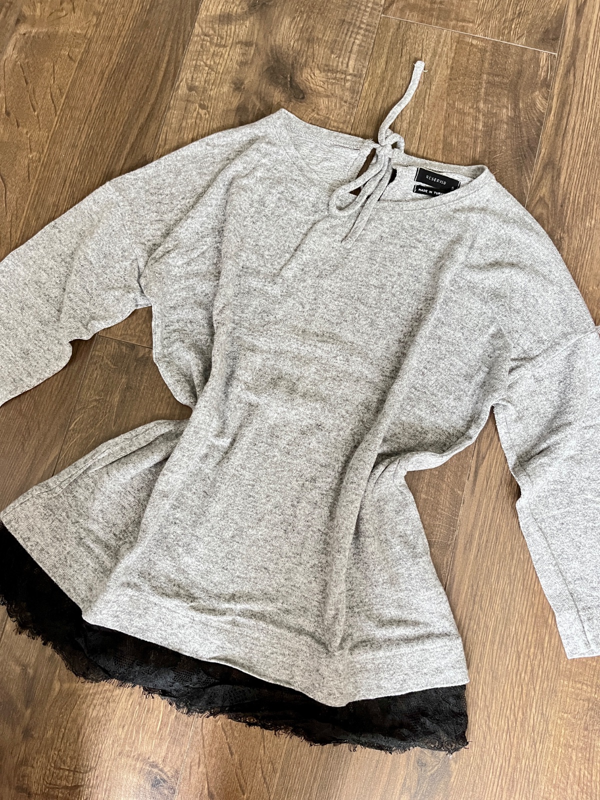 Elegantný dámsky sveter v svetlosivej melírovanej farbe. Vpredu je úplne hladký, bez výstrihu či ozdôb, pôsobí čisto a minimalisticky. Zadná časť je ozvláštnená jemným viazaním pri krku, ktoré dodáva kúsku ženský a zaujímavý detail. Spodný lem je zakončený čiernou čipkou, ktorá vytvára elegantný kontrast a robí top výnimočným.
