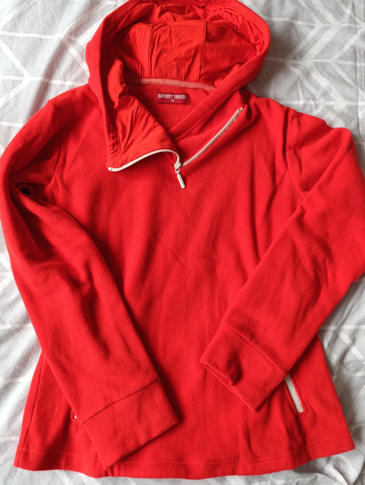 Predám nosenu mikinu, farba červeno oranžová, noseny stav, bez dier, ešte poslúži