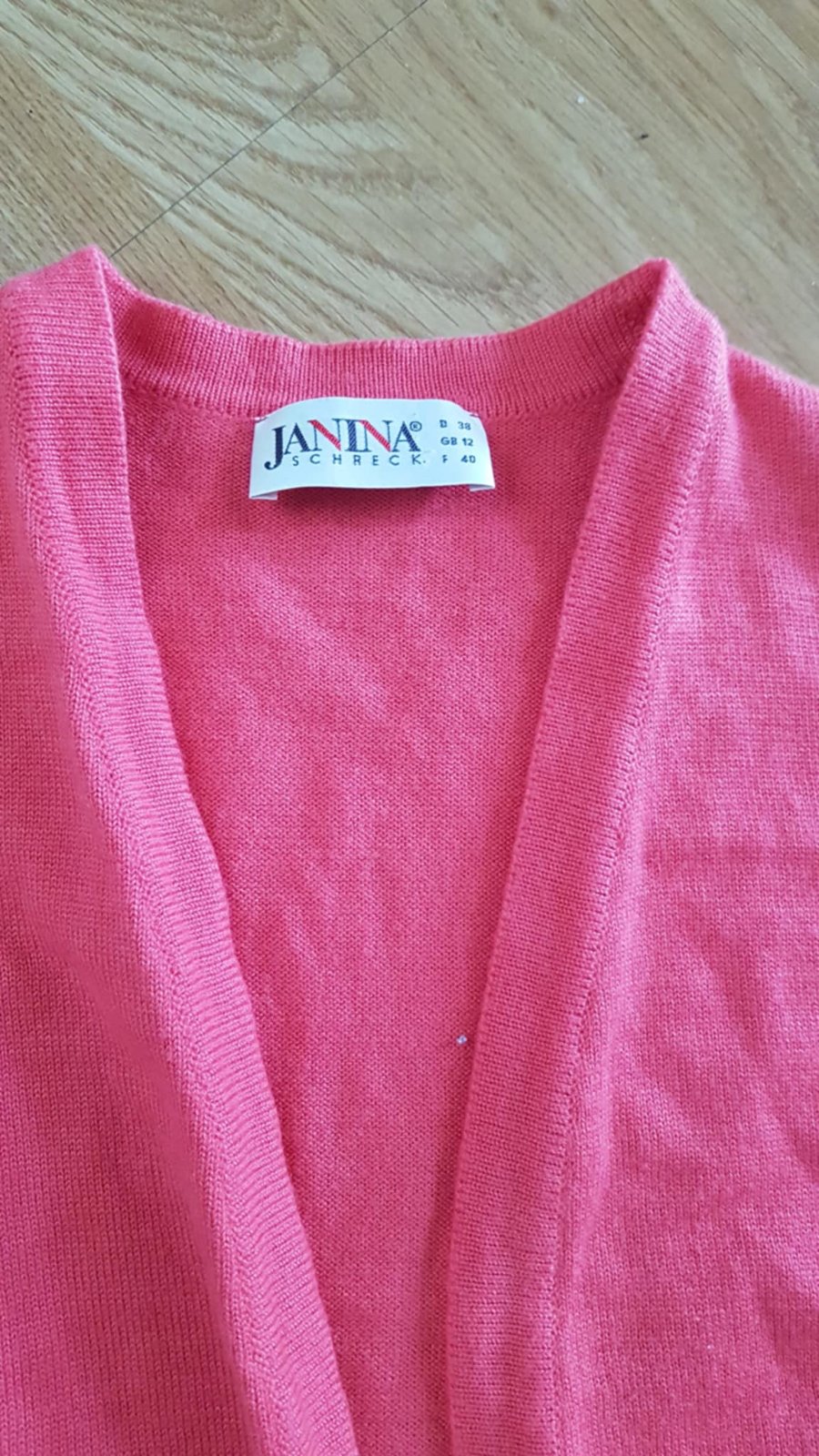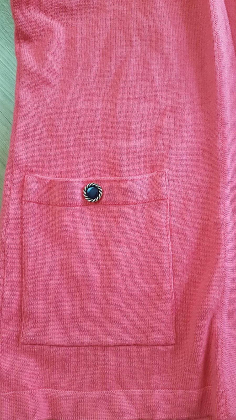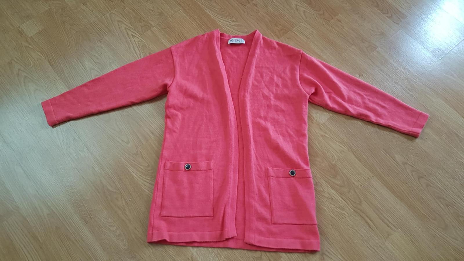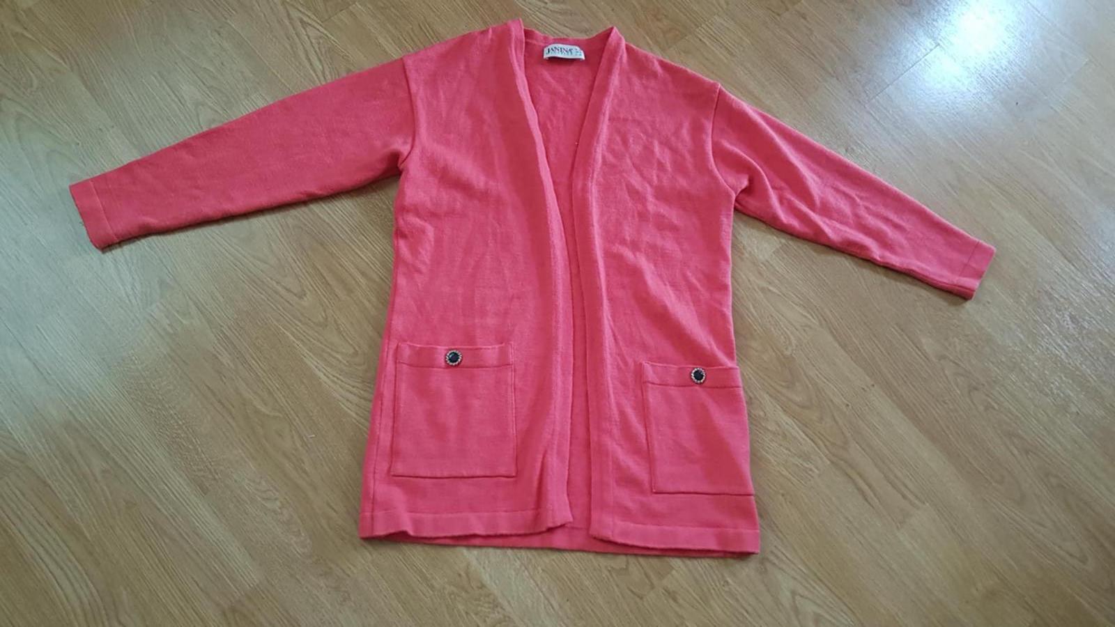 Pekný predĺžený sveter bez zapínania, krásnej farby, bez známok nosenia. Zn. Janina. Má vrecká s ozdobným gombíkom. Šírka je 52 x 2 cm, celková dĺžka je 78 cm.