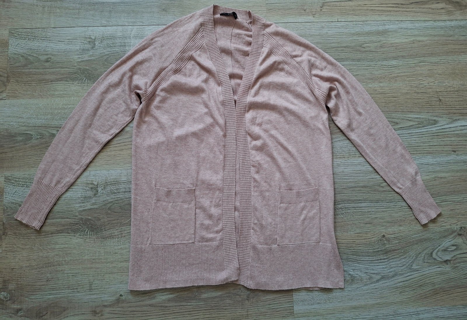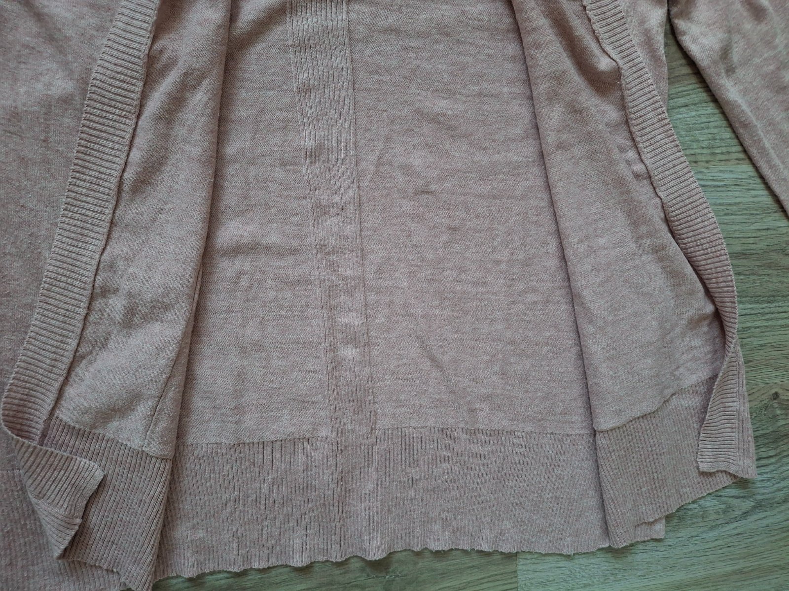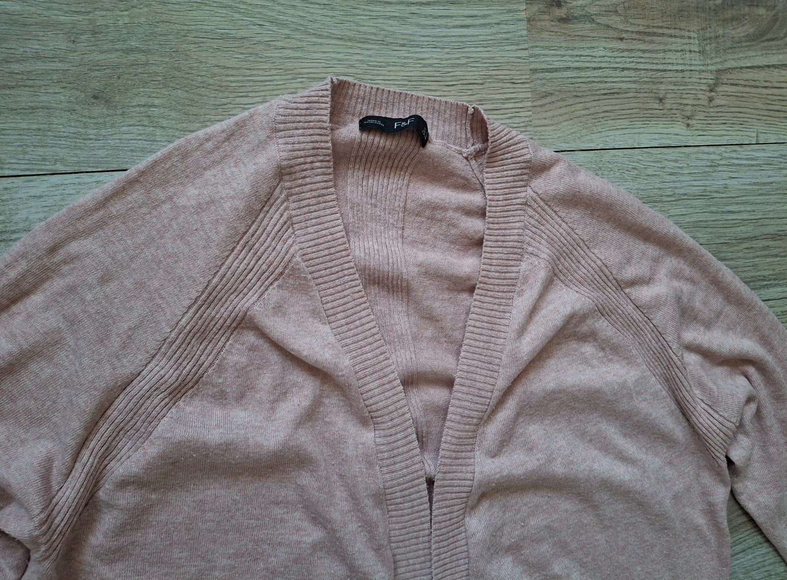Tenší dámsky sveter/ kardigán bez zapínania, oblečený iba párkrát, bez poškodenia, má iba odstrihnutý štítok s veľkosťou, značka FandF, veľkosť 38, miery: šírka 50 cm, dĺžka 70 cm cm, rukáv spod pazuchy 46 cm. Cena 4 eur.