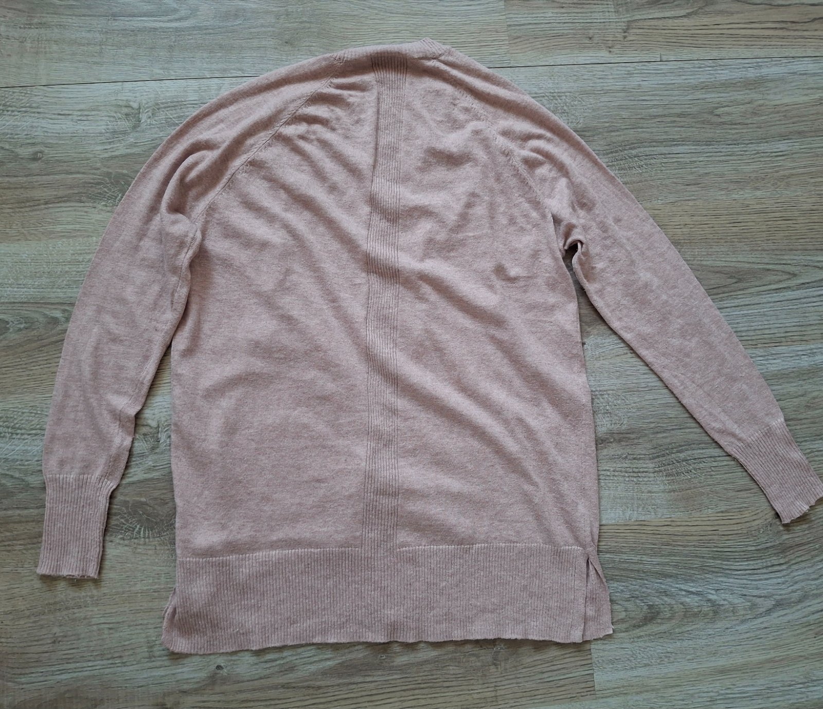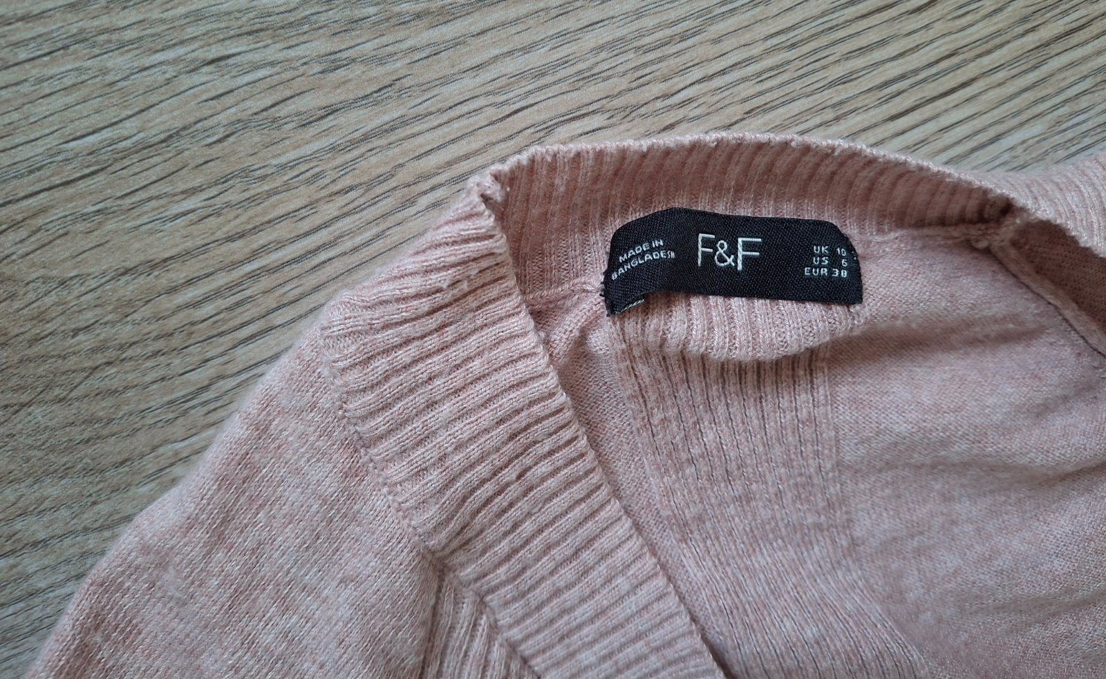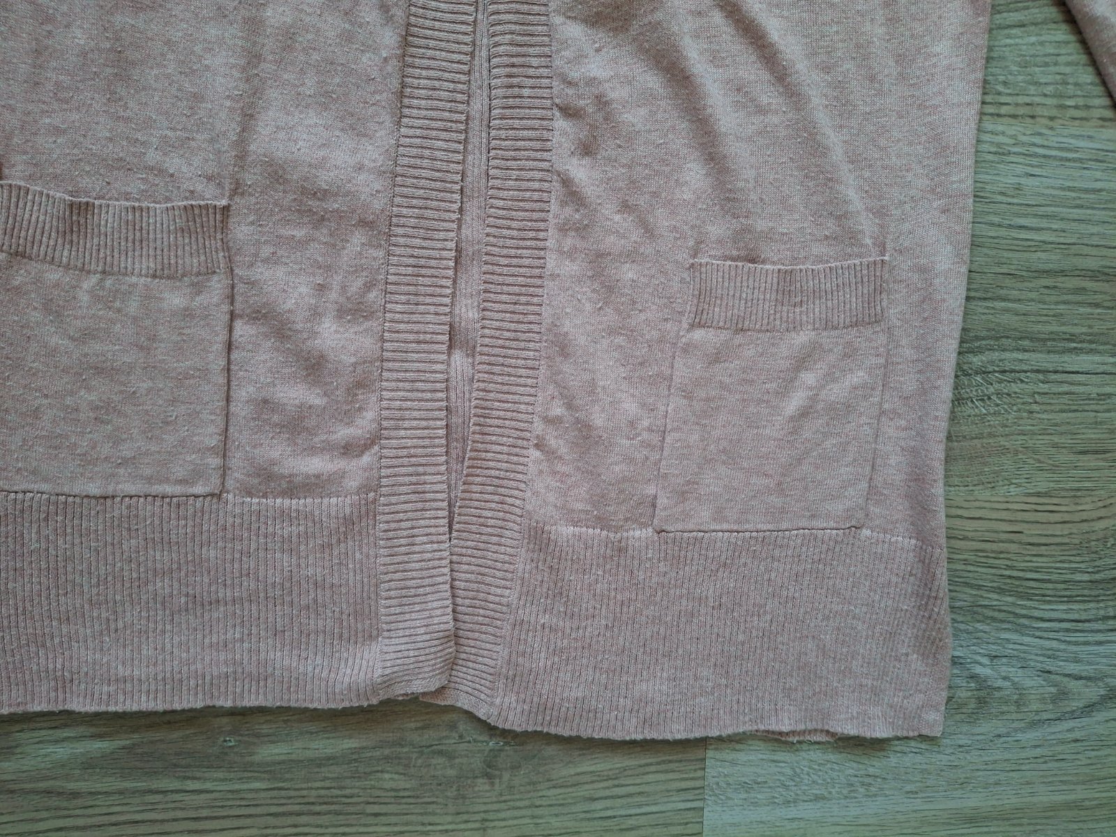 Tenší dámsky sveter/ kardigán bez zapínania, oblečený iba párkrát, bez poškodenia, má iba odstrihnutý štítok s veľkosťou, značka FandF, veľkosť 38, miery: šírka 50 cm, dĺžka 70 cm cm, rukáv spod pazuchy 46 cm. Cena 4 eur.