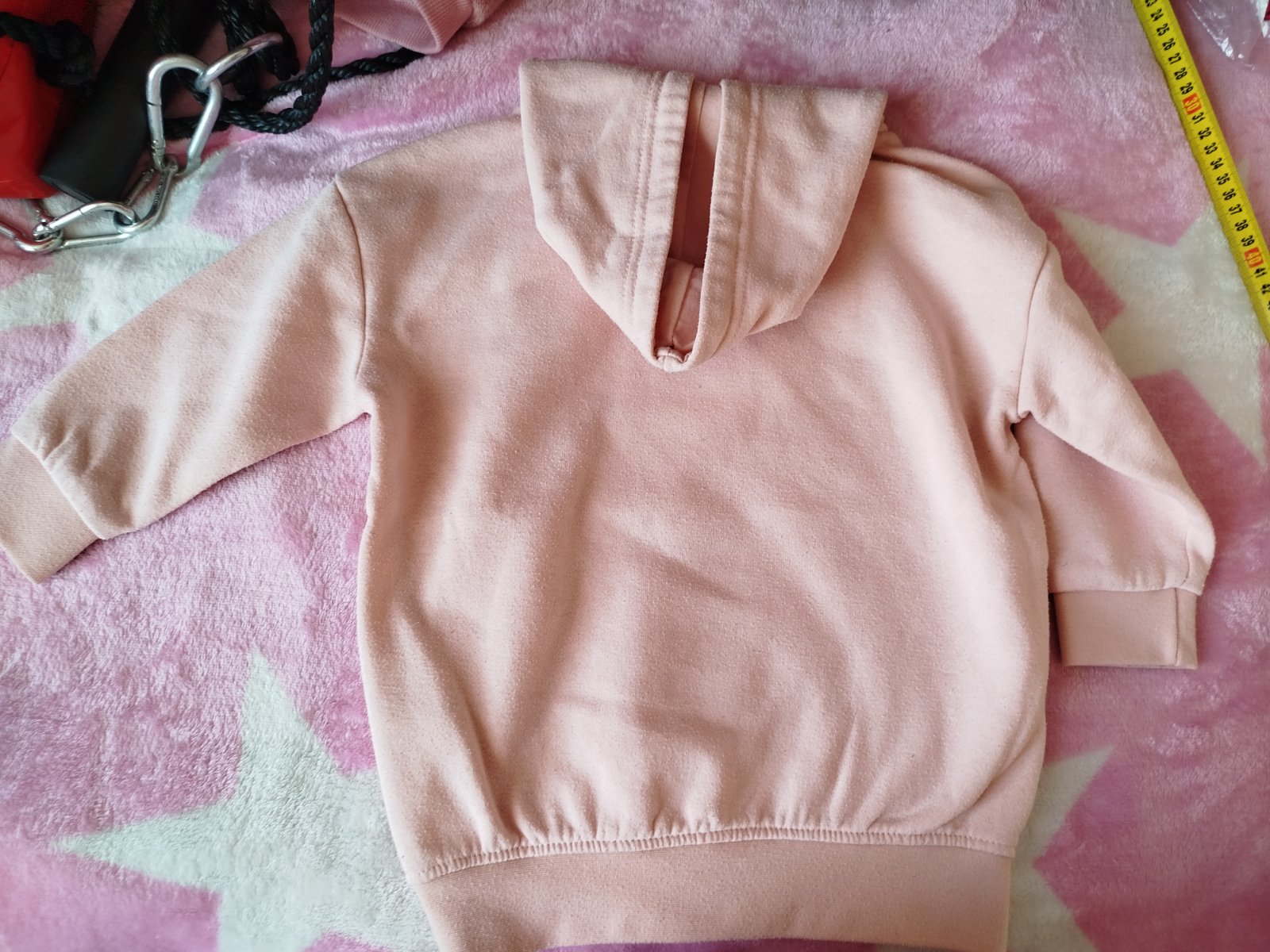 Pohodlná, jemne ružová mikina na donosenie. Voľnejší strih umožňuje nosiť kľudne aj vo veľkosti 98. Mini fliacik a žmolky po praní.