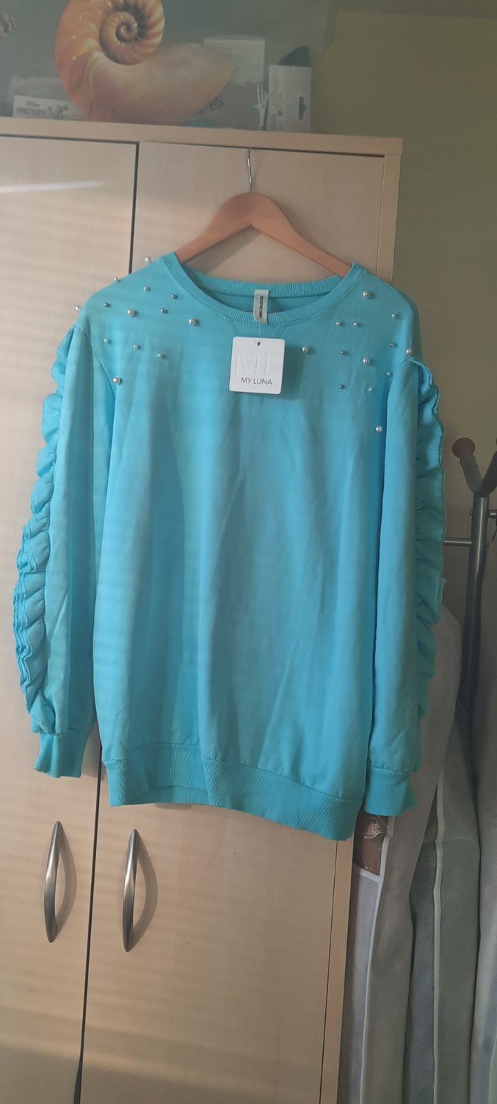 Predám krásnu mikinku. Farba azúrovo modrá, nedá sa lepšie odfotiť. 95 % bavlna 5% elastan. Šírka: 58 cm, dĺžka: 73 cm.