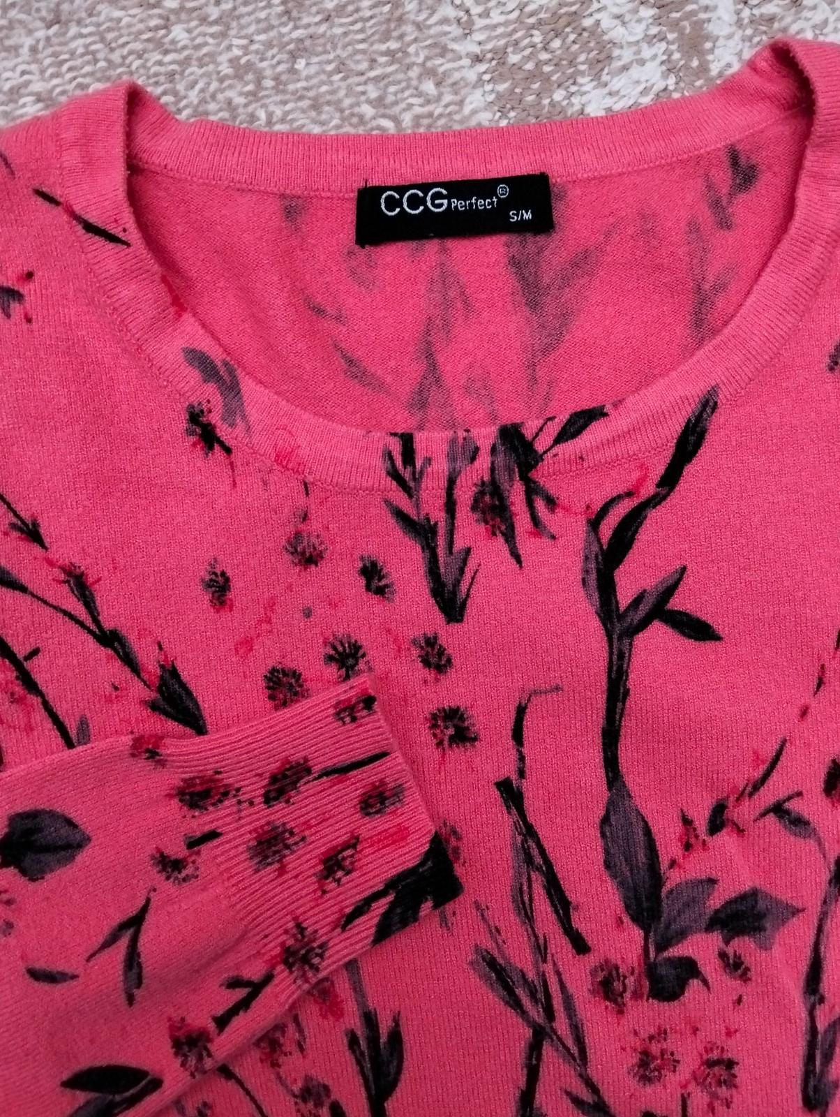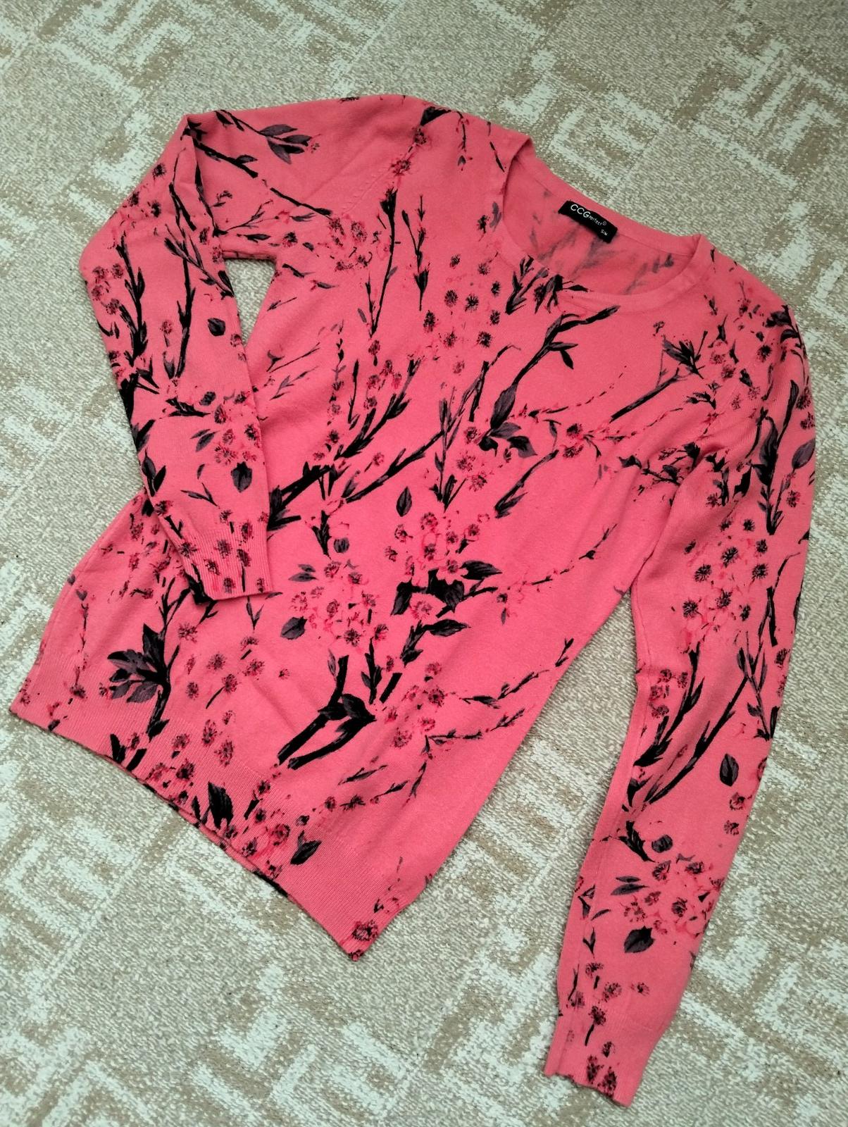Elastický svetrík v koralovej farbe so vzorom čerešňových kvetov. Materiál: 50% bavlna, 33% vlna, 7% akryl, 10% elastan. Značka CCG Perfect.