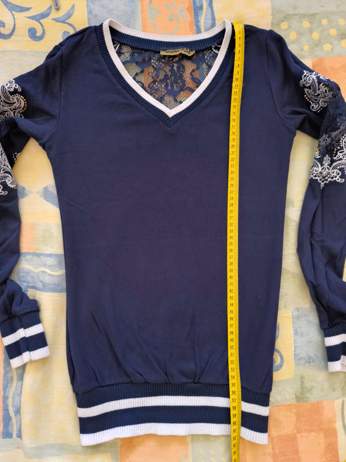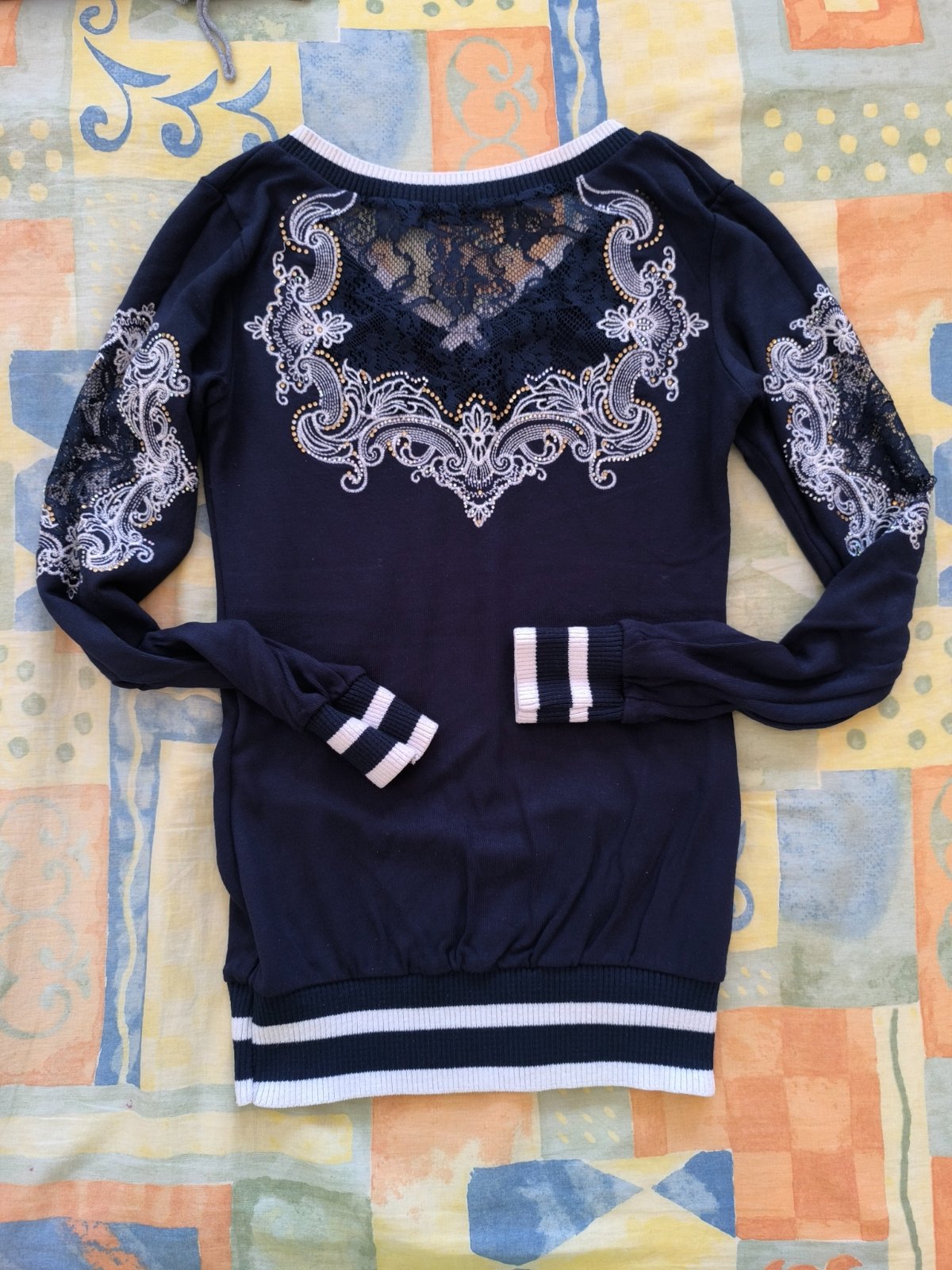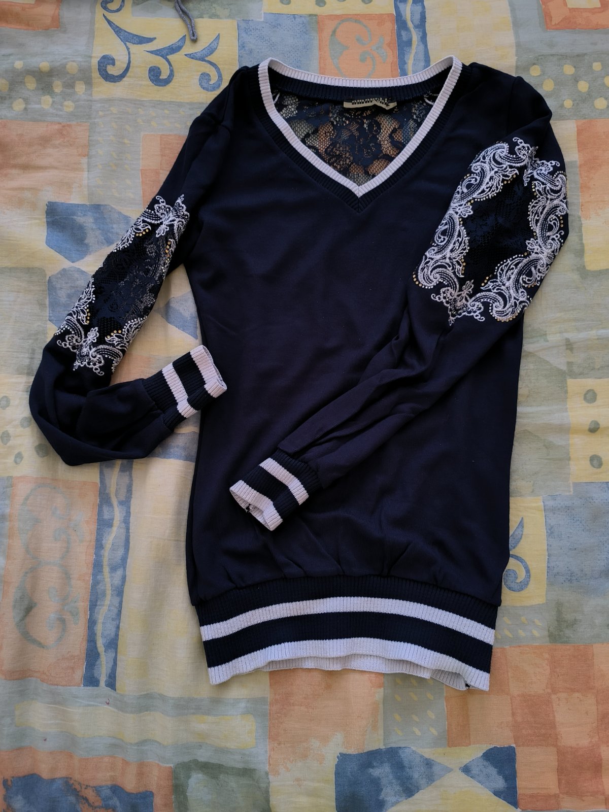 Krásny tmavomodrý pulovrík. Na rukávoch a chrbáte kamienky + čipka.