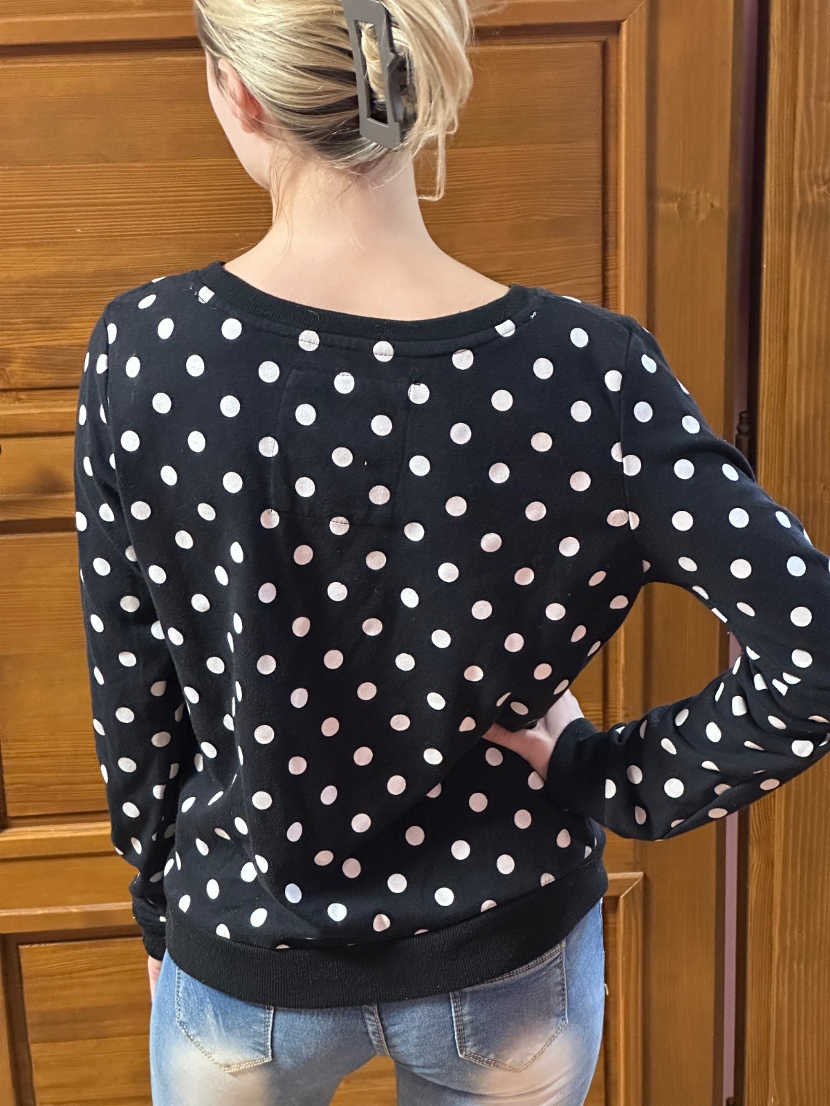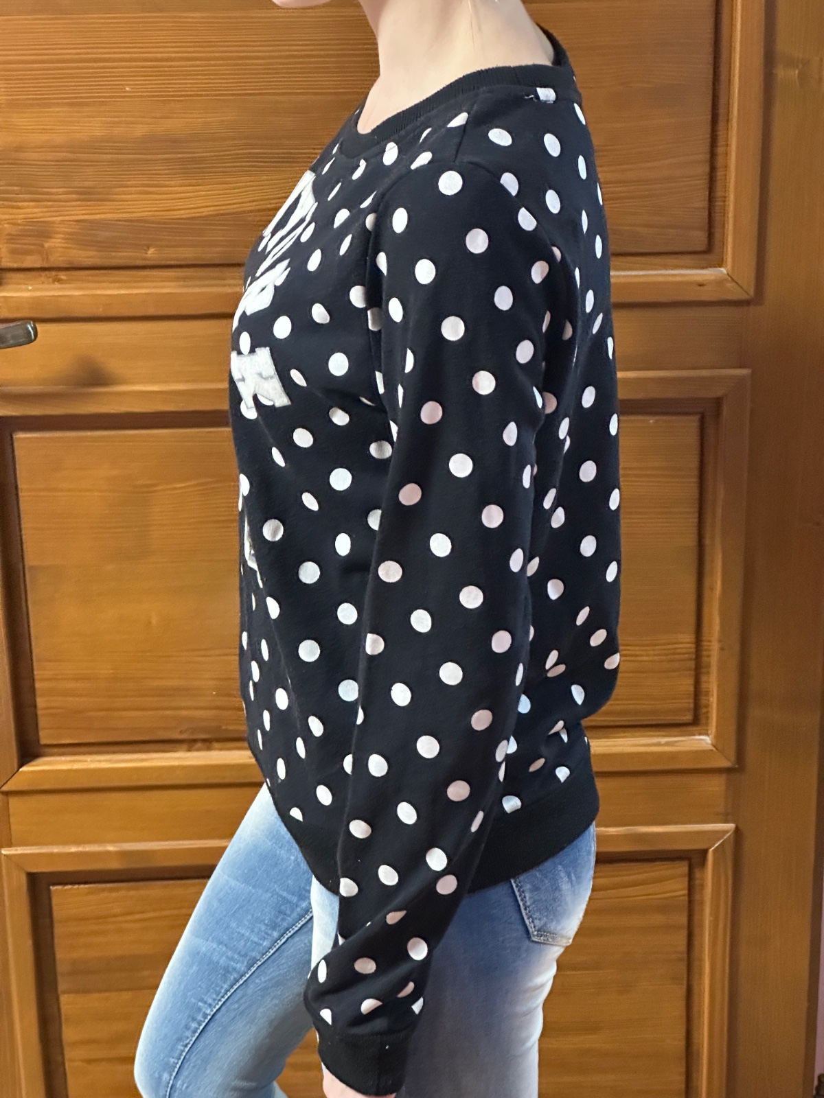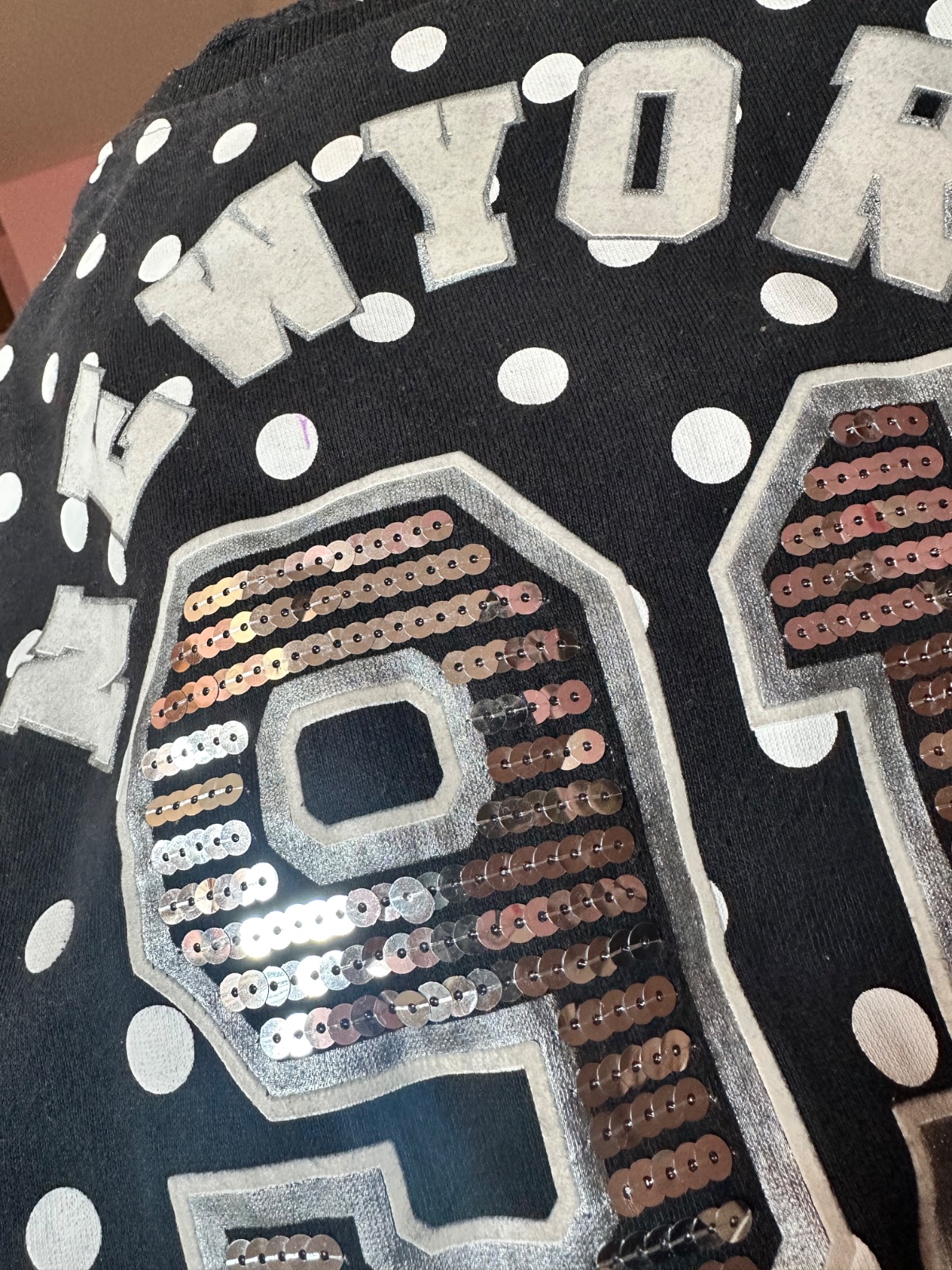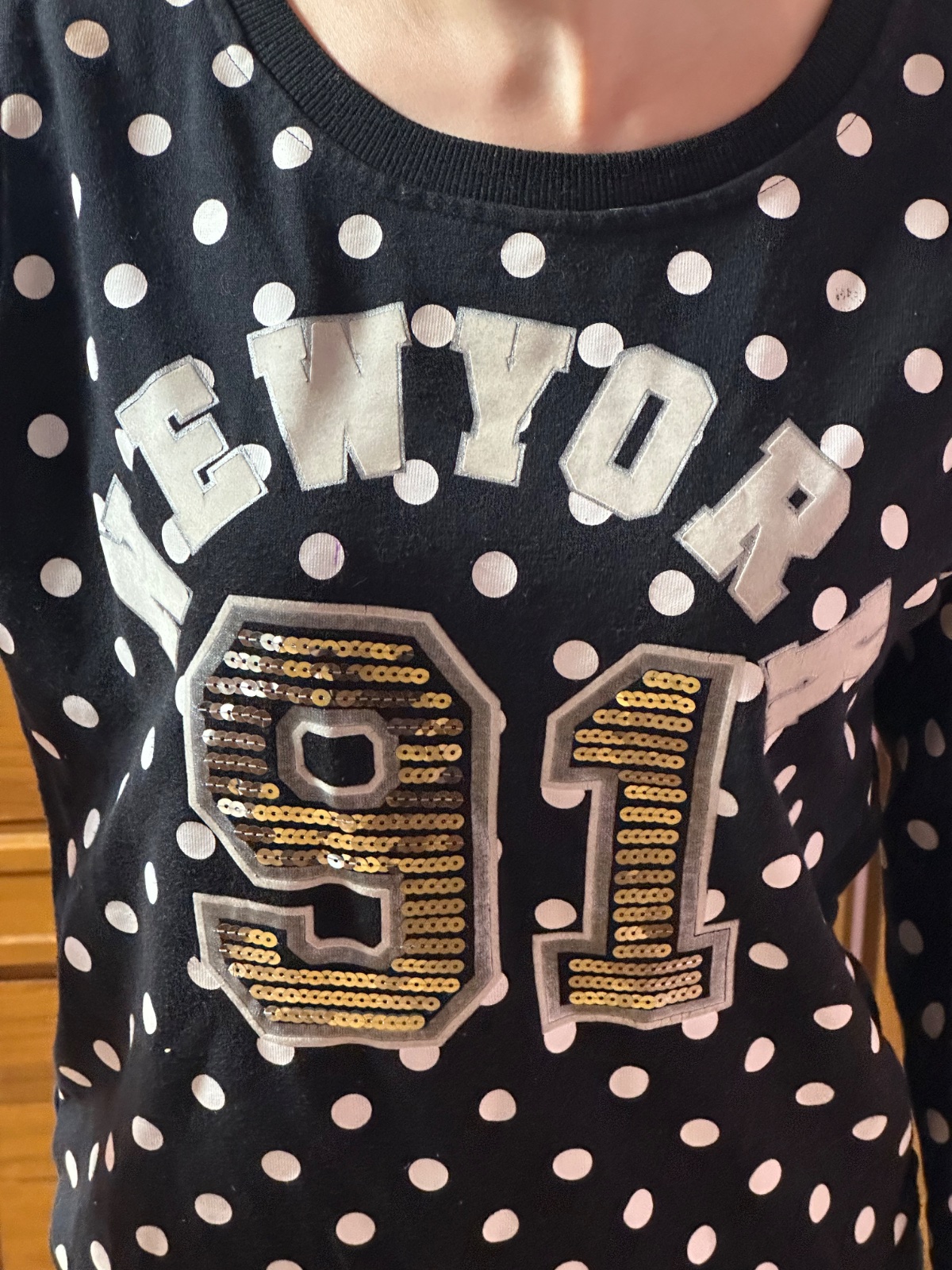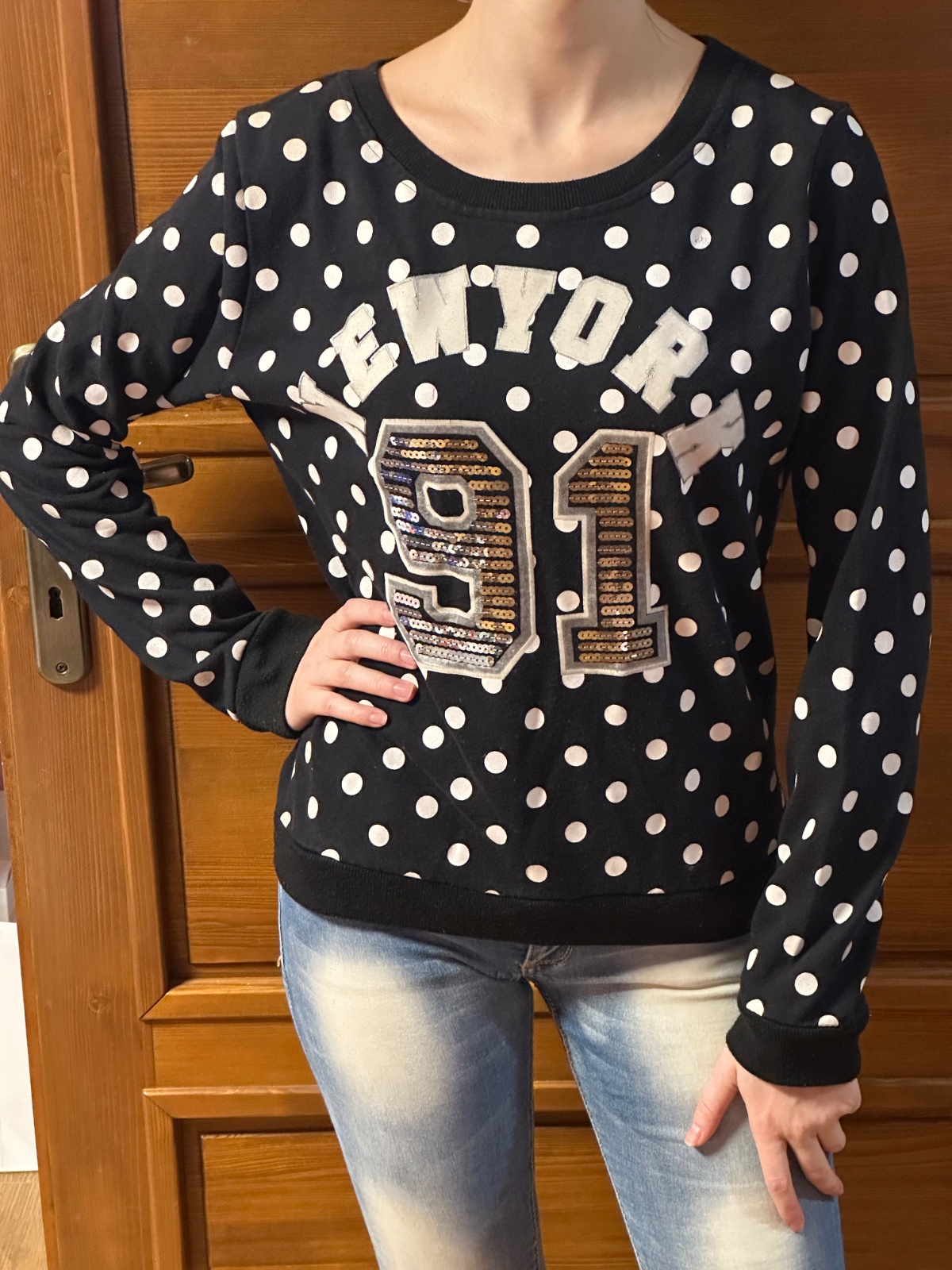 Predám dámsku mikinu s bodkovaným vzorom a výrazným nápisom NEW YORK 91 na prednej strane. Čísla sú zdobené flitrami, ktoré dodávajú mikine zaujímavý vzhľad.
