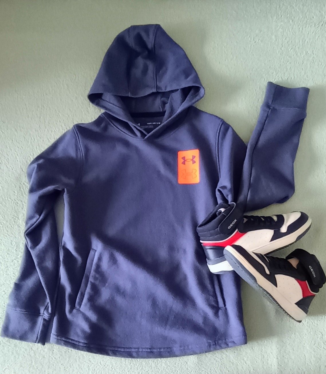 Ľahučká tenšia mikina šedo modrej farby bez zateplenia, logo výrazné neónové, 69% bavlna, 31% polyester, funkčné vrecká, zadok jemne predĺžený, ukončenie do mierneho oblúka, veľkosť 146/152, kupovaná v zahraničí, super stav bez poškodenia a fľakov, logo neporušené, jemný chĺpok z prania.
