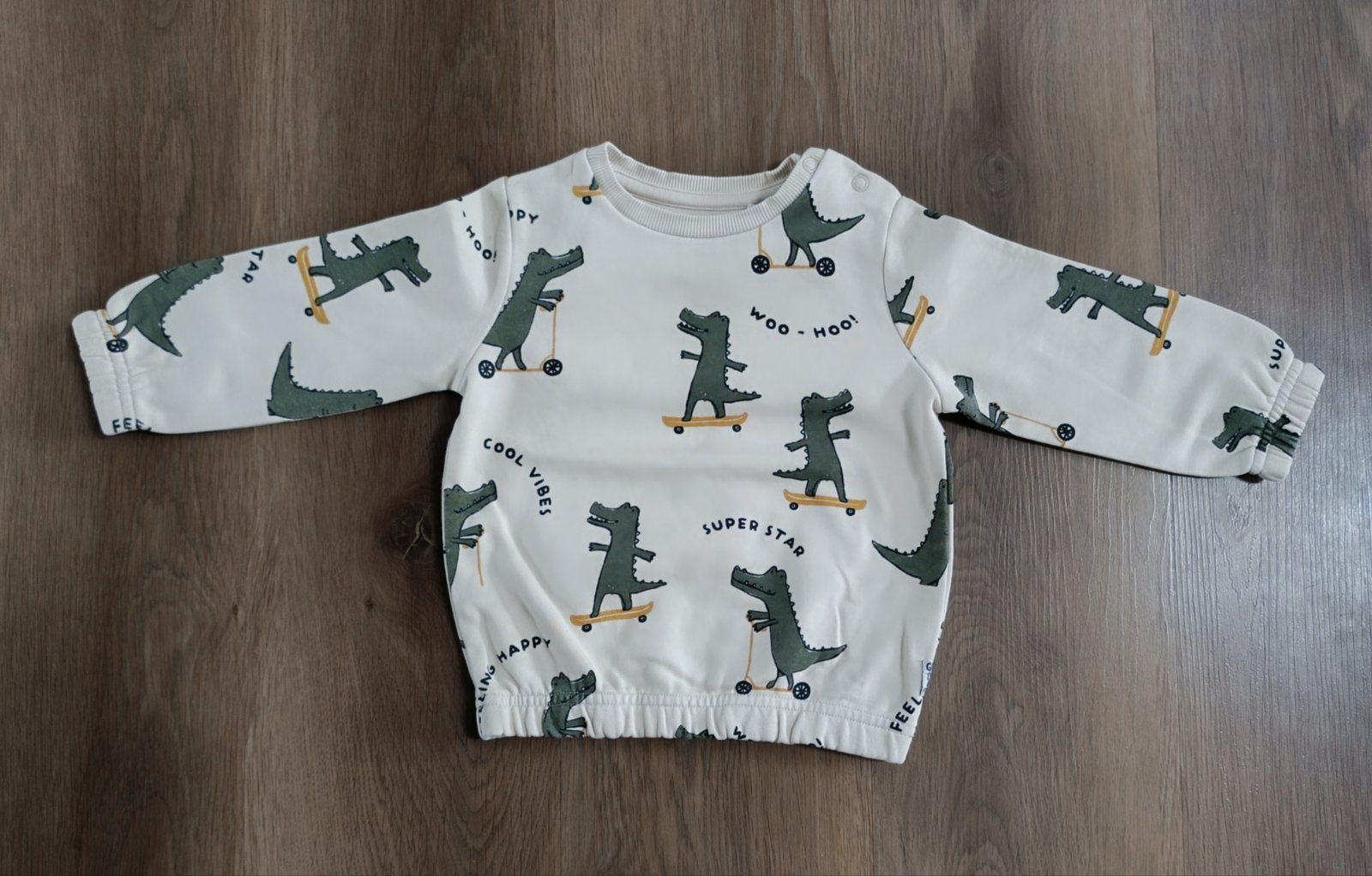 Na predaj už len mikina. Tričko má pri krku zapínanie na gombíky, dĺžka 31,5 cm, šírka 29 cm, rukáv od krku 33 cm, mikina dĺžka 33 cm, šírka 33 cm, rukáv od kapucne 33 cm.