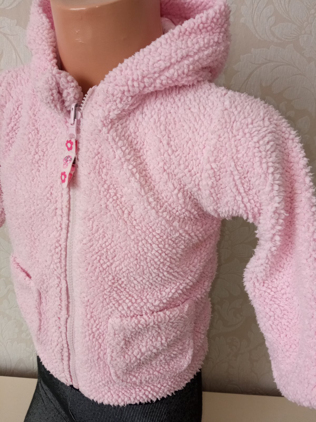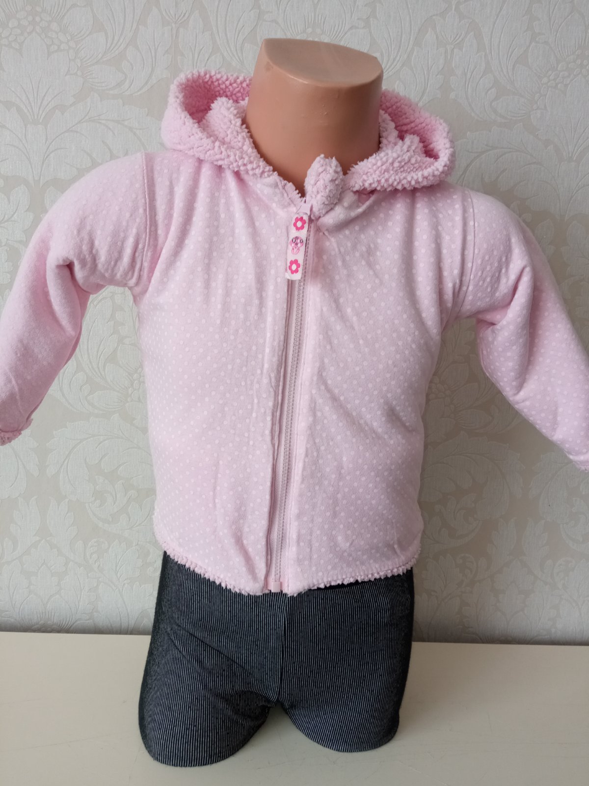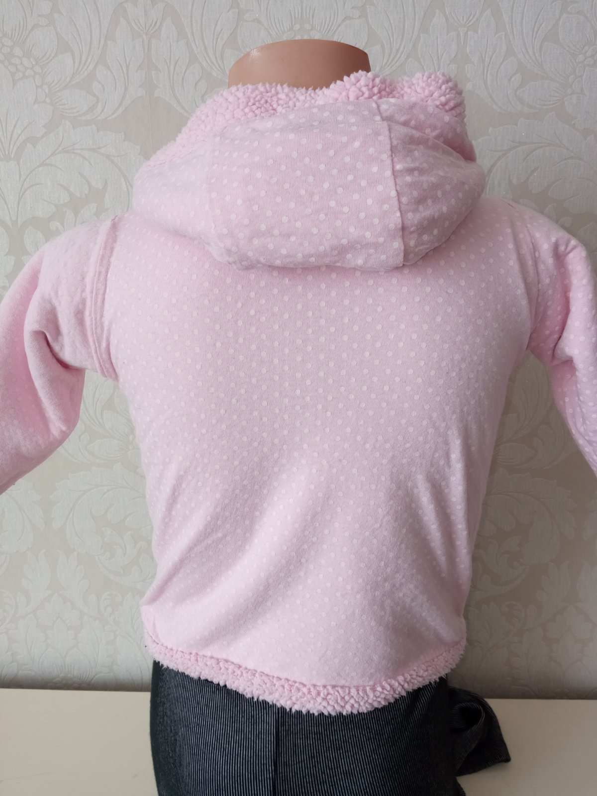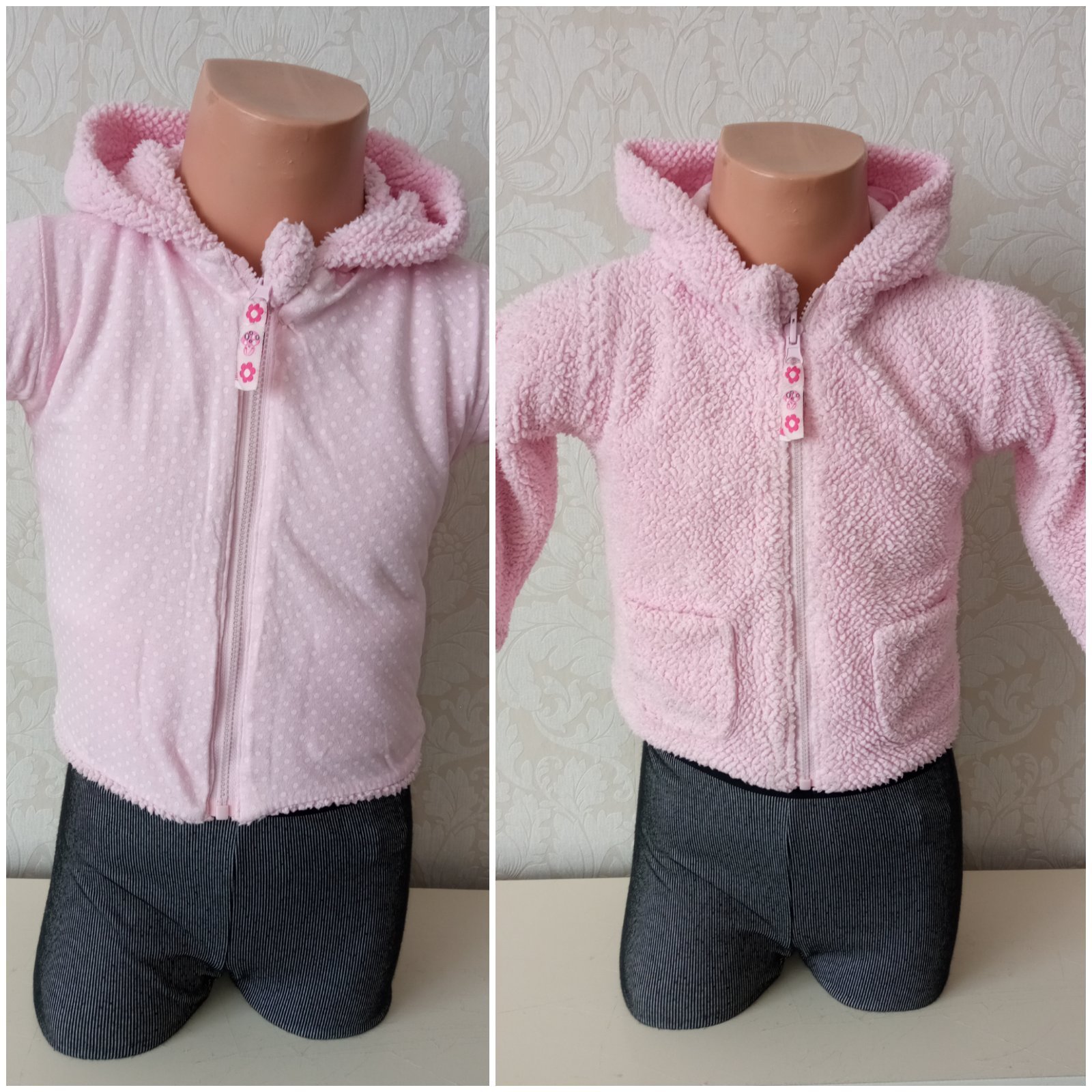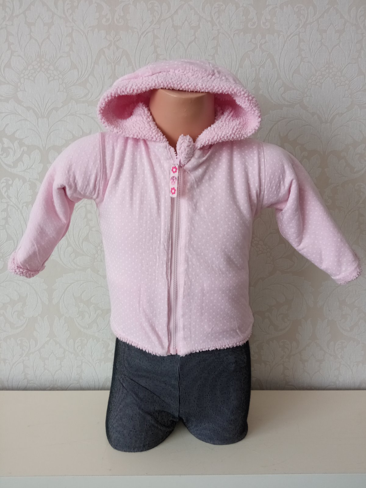Obojstranná,hrubšia jednofarebná a bodkovaná mikina.