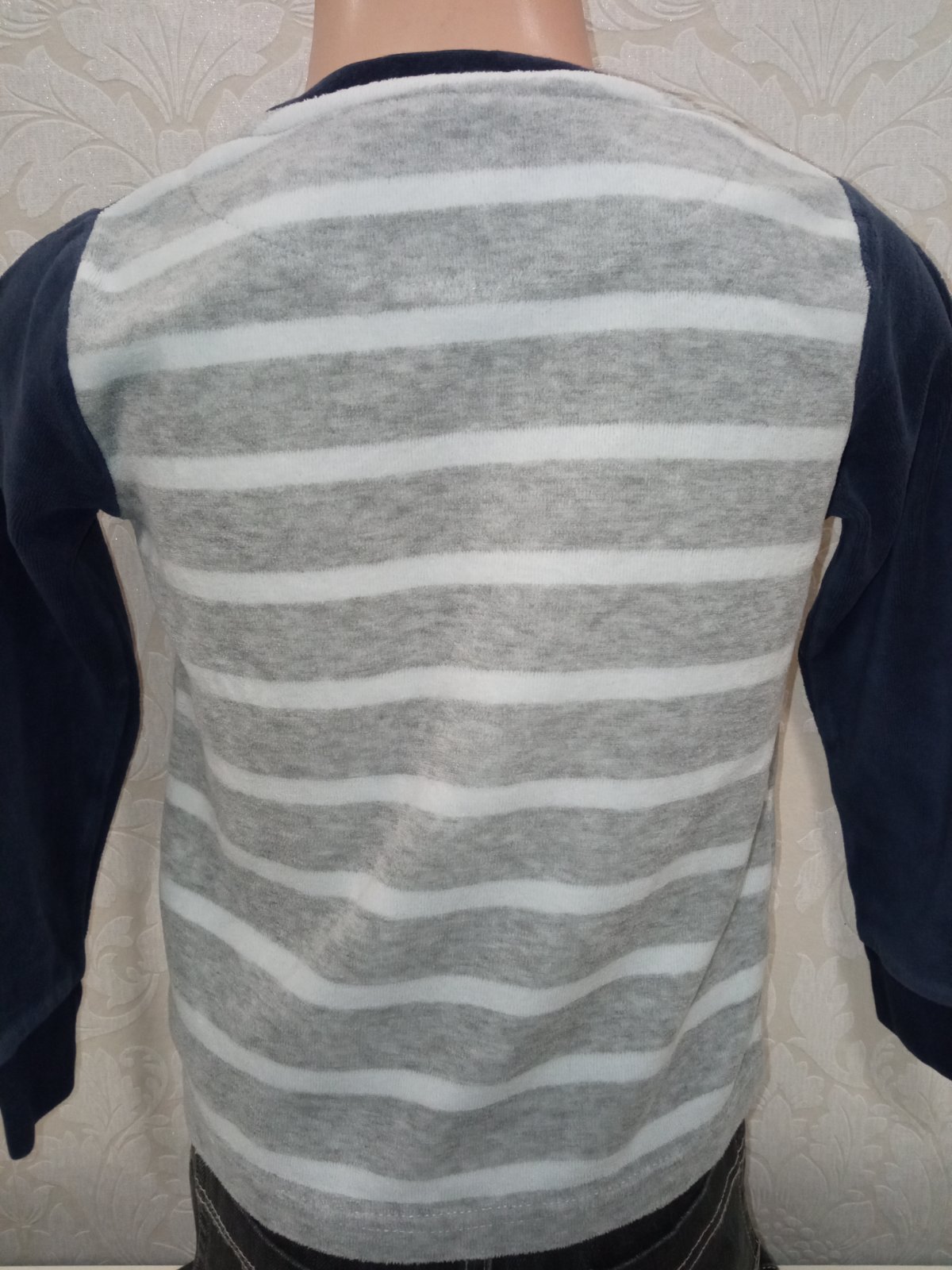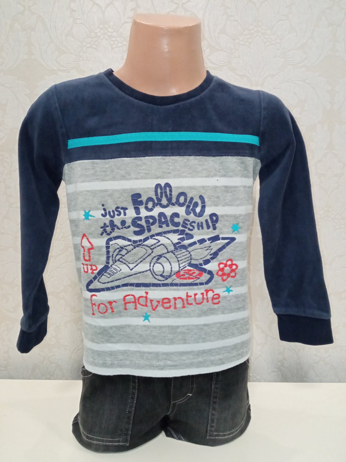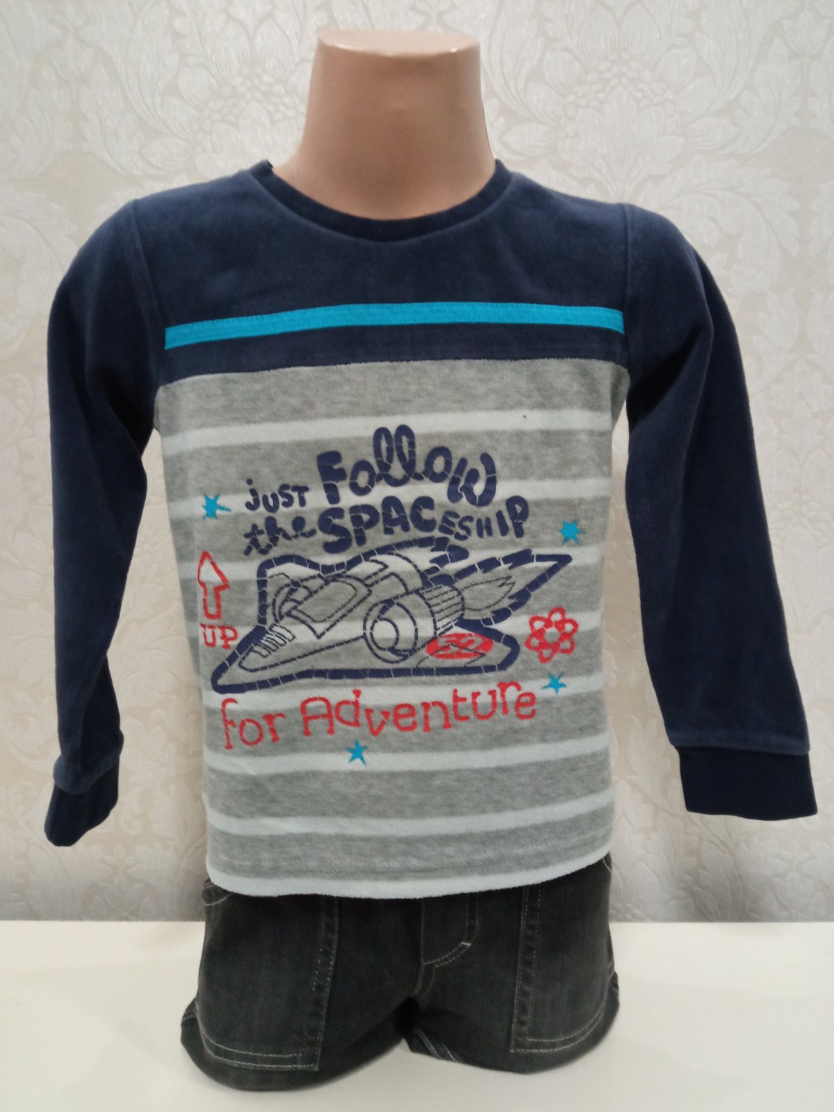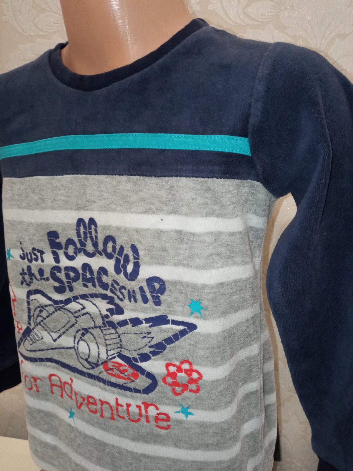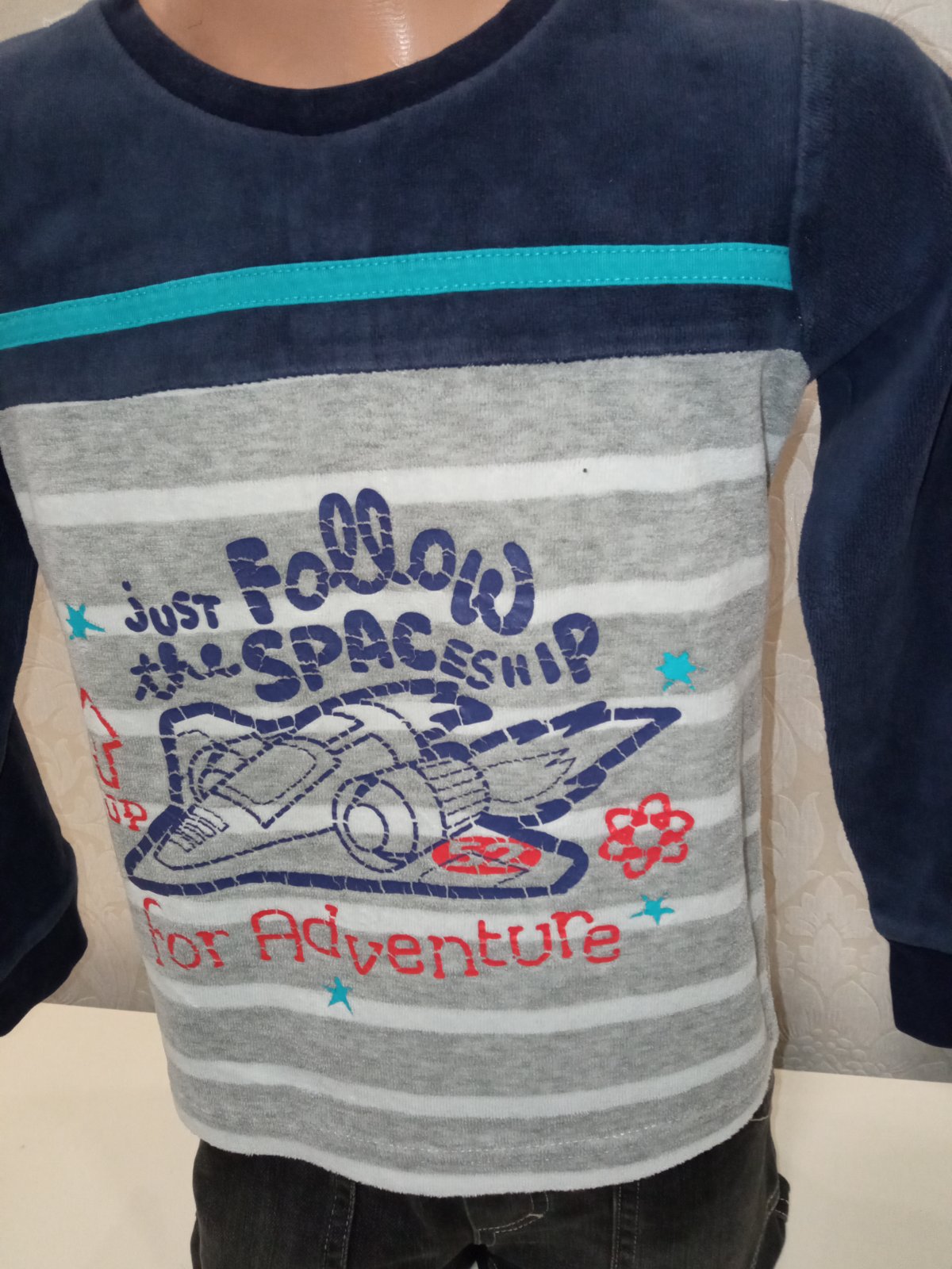 Chlapčenská tenká zamatová mikina s raketou a nápismi, okrúhly výstrih, jemne elastické, farba tmavomodro-sivo-modro-biela.