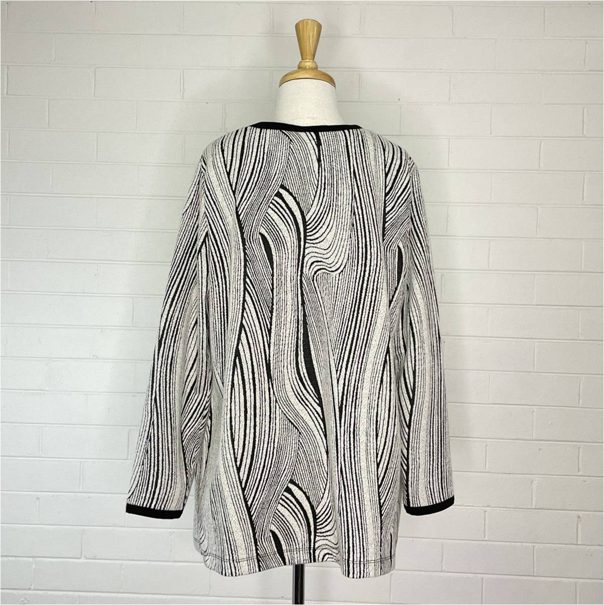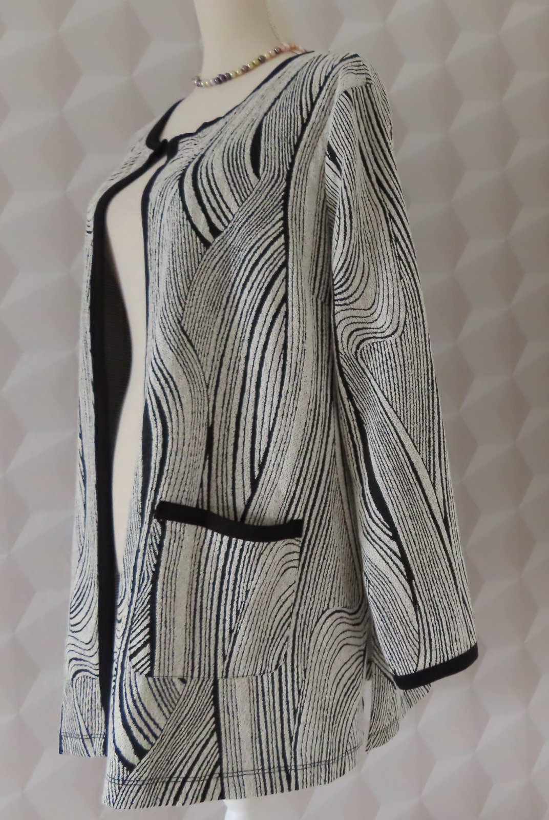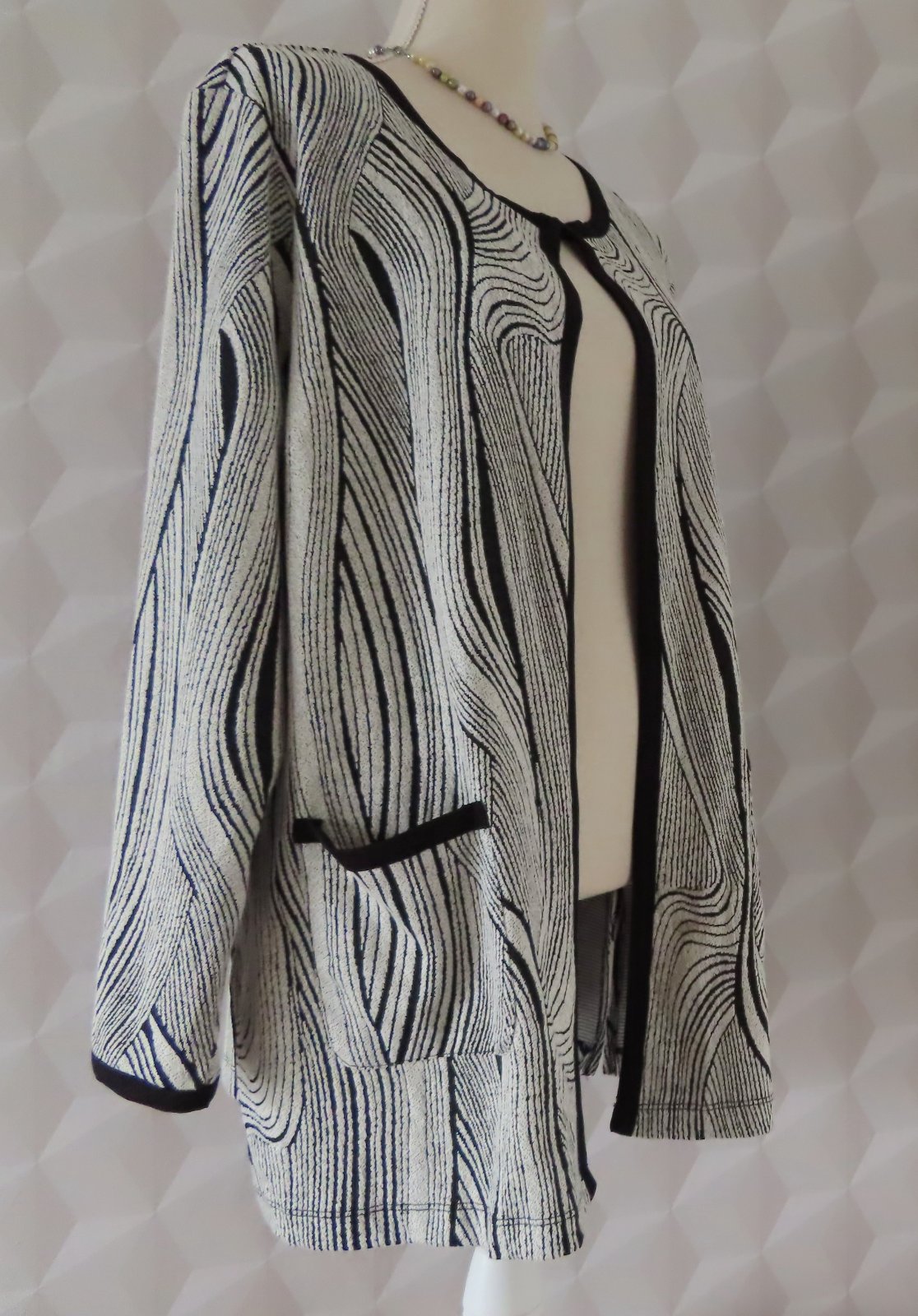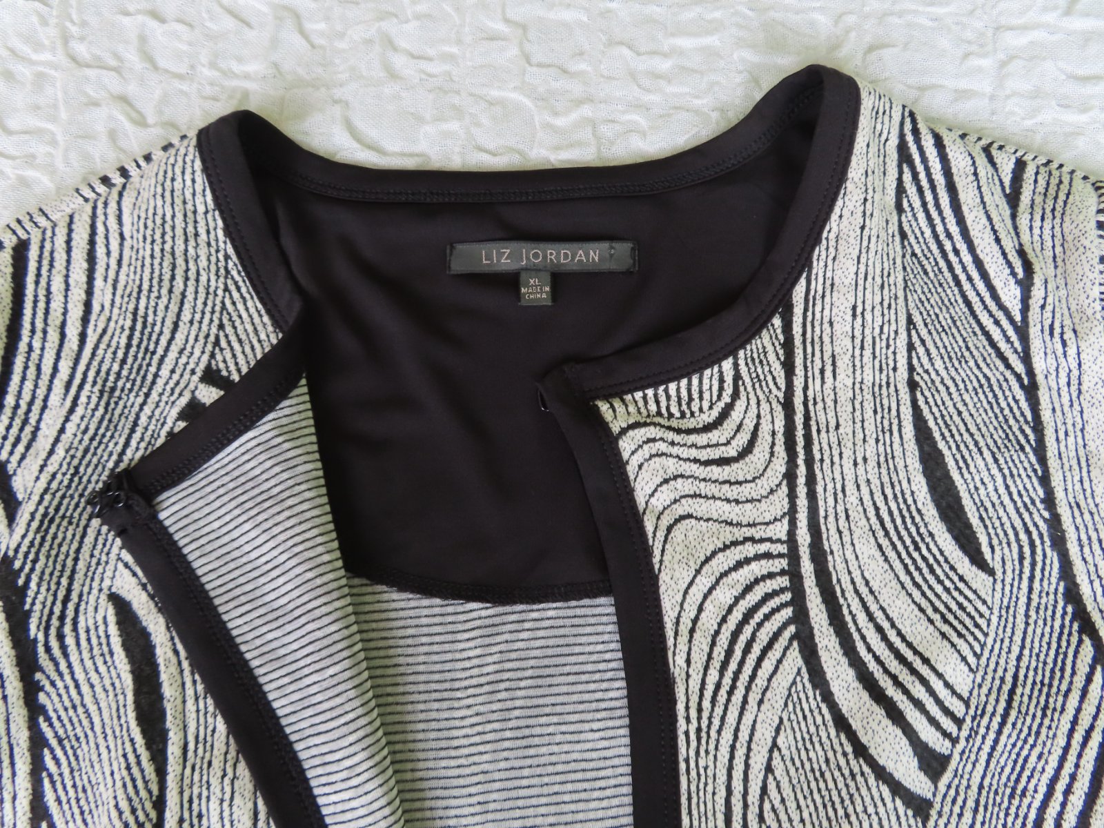 Čierno-biely kardigán zn. Liz Jordan so zapínaním na háčik, prednými vreckami a kontrastným lemom.