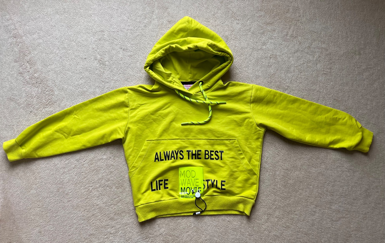 Žiaľ má fliačik na kapucni ale zo strany takže pri nosení nevidieť iba keď si to dať dieťa na hlavu.