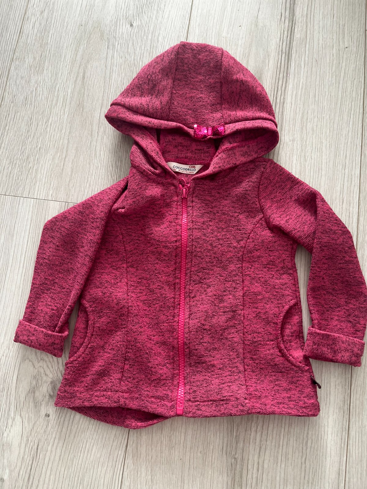 Predám tmavoružovú mikinu značky: Coccodrillo, veľkosť 92. Mikina sa zapína na zips a má kapucňu s mašličkou.
