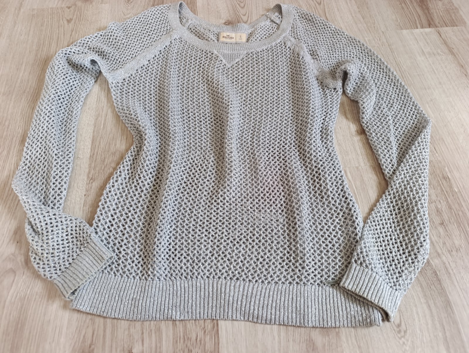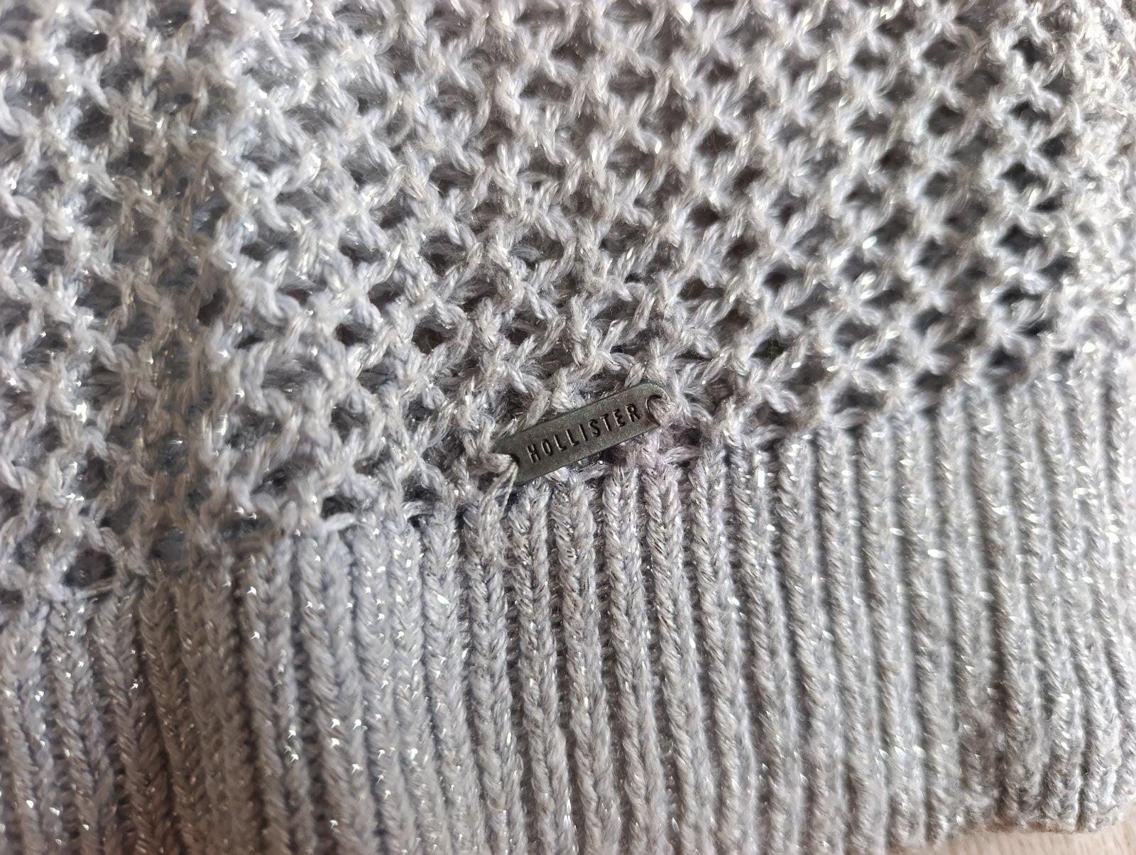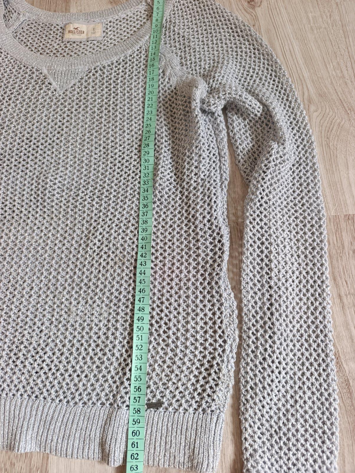 Pekný dierkovaný sveter, pretkavaný striebornou niťou, je elastický, príjemný na telo, naživo krajší. Vpredu zatiahnutie- viď posledná foto. Pri výmene 5€