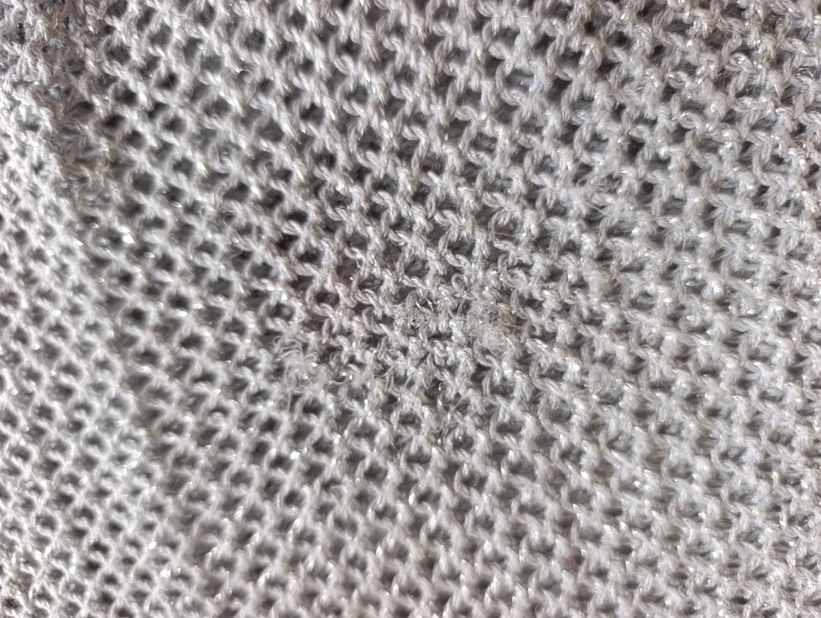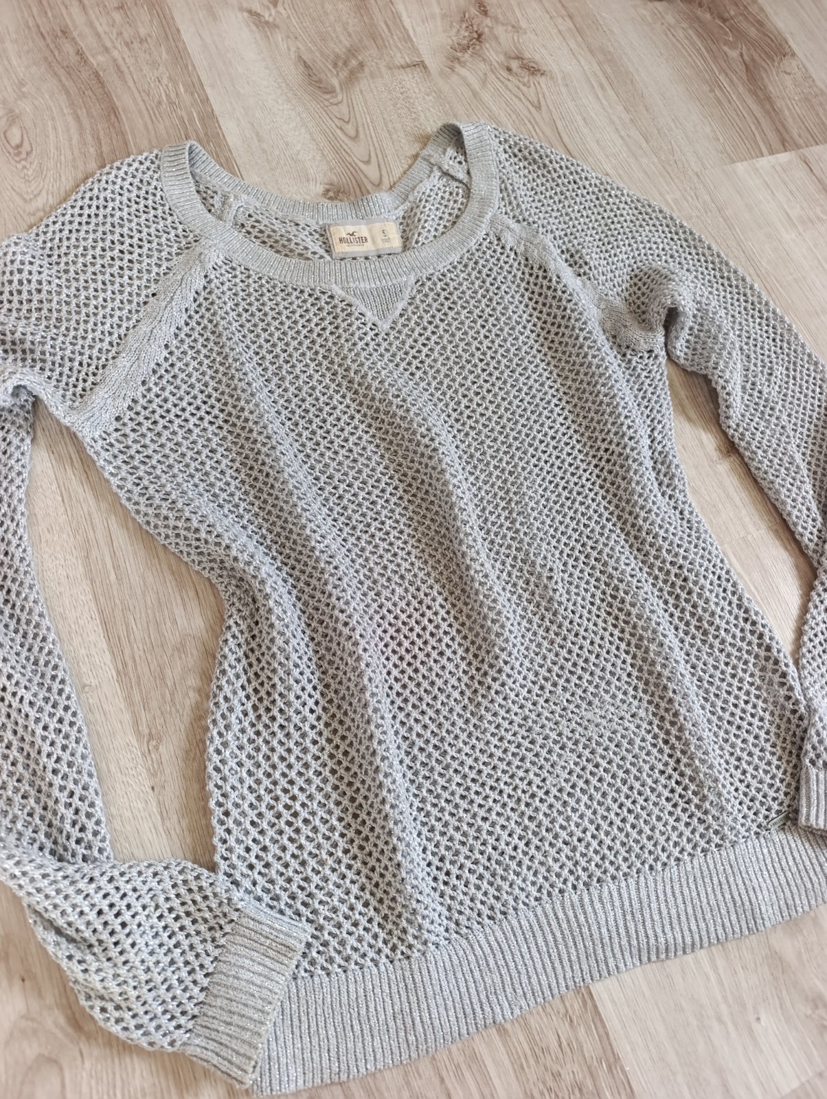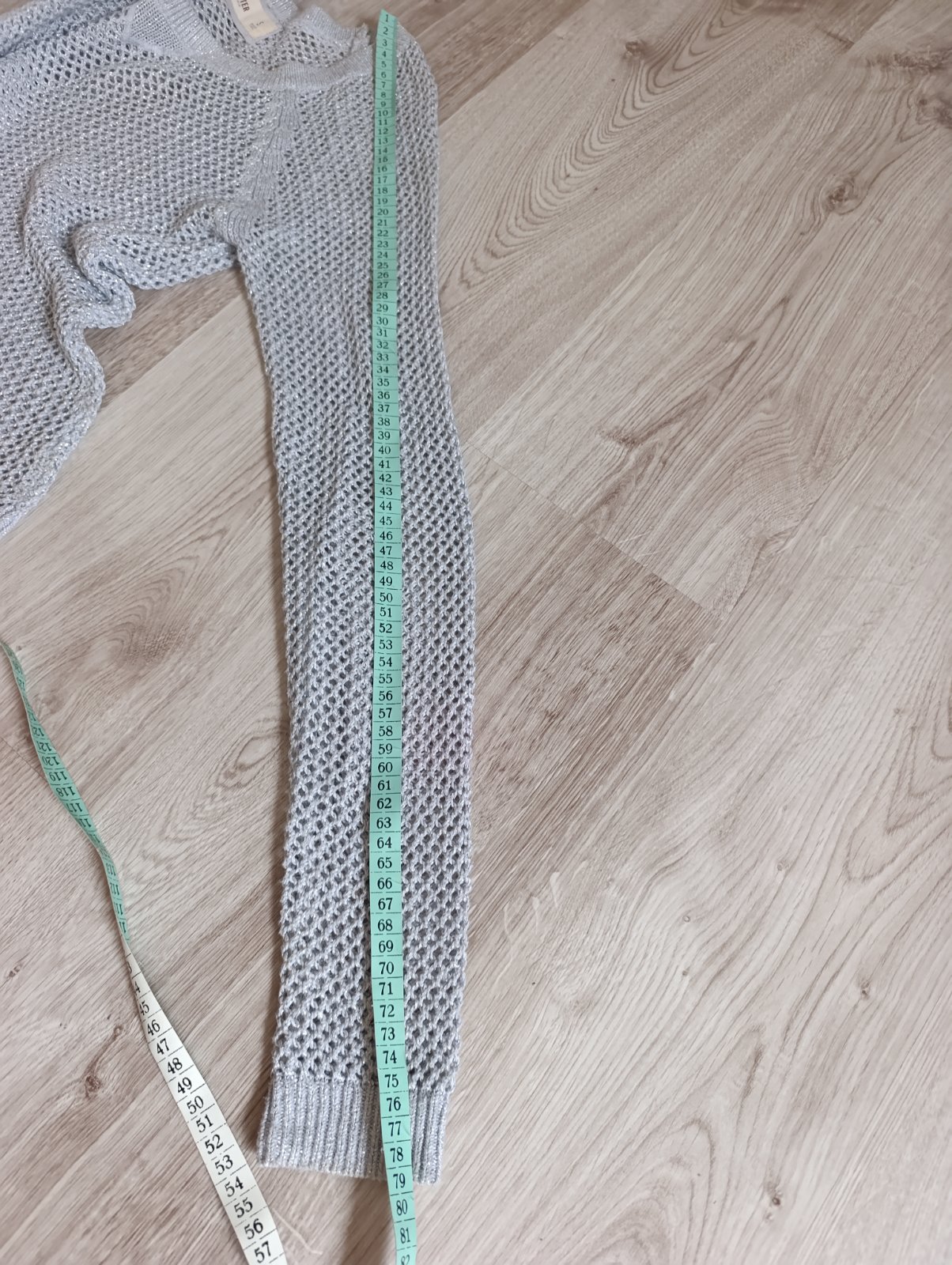 Pekný dierkovaný sveter, pretkavaný striebornou niťou, je elastický, príjemný na telo, naživo krajší. Vpredu zatiahnutie- viď posledná foto. Pri výmene 5€