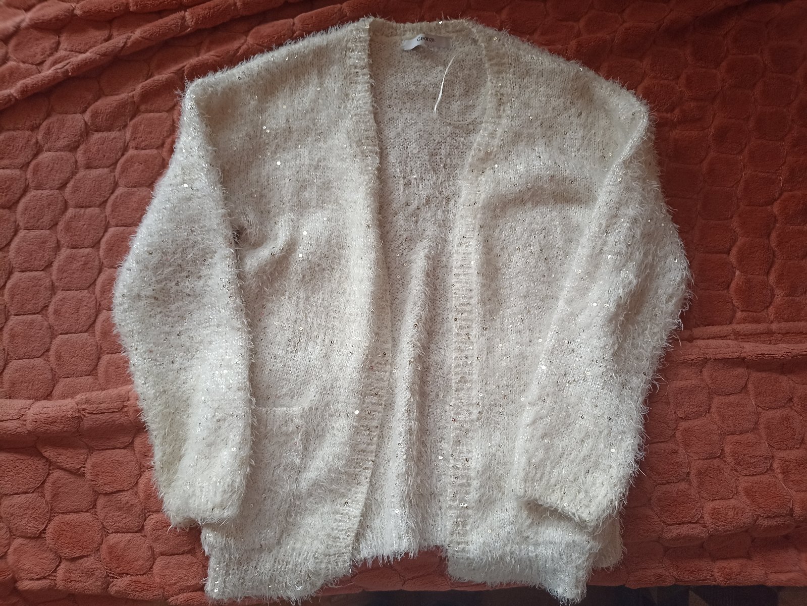 Predám dievčenský svetrík, jemný s trblietkami, nemá zapínanie, 2 vrecká, béžová-krémová farba, zachovalý, veľmi pekný. veľ. 140, miery: dĺžka 50cm., rukáv od krku 55cm., od pleca 39cm., cena 6,-€ spolu s poštovným