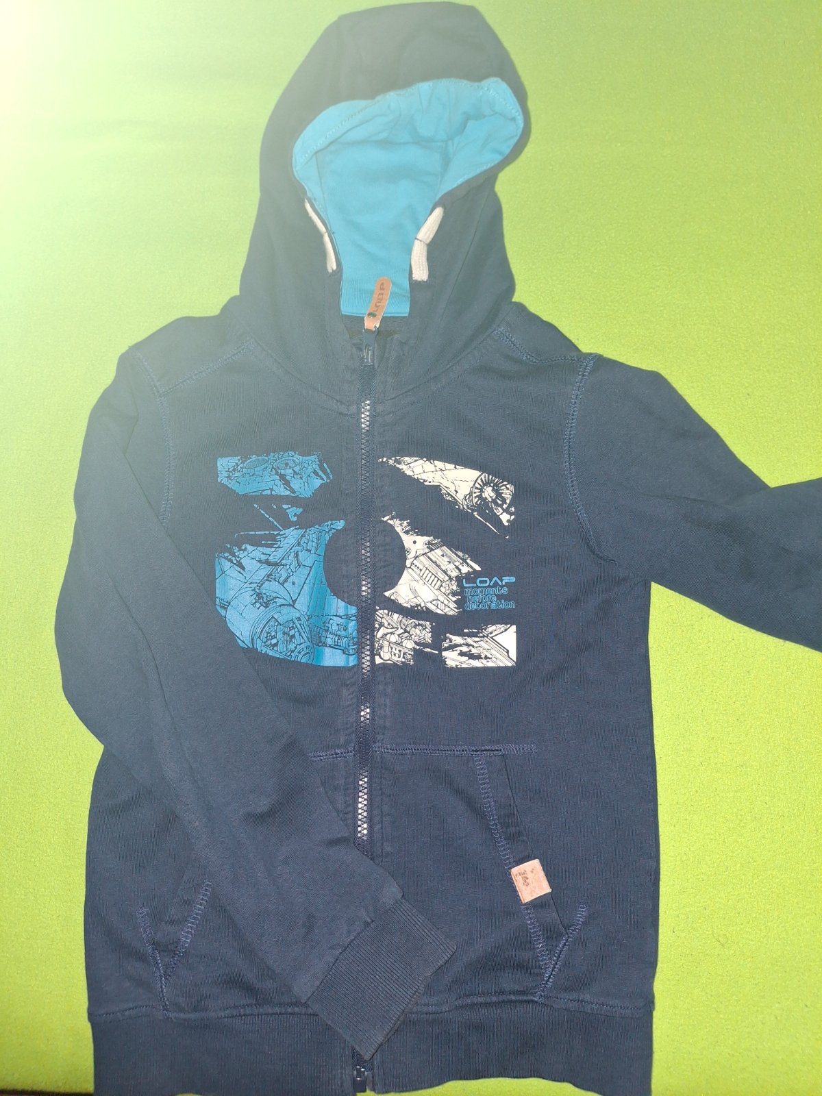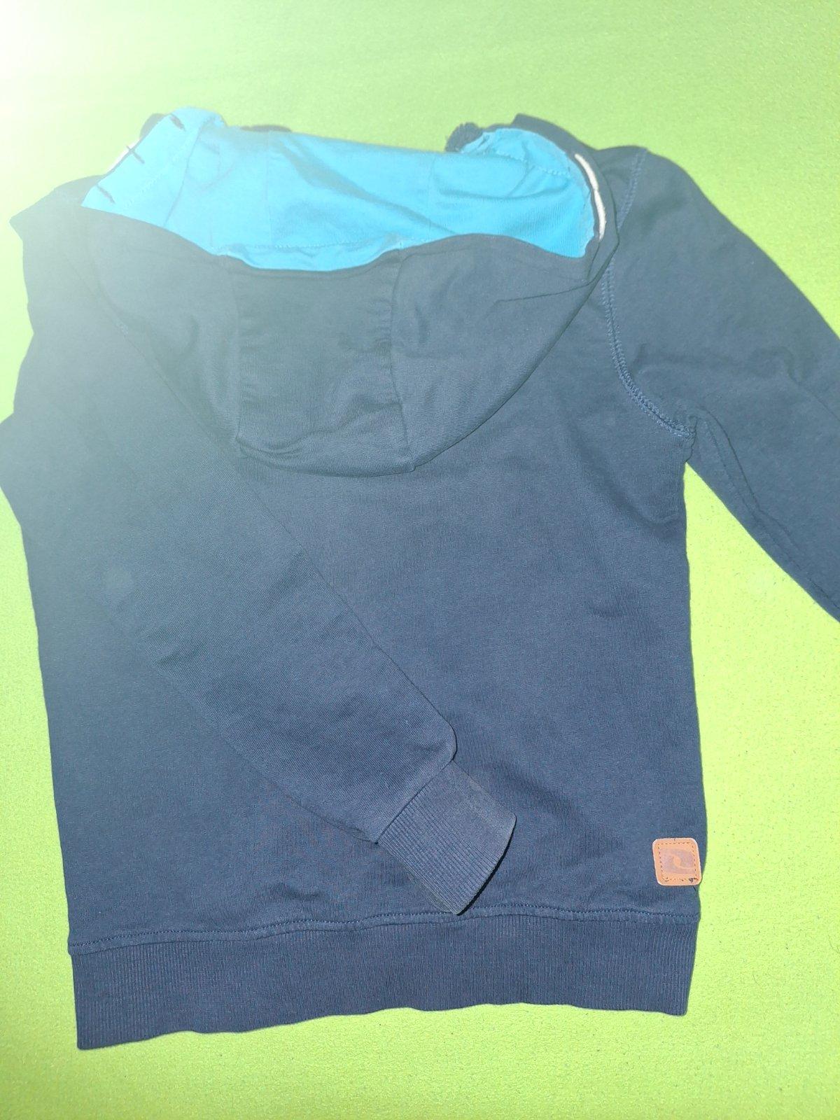 Predam peknu mikinu 122/128. Nosený, no dobrý stav. Mierne, naozaj mierne vyblednutá farba (zohladnene v cene). Kvalitny zips, lahko sa oblirka.
