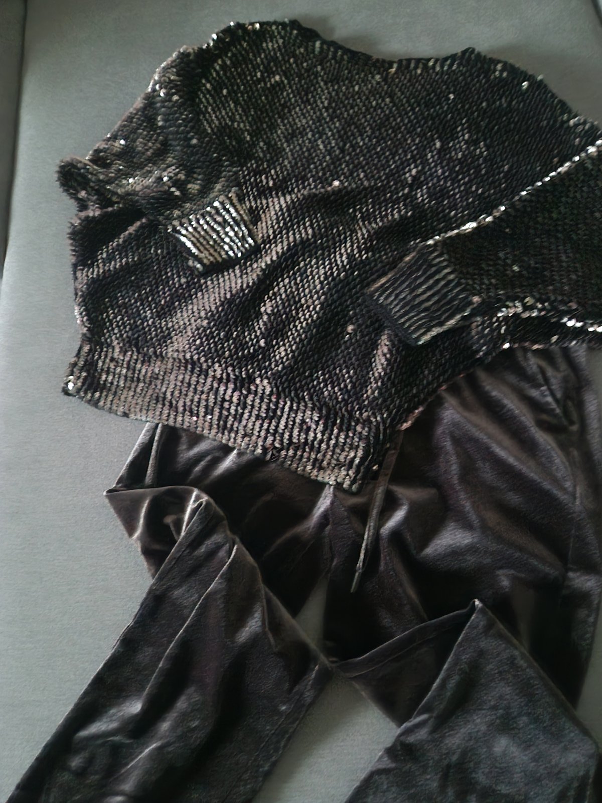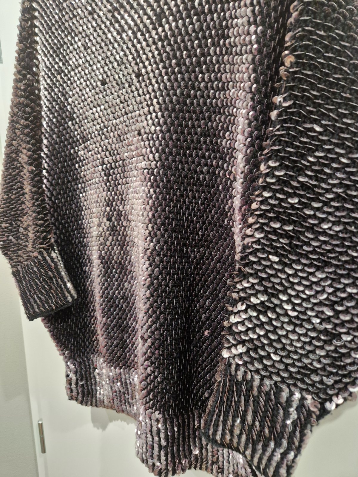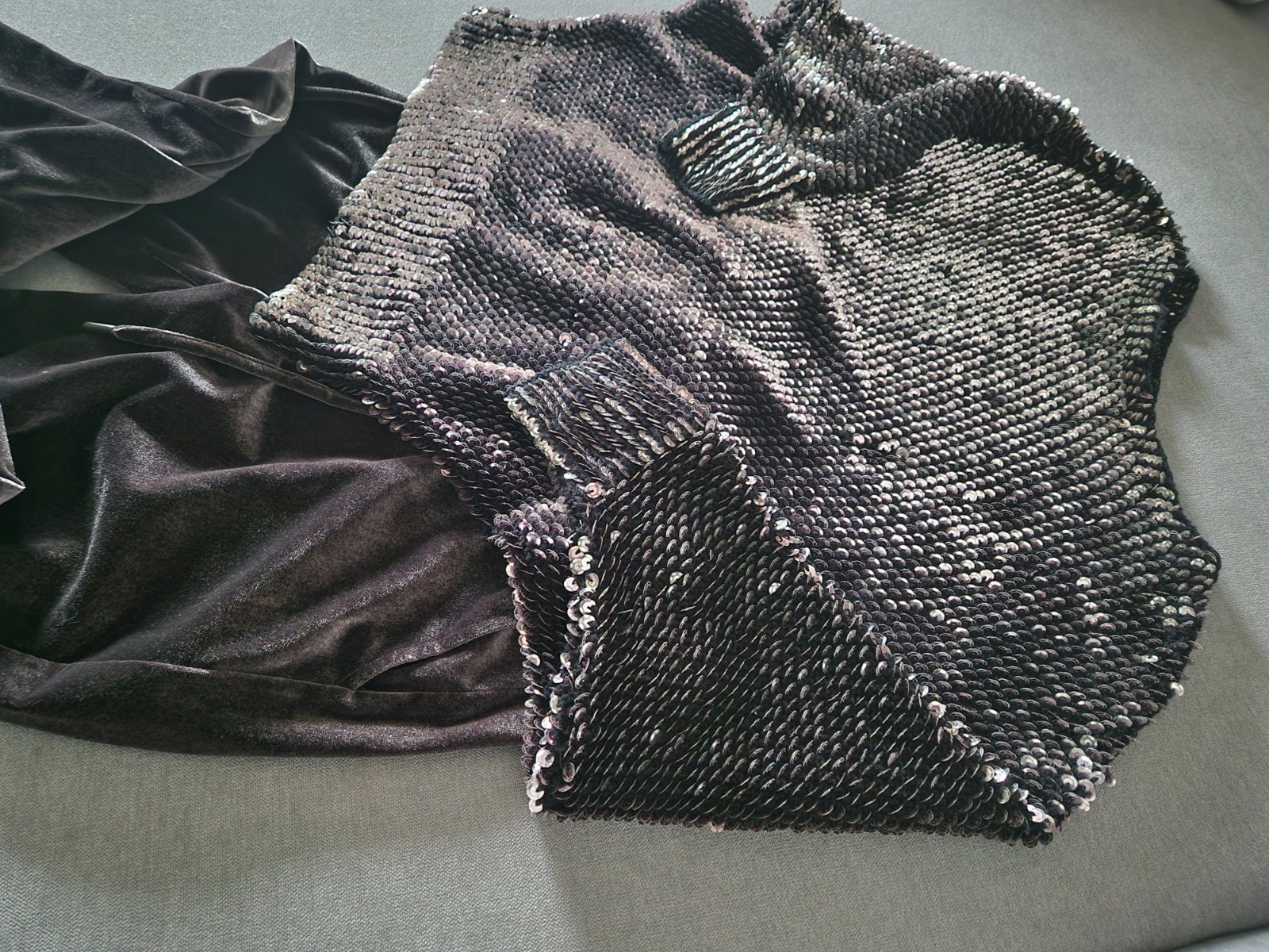 Flitrovaný dámsky svetrík, ideálny na príležitosť aj bežné nosenie. Pekne ladí k velúrovým nohaviciam (mám v ponuke v ďalšom inzeráte). Pružná pletenina, lodičkový výstrih, 3/4 rukáv,voľný strih(zakryje,čo treba). Farba tmavohnedá-medená, veľkosť uvádzam M-L, miery: dĺžka 62cm, rukáv od výstrihu 55cm. Klikni na profil, viac inzerátov v ponuke. Inzerát je aktuálny do zmazania.