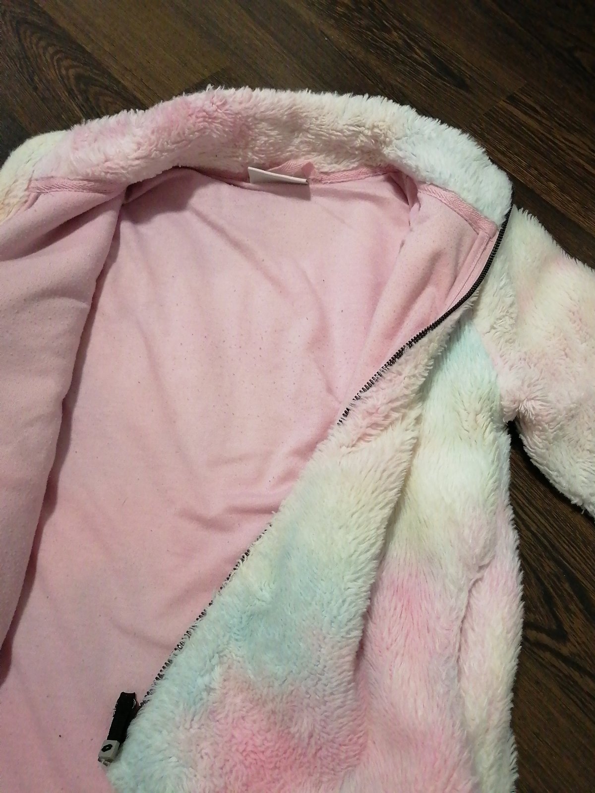 Krásna dievčenská huňatá mikina, pastelové farby, dve vrecká. Na lakťoch trochu vidno, že bola nosená. Veľkosť 152-158