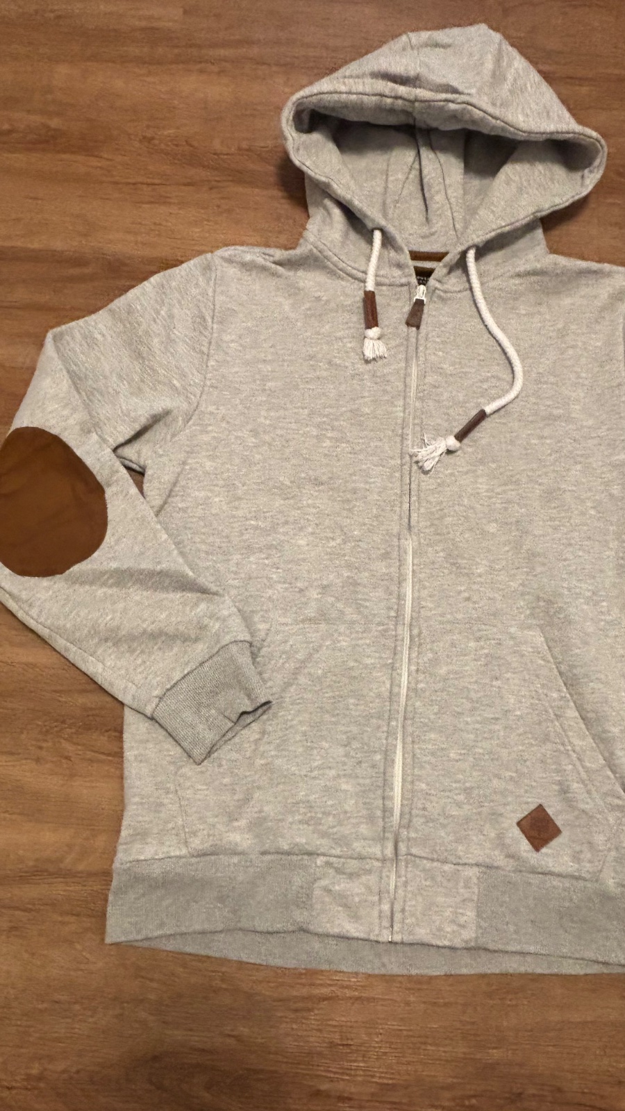 Párkrát oblečená pánska mikiny House s kapucňou, veľkosť L. Kombinácia modrošedej a tehlovej farby, vzadu je celá modrošedá. Vpredu vrecko, šírka prsia 114 cm, dĺžka 70 cm.