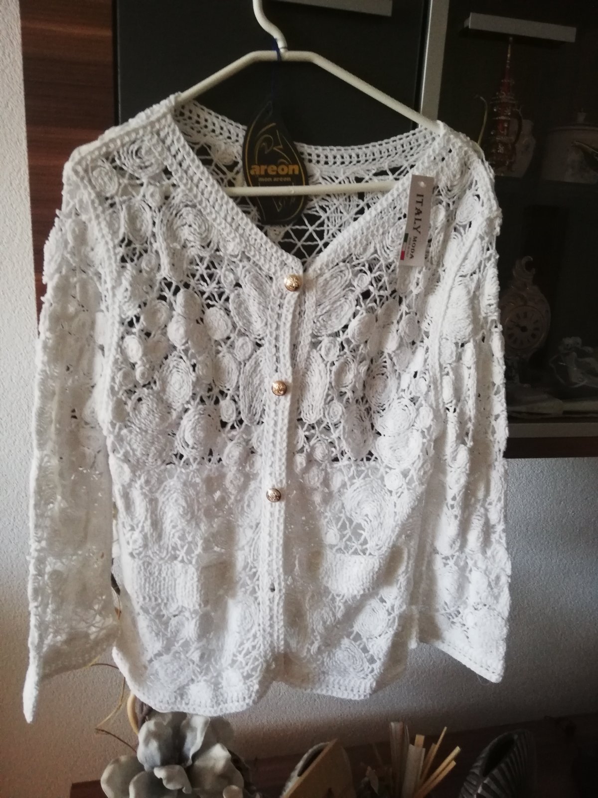 Nový háčkovany svetrík, vrecká ozdobné, na gombíky, hrudník 90azv100 cm je poddsjny