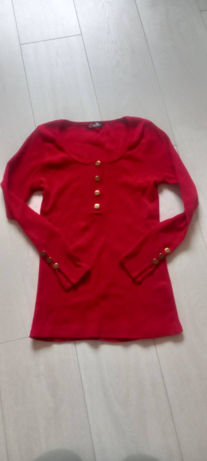 Pekný tmavočervený, až bordový svetrík s tromi veľkými gombíkmi, mierne do písmena A, EUR písaná 42, ale sadne skôr na M, riaďte sa mierami.
