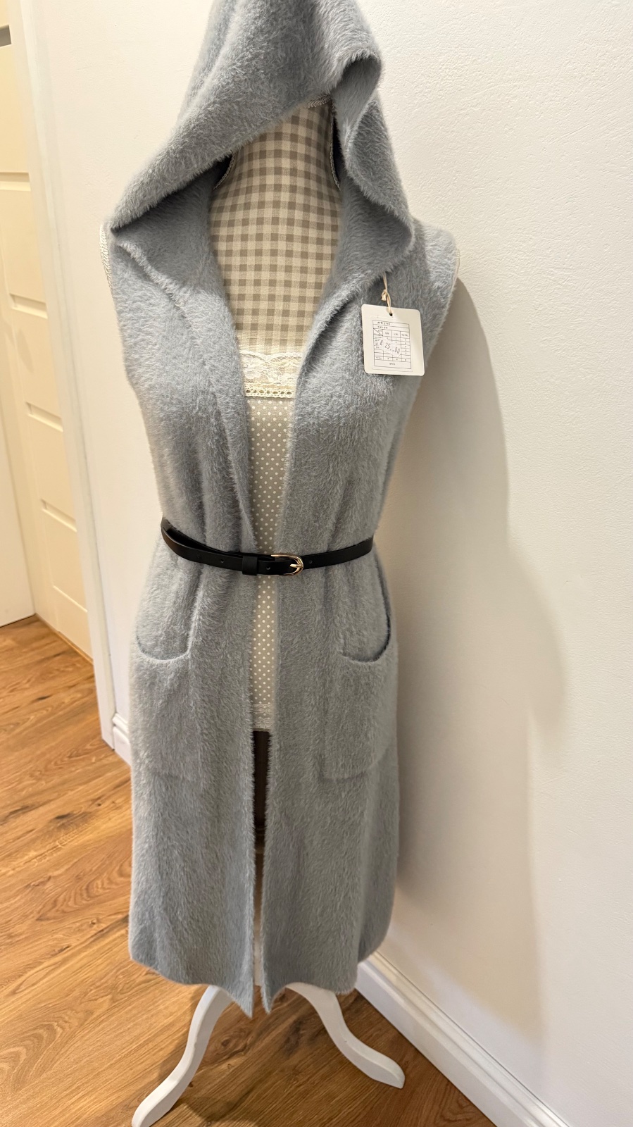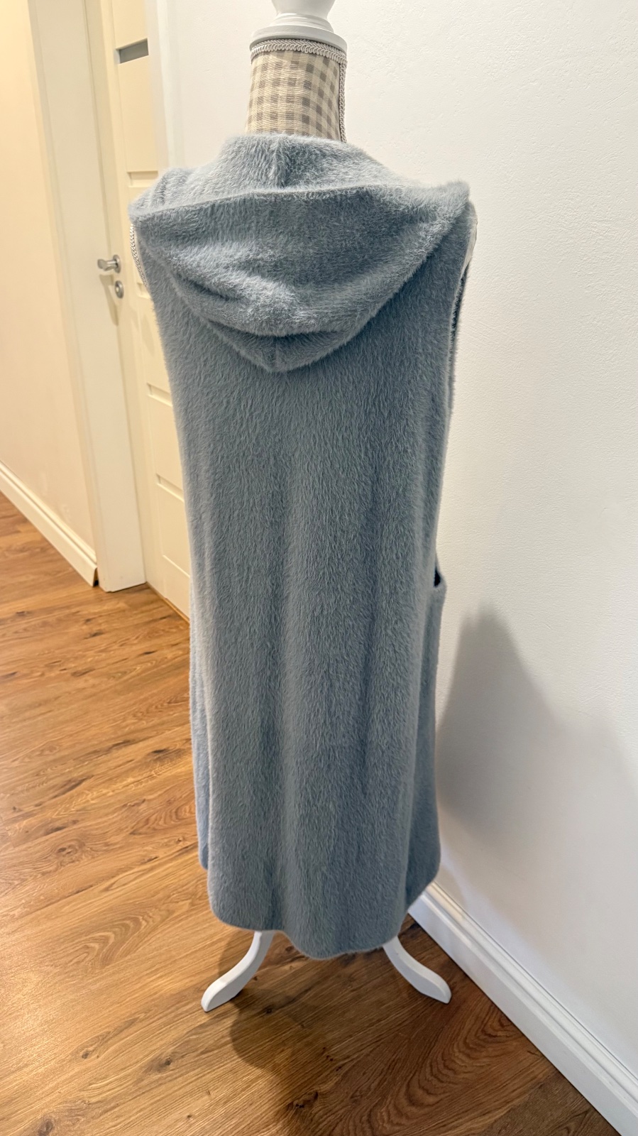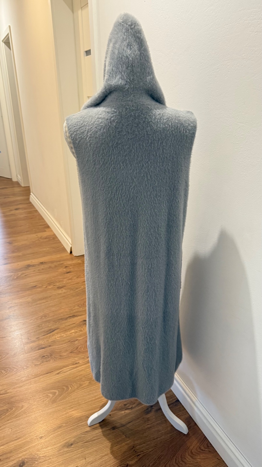 Dlhá, huňatá vesta s kapucňou a vreckami, veľkosť S/M, bez opasku