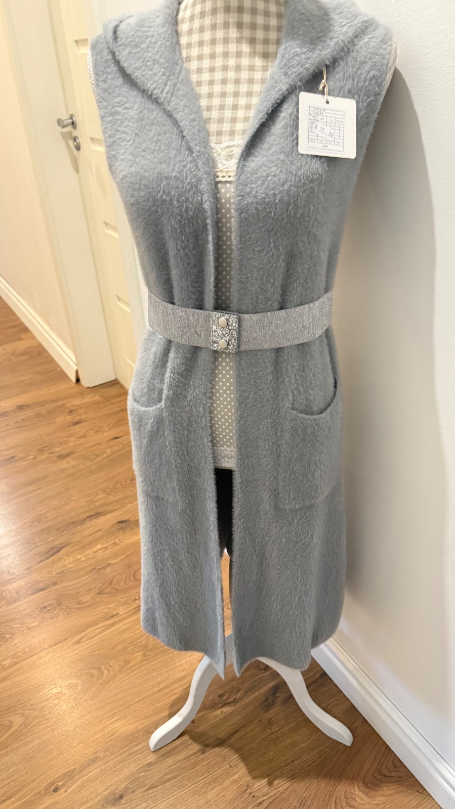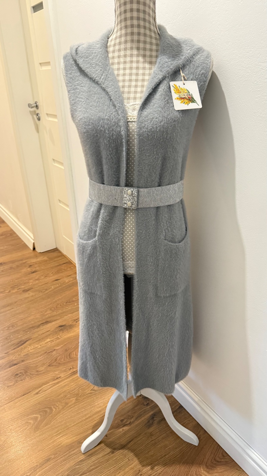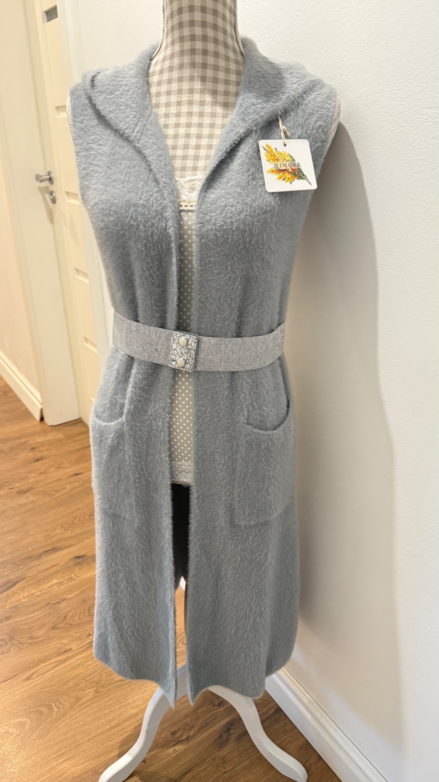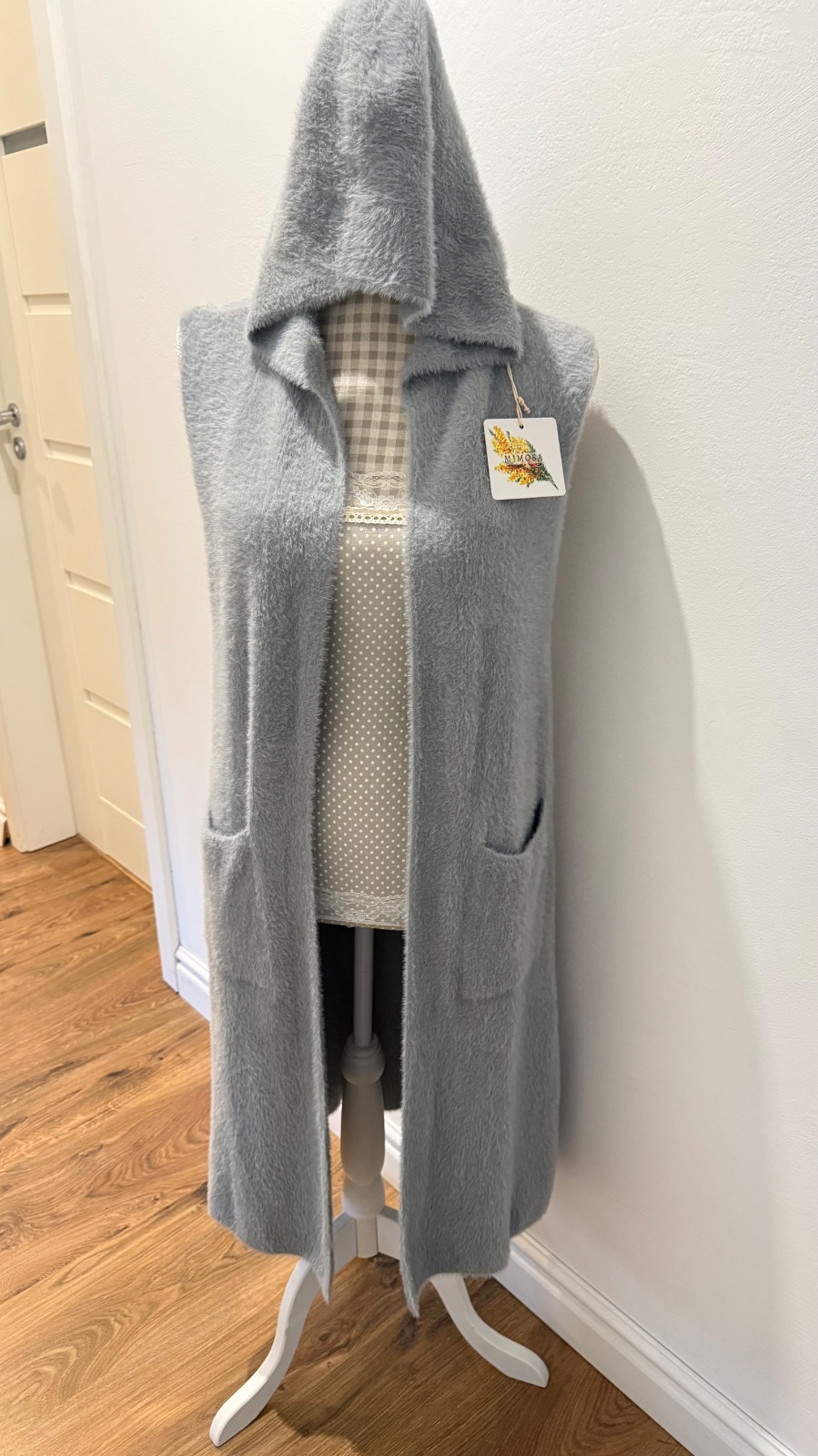Dlhá, huňatá vesta s kapucňou a vreckami, veľkosť S/M, bez opasku