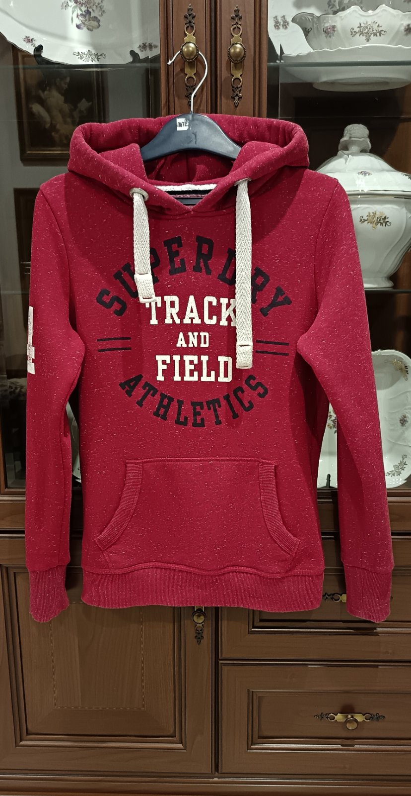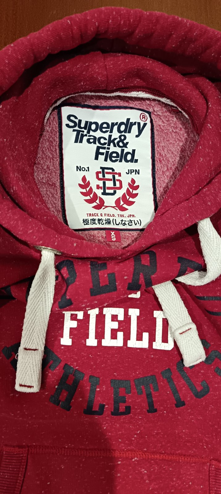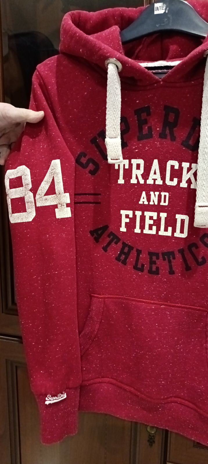 Značková mikina krásnej jasnočervenej farby s bielym melírom, kvalitná, hrubá, teplá, 35% bavlna, 65% polyester, super stav, bez žmolkov, logo mierne ošúchané praním, zohľadnené v cene.