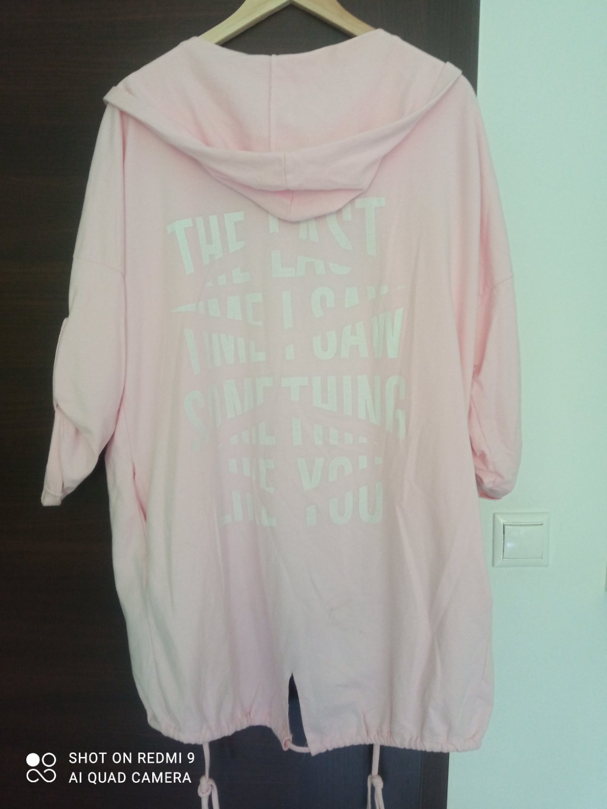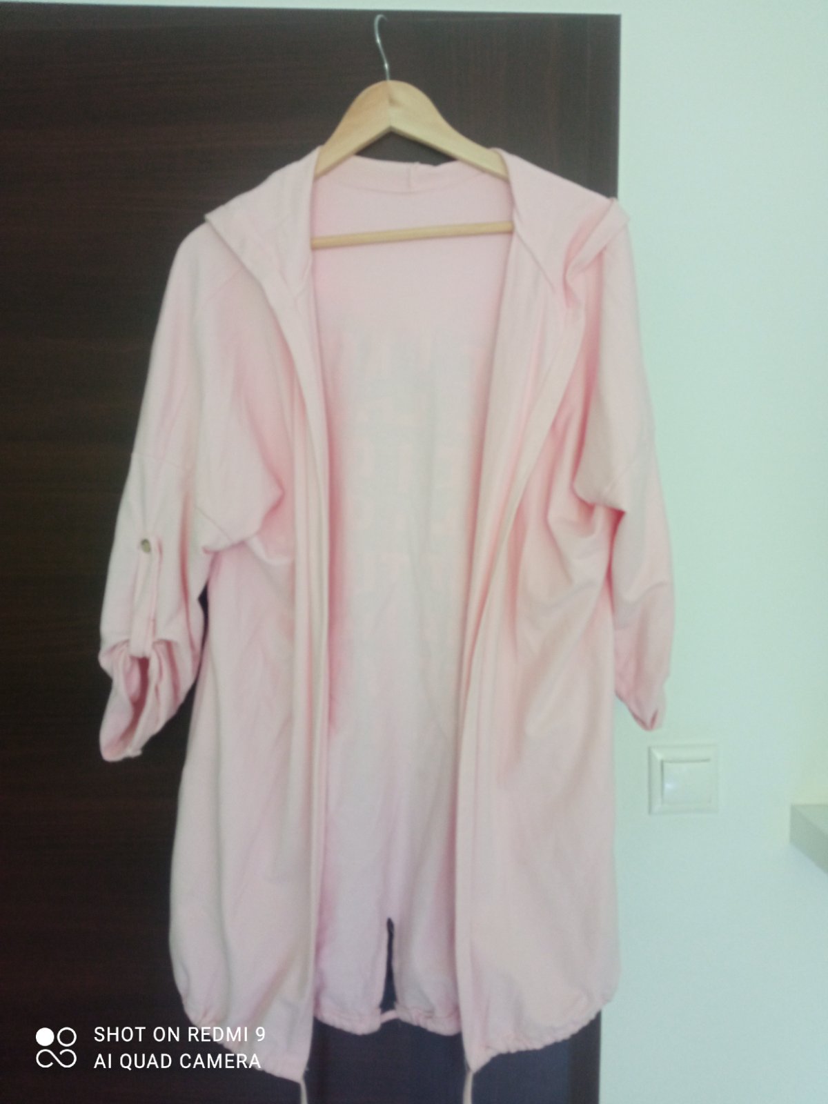 Krásny kardigan s kapucňou univerzálnej veľkosti bledoruzovej farby. Bez zapínania. Rukávy sa dajú vyhrnúť a zopnut. Má dve vrecká.