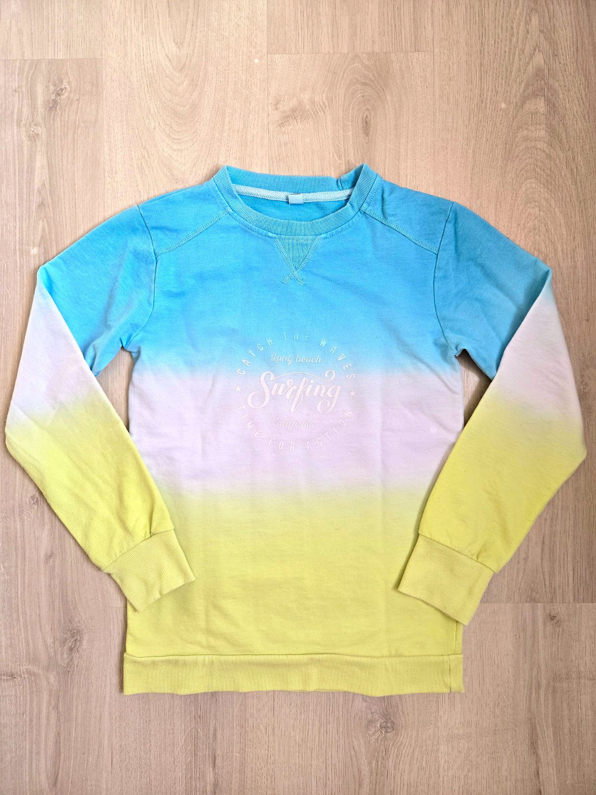 Táto krásna mikina je vo výbornom stave, je to taký svieži kúsok, veľmi pekný a moderný. Je v 100% stave a je to 100% bavlna. Určite odporúčam. Velkostne sedí od 152 do 158. Rozmer: dl.60cm, šírka 2x41cm, rukáv 55cm.