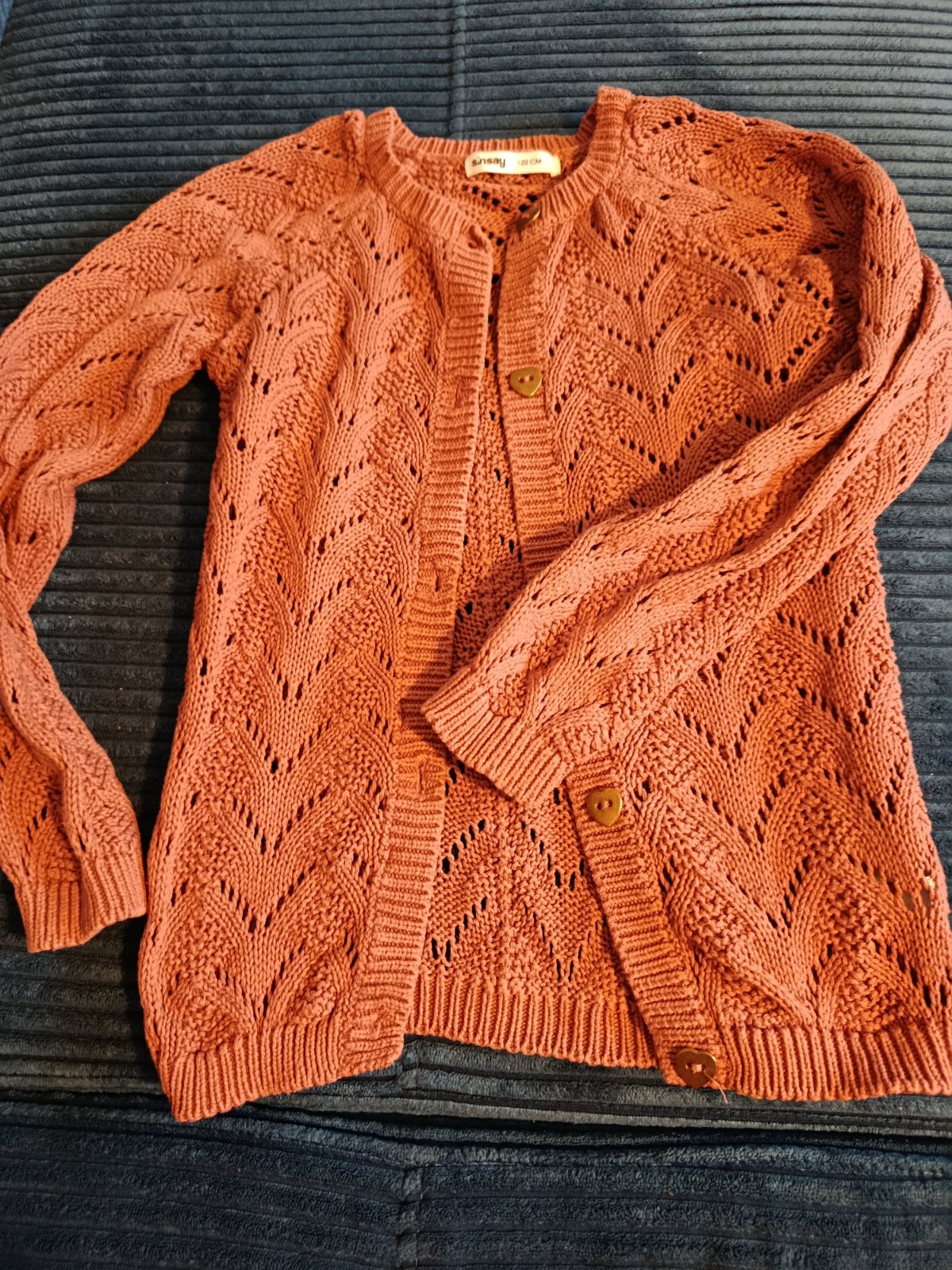 Farba taka skoro staro-červena zemita. Super stav, bez vady. Velkost 6-8rokov D 39 cm Obvod 35 cm Rukav od krku 50 cm