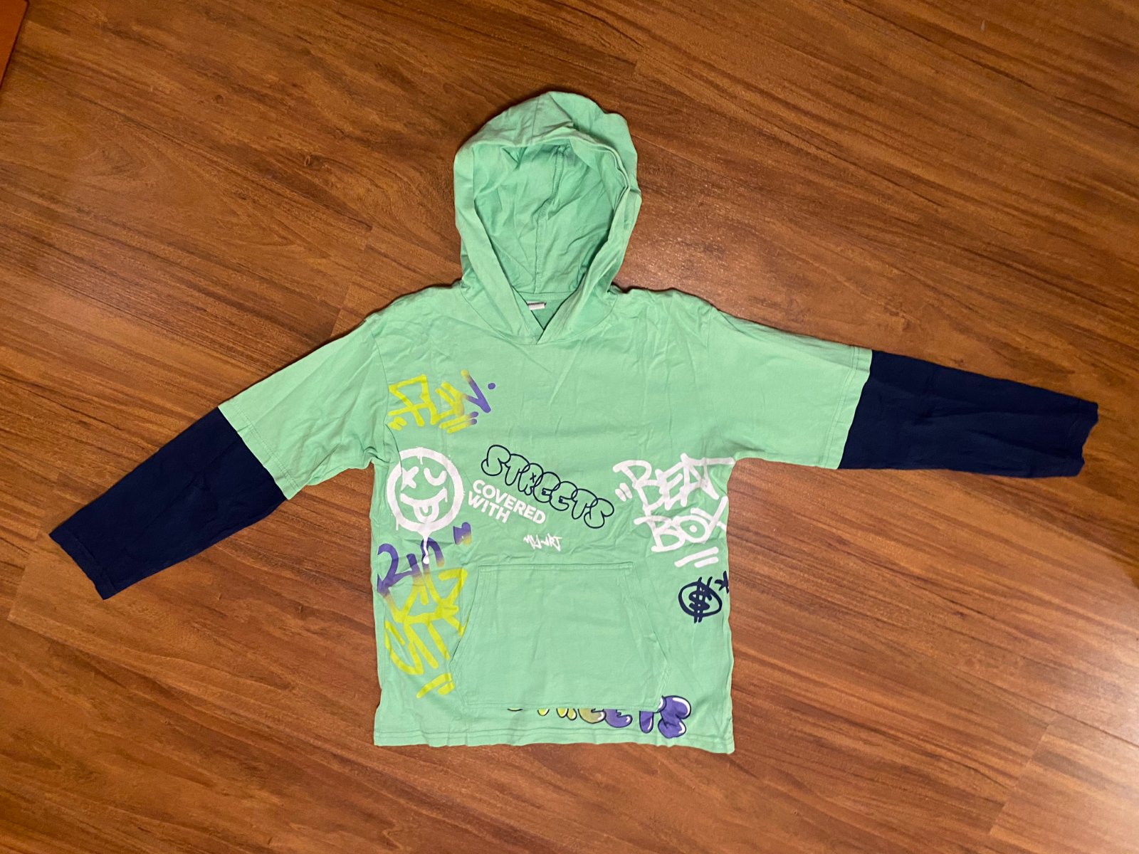 Zelené tričko s dlhým modrým rukávom a s kapucňou, veľ. na 10-11 rokov, 140-146 cm