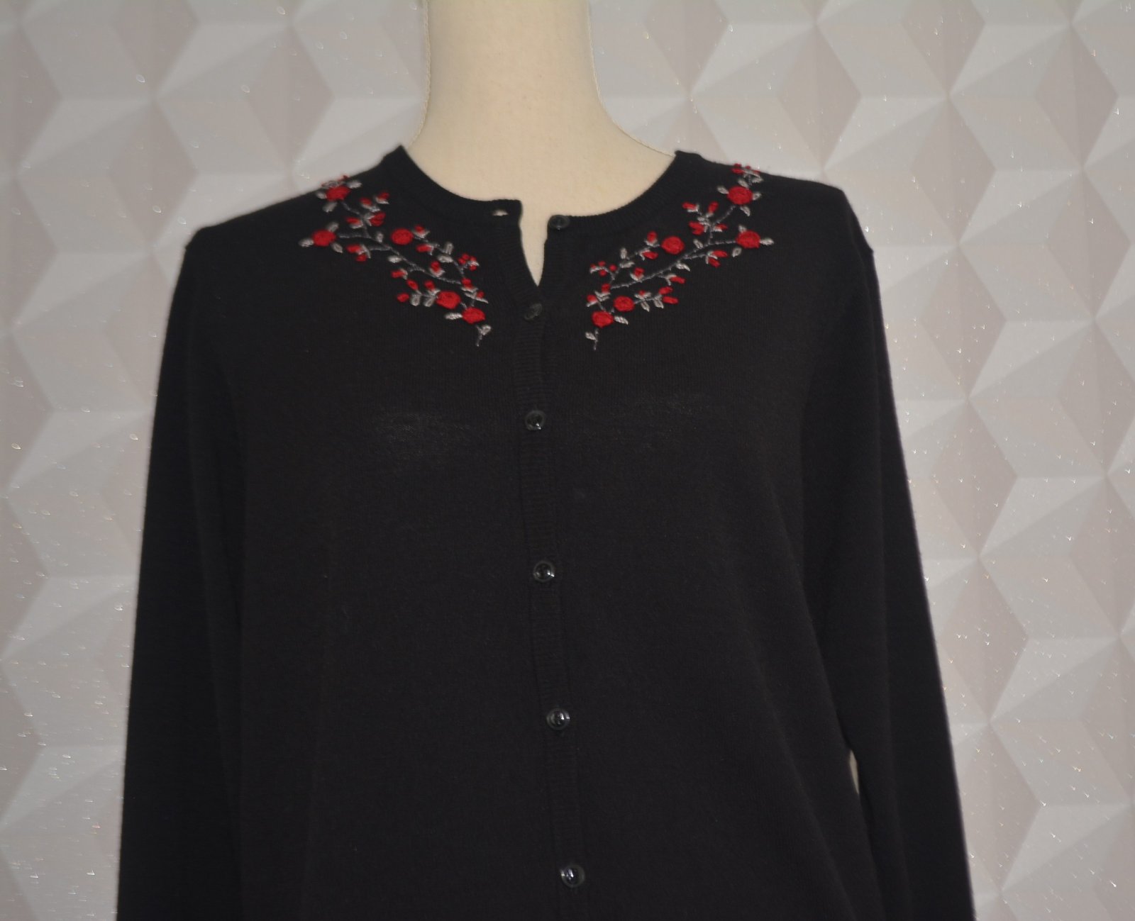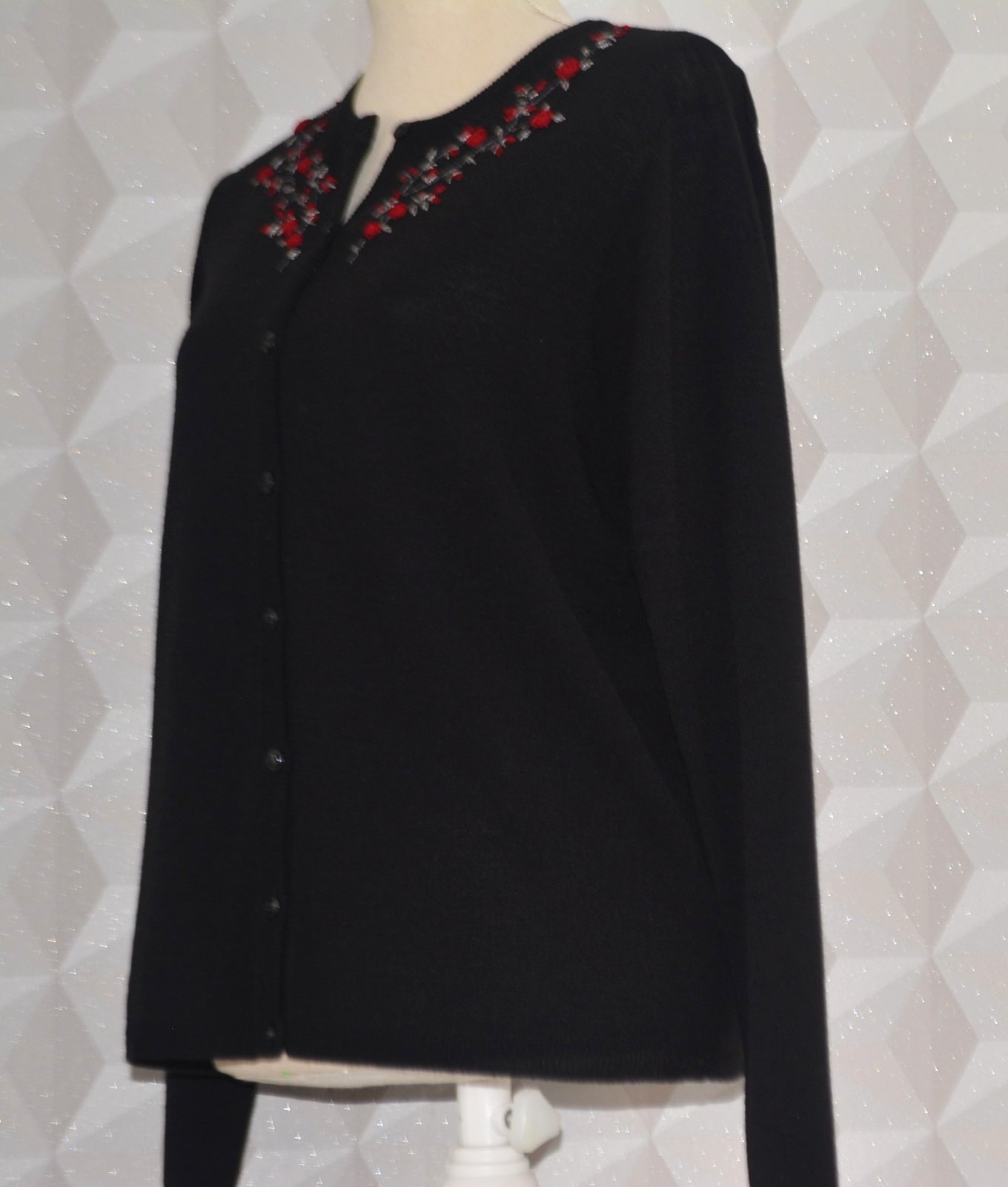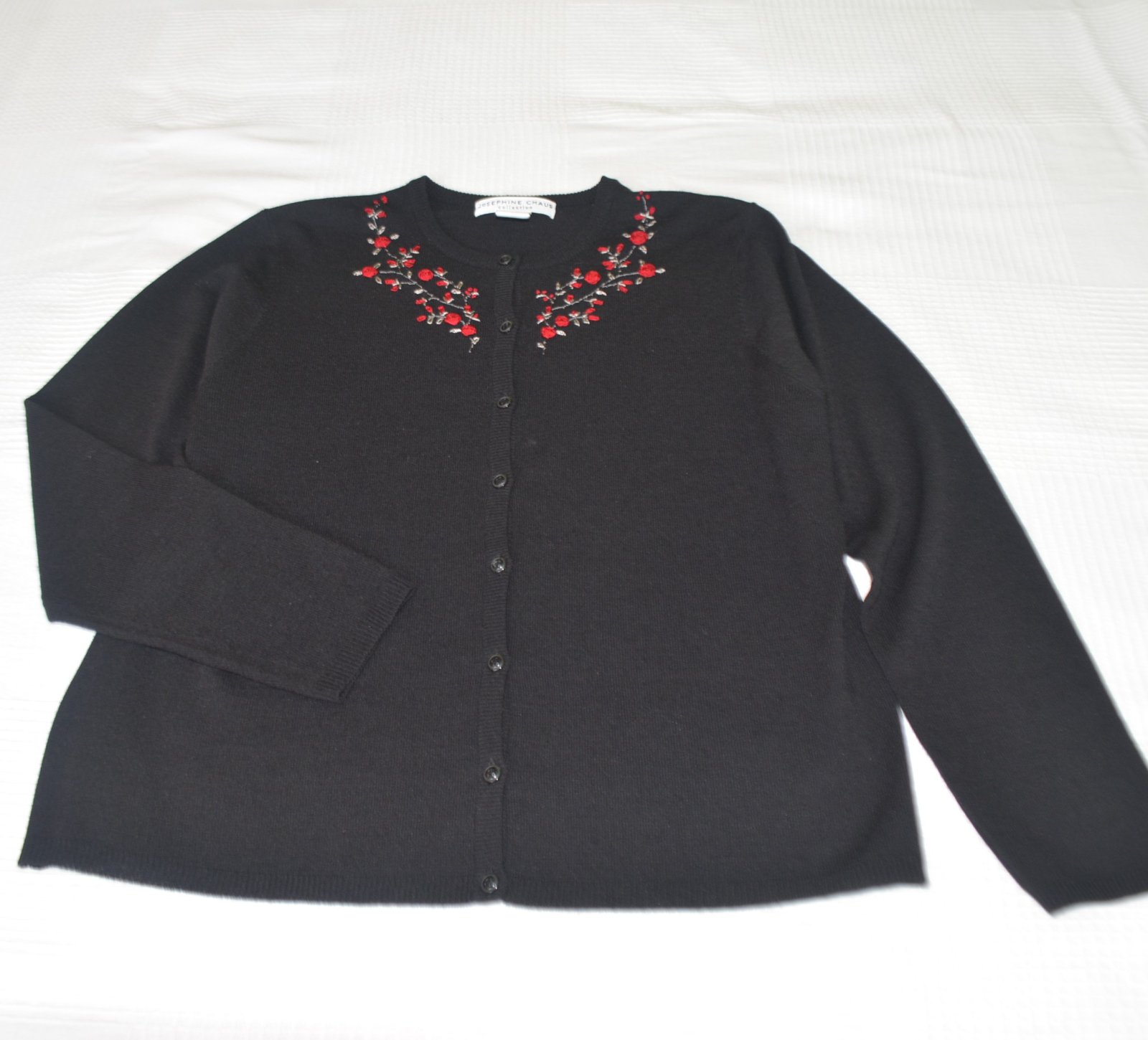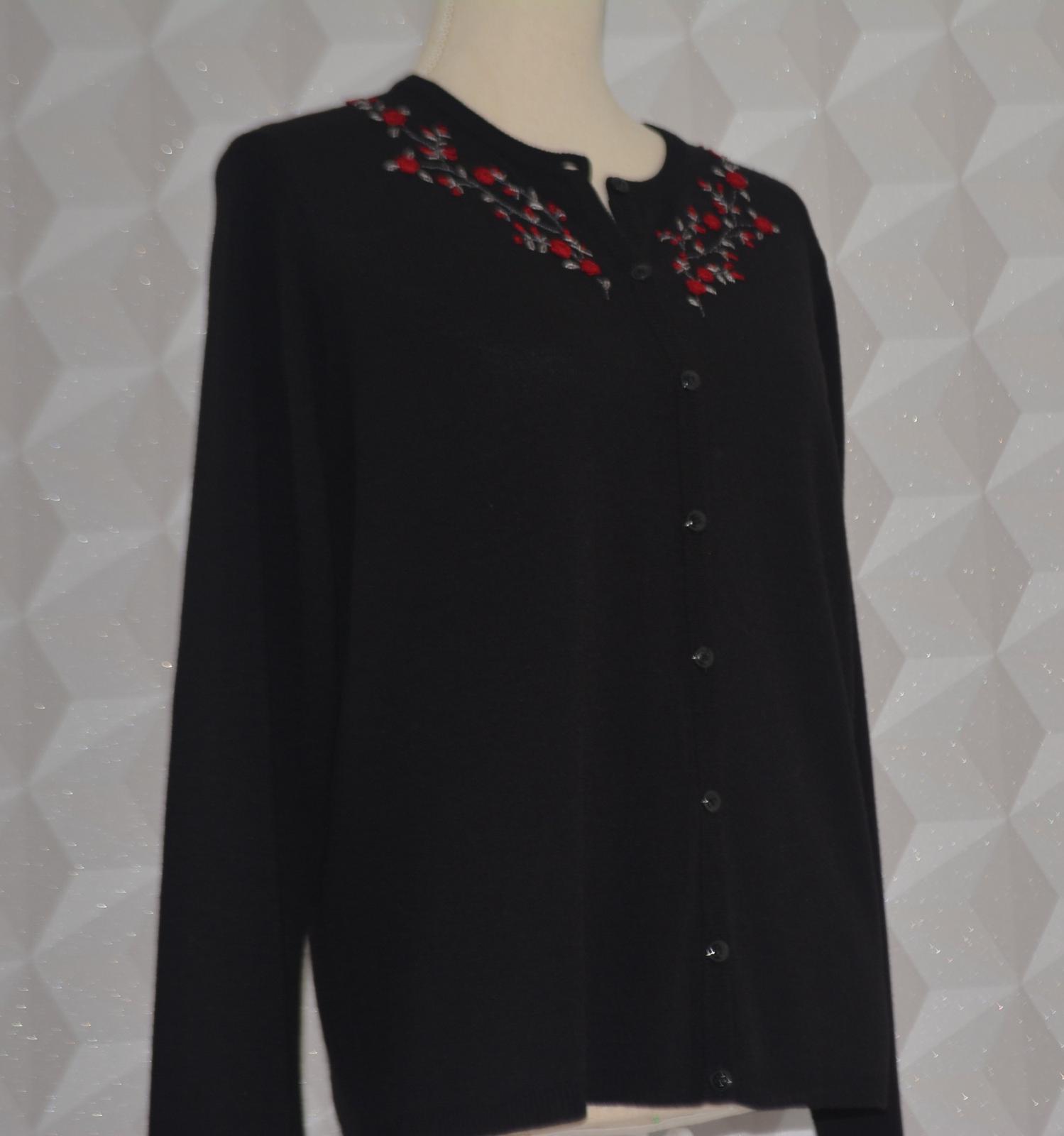 Čierny sveter Josephine Chaus so zapínaním na gombíky, veľkosť označená M, v pohode sedí aj na L - rozmery: dĺžka 60cm, pod pazuchami 2x53cm, rukáv od pleca 60 a od pazuchy 44cm.