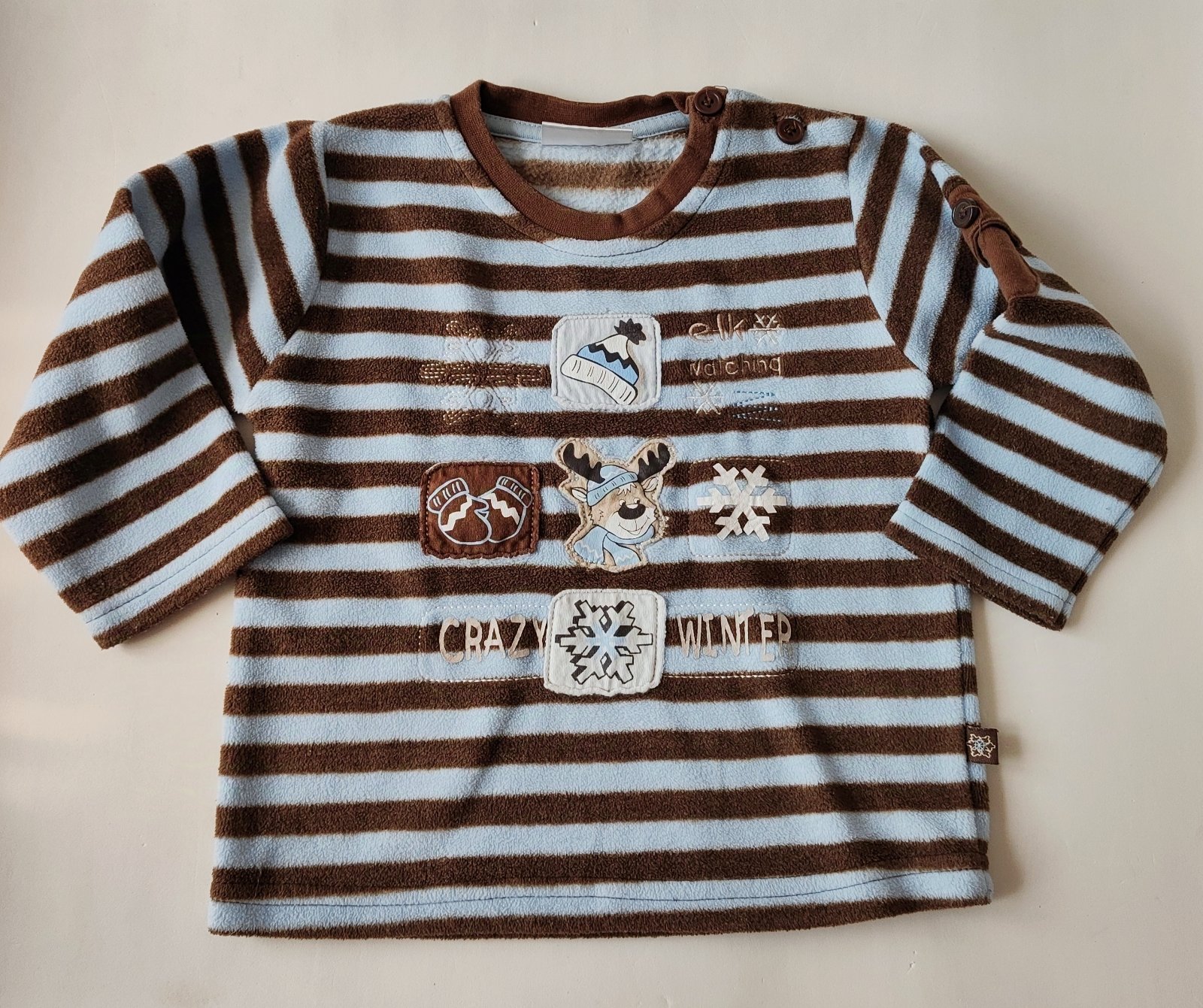 Príjemná a pekná mikinka, pre malého fešáka. Nie je vidno nosenie, malý ju mal oblečenú iba párkrát pod vestičku.... Veľmi pekne sedí. Celková dlĺžka:33cm rukáv od krku:29cm