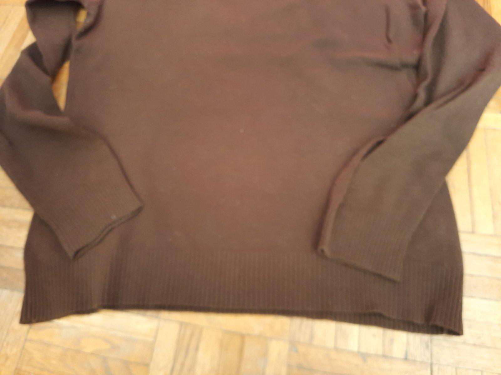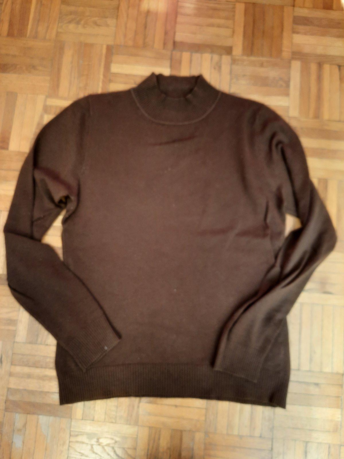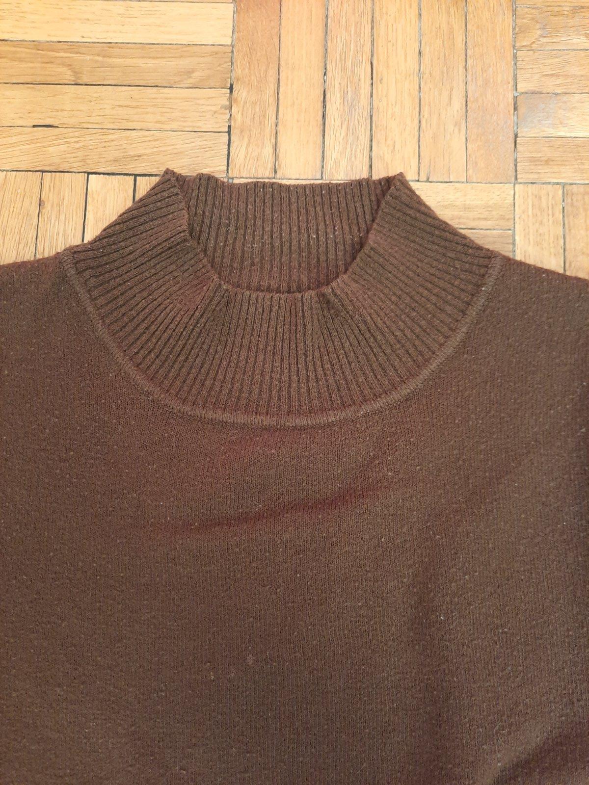 Pulóver v dobrom nosenom stave, sem-tam jemné žmoľky. Má vyšší krk- akoby polorolák. Manžety na rukávoch aj dole.