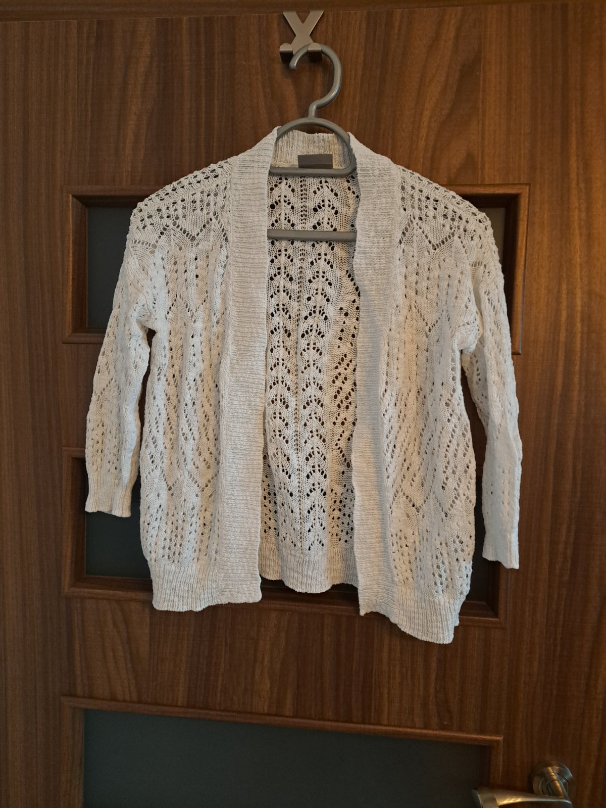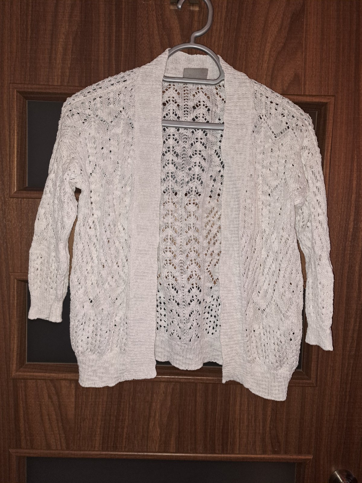 Bielo krémový krásny štýlový háčkovaný štrikovaný kardigan s 3/4 rukávom. Veľkosť uvedená S, ale sedieť bude pre teenagerku 158/164 alebo na dámske XS