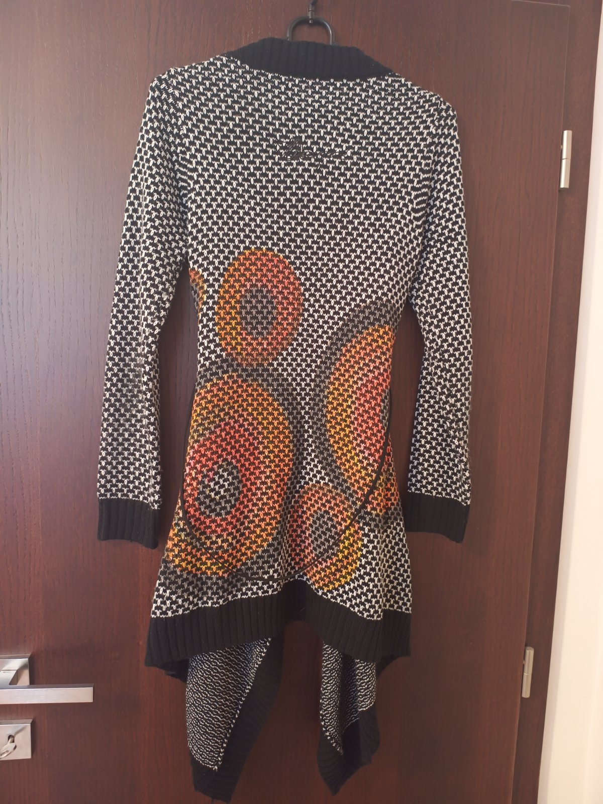 Predám dámsky svetrík zn. Desigual, veľkosť písaná M, ale je to určite S (36/38). Pekná čierna farba, spredu tmavošedá. Predná časť je taká tenšia látka. Veľmi pekný výrazný vzor, určite upúta. PC ...