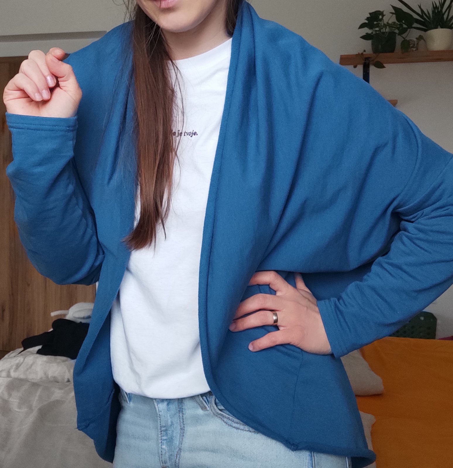 Kardigen je bez zapínania a pôsobí len ako taký prehoz na zakrytie rúk a ramien. Objednala som si ho do kancelácie, aby som mala niečo pri zapnutej klíme. Vzápätí som ostala na HO, tak mi leží v skrini. Pôvodná cena bola 40€. Posúvam za 20€. Je ako nový.