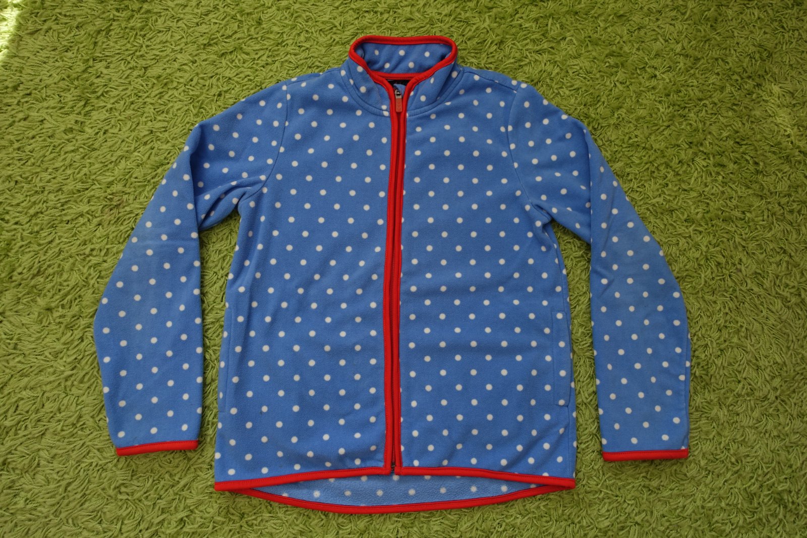 Predám krásnu fleesovú mikinku Tchibo vo veľkosti 146/152. Bola nosená na striedačku aj s inými mikinkami, ale je vo veľmi peknom nosenom stave. Mikinka je stredne hrubá. Má vrecká. Zips je plne funkčný. Dĺžka predného dielu je 54,5 cm a zadný diel je ešte o 3 cm predĺžený. Šírka je 44,5 cm. Dĺžka rukáva od krku 65 cm a od ramena 56 cm. (G)