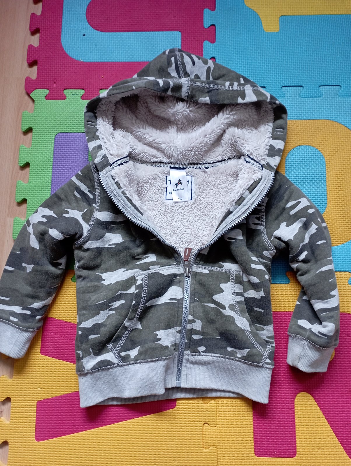 Predám zateplenu šedú mikinu s nápisom veľ.110,značka Palomino,v kapucňi bola šnúrka ktorá chýba ale nebráni to používaniu a ma menšie zmolky ,cena 2,50€