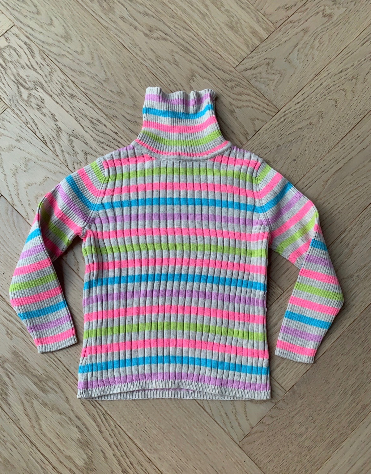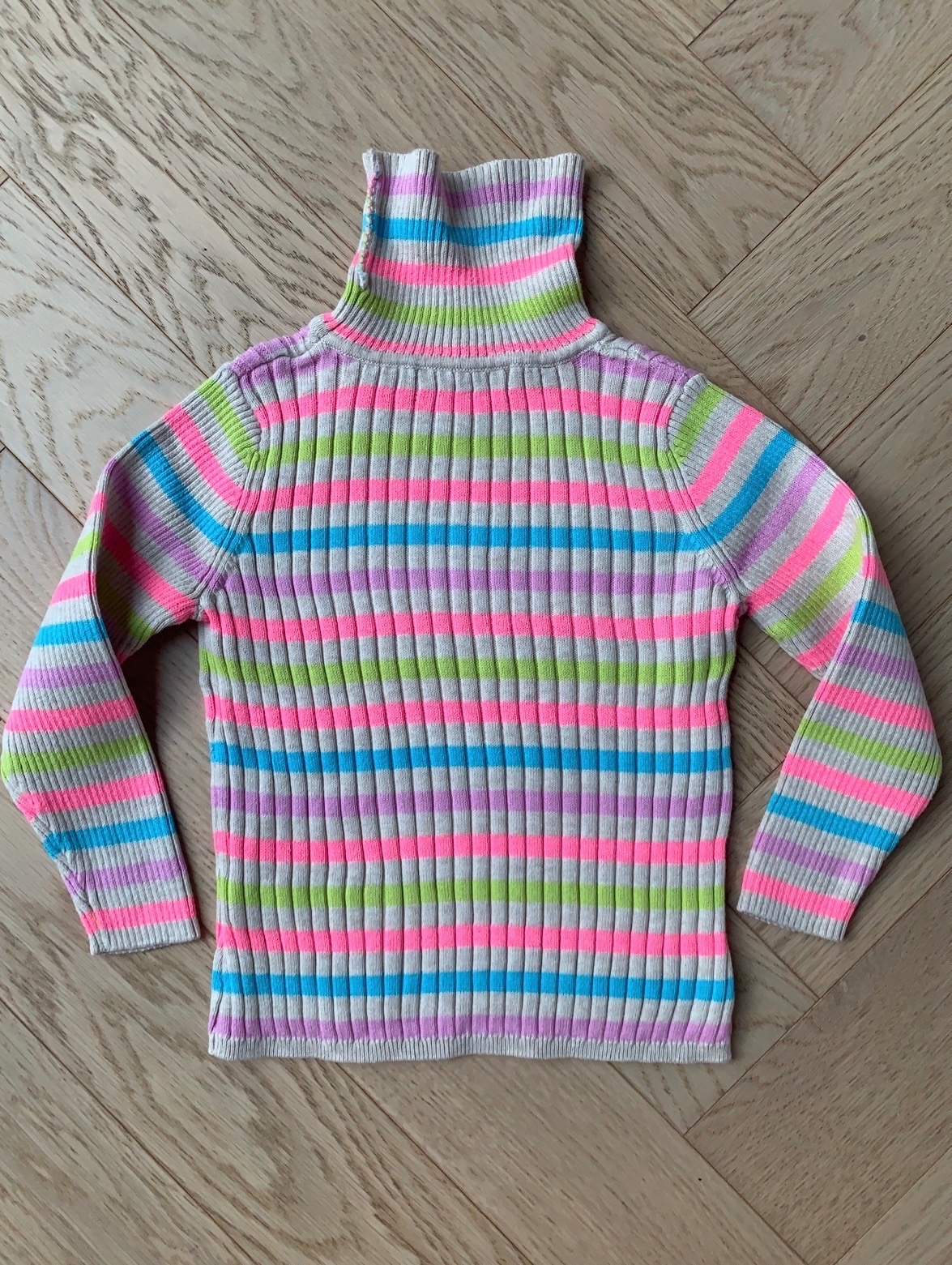 Na predaj je veselý dievčenský rolák s farebnými prúžkami. Má dlhé rukávy a je vyrobený z elastického rebrovaného materiálu, ktorý sa pohodlne prispôsobí postave. Rolákový golier poskytuje extra teplo počas chladnejších dní. Ružové, modré, zelené a fialové prúžky dodávajú hravý a moderný vzhľad. Ideálny na každodenné nosenie, do školy alebo voľnočasové aktivity.Celková dlžka je:35,5cm,dl.ruk.od krku:37cm,obvod hrudnika:2*23,5cm.