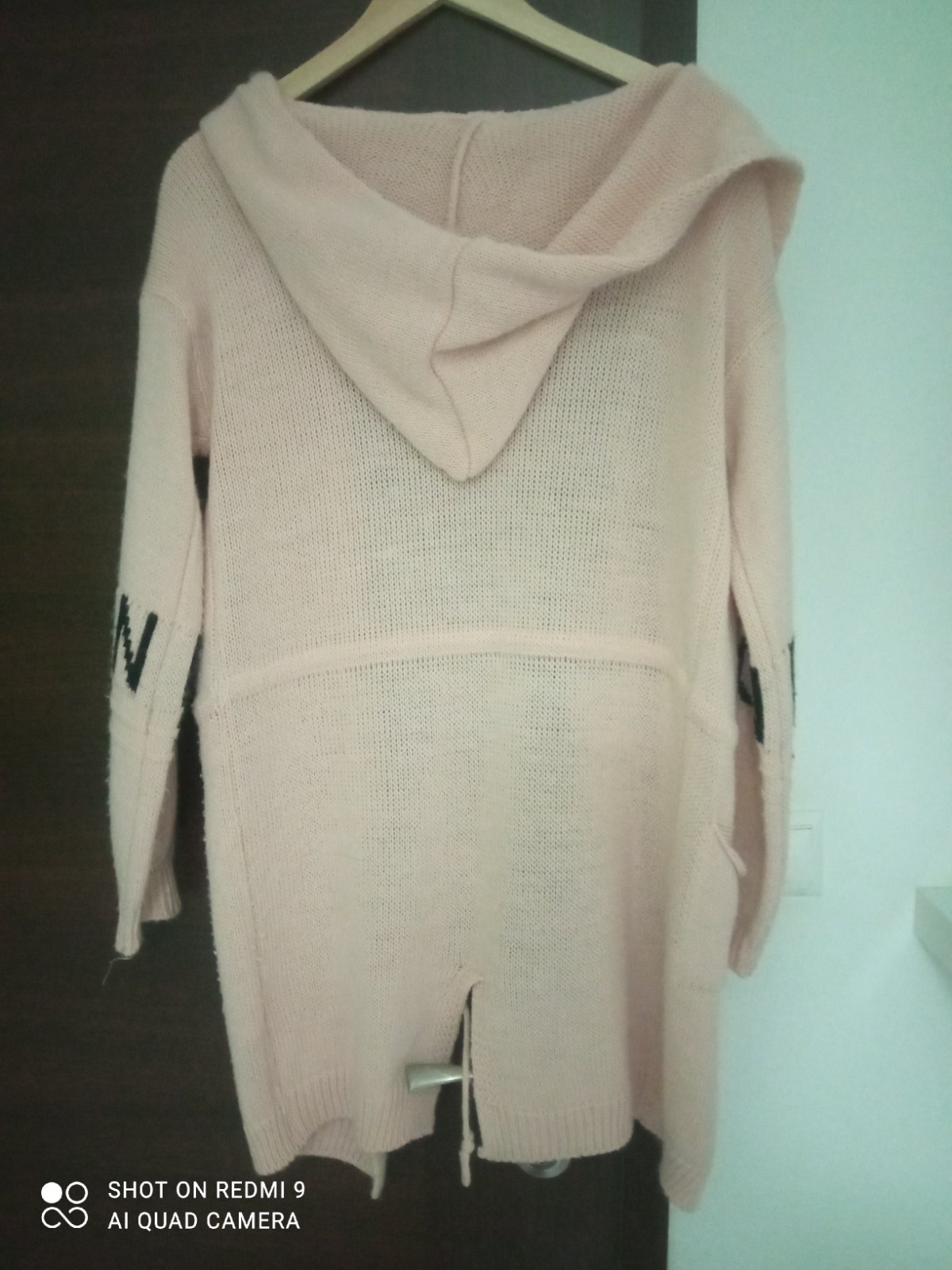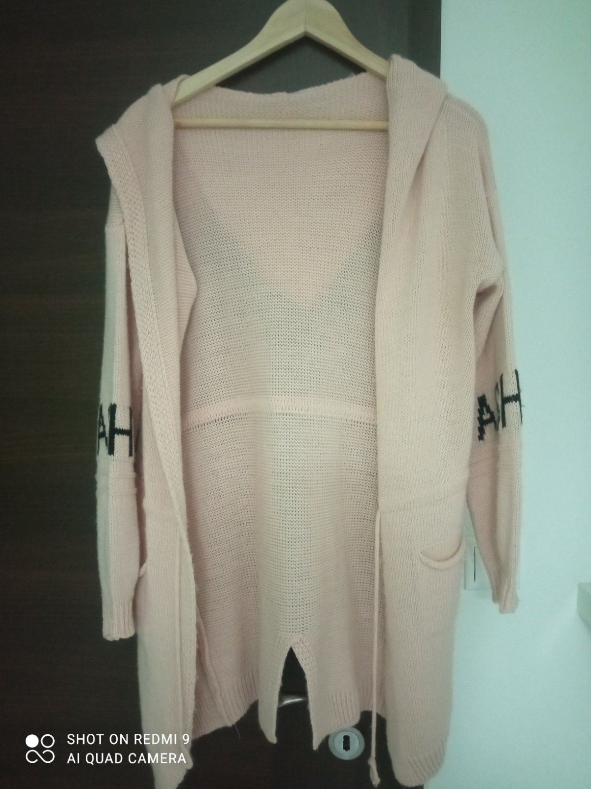 Kardigan ružovej farby s kapucňou. Vpredu má dve vrecká. V páse šnúrka na zaviazanie.