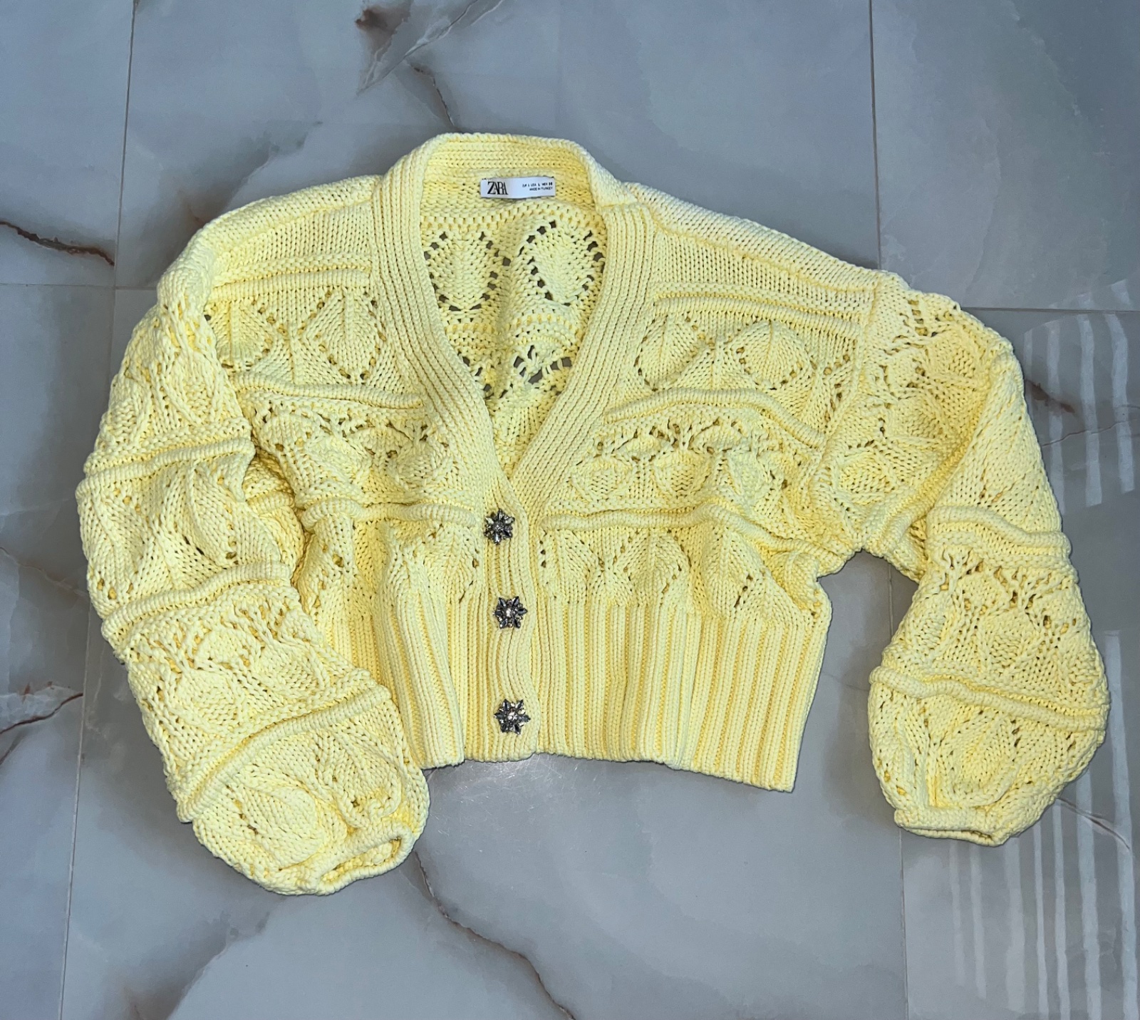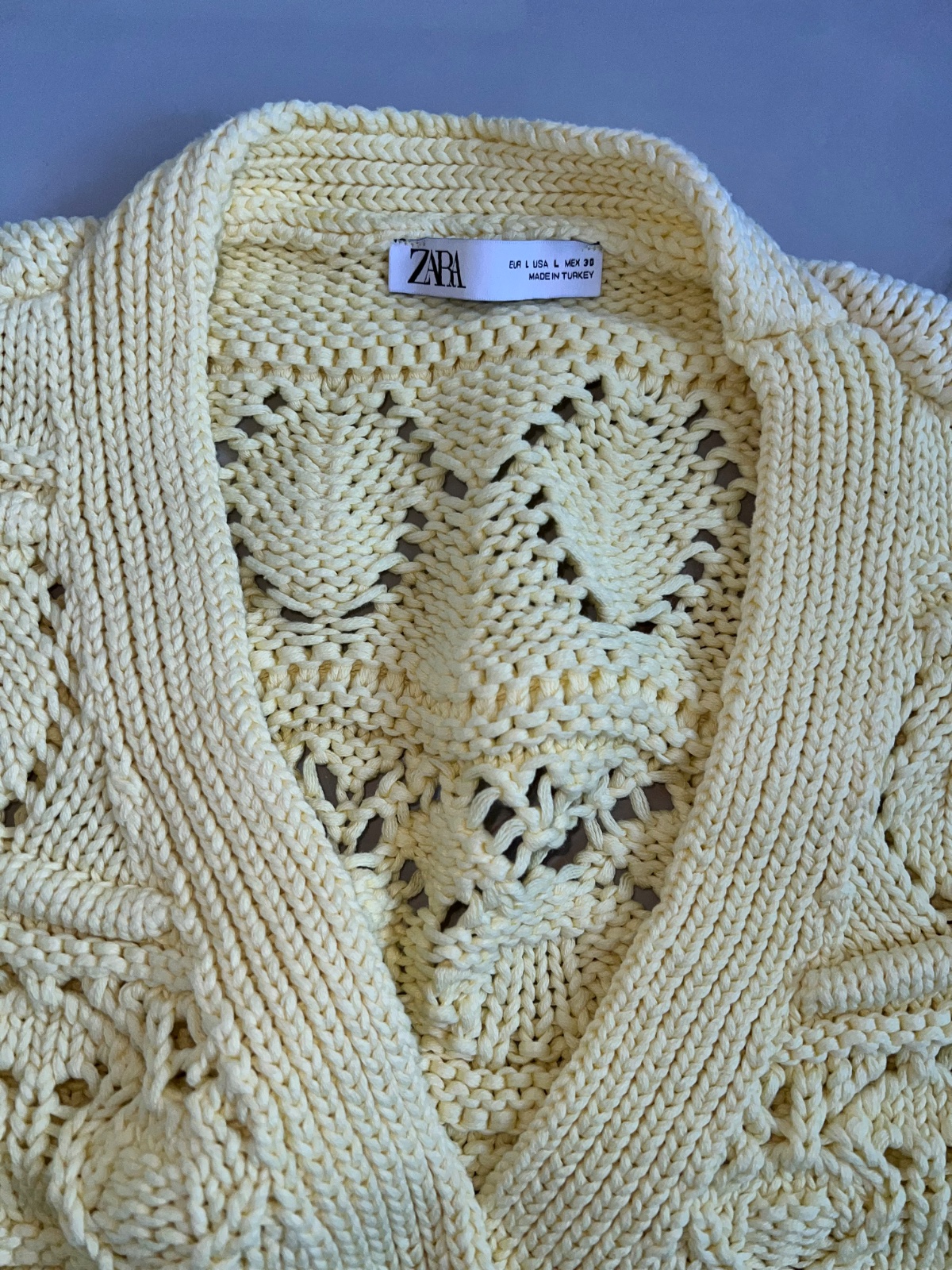 Predám žltý predĺžený sveter bez gombíkov s dlhým šálovým limcom a vačkami 14x14. zn. ZARA, veľkosť L. Material 70% viskoza, 30% nylon. Dĺžka chrbta 74, rukáv je ¾ s manžetkou 35 cm, rovného st...