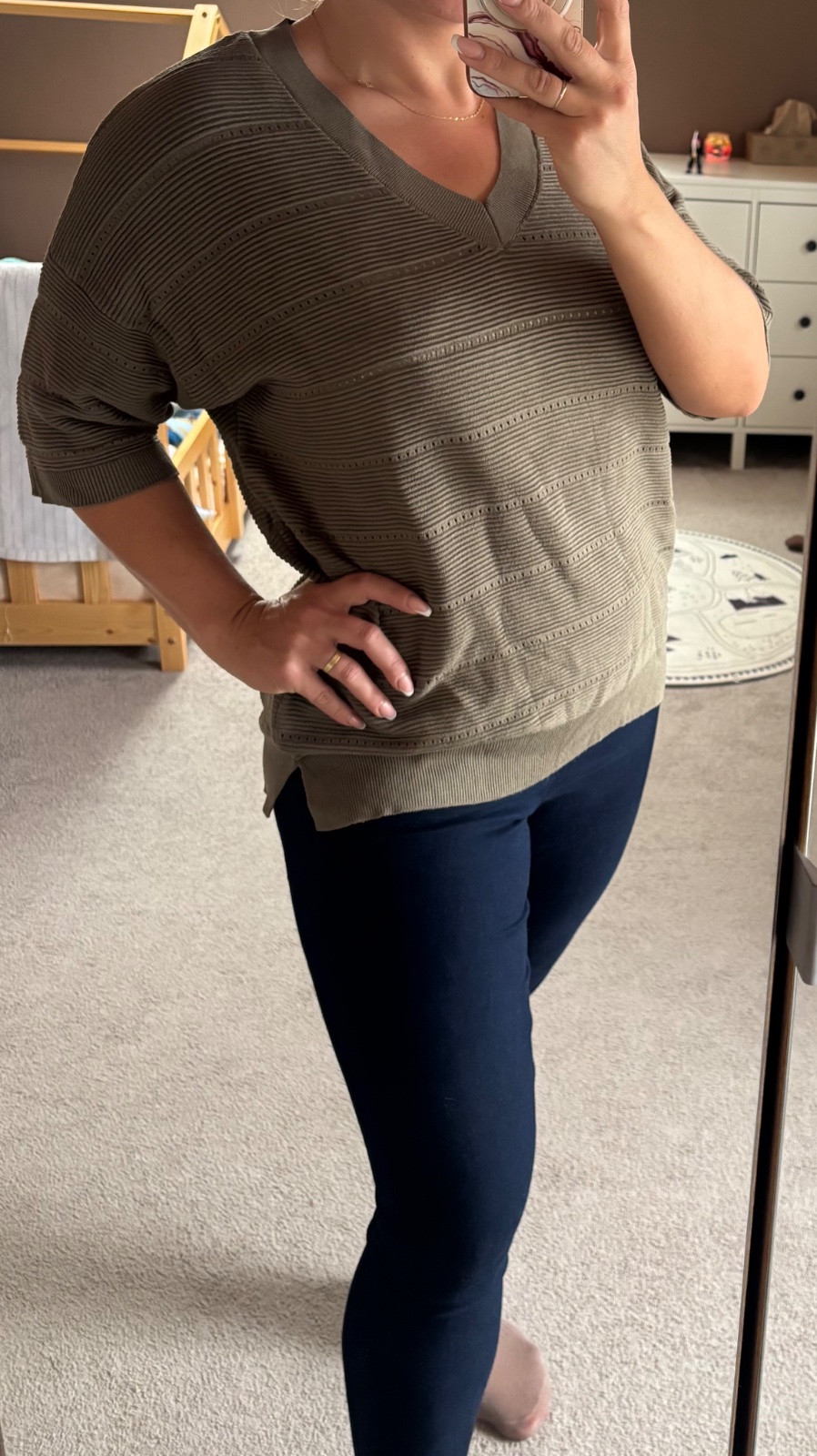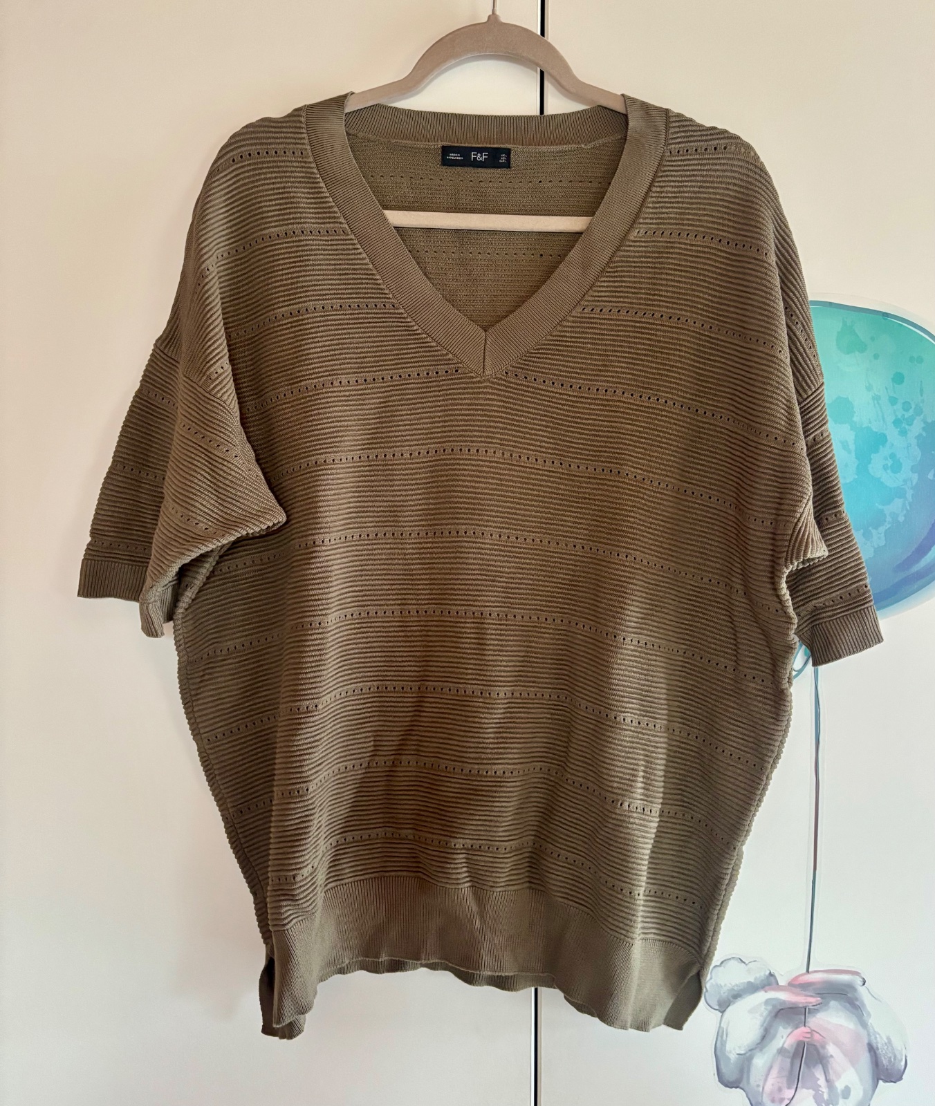 Iba vyskúšaný pulóver s mašľou nad bruškom. Veľmi pekný, k tomu zelené tričko zdarma