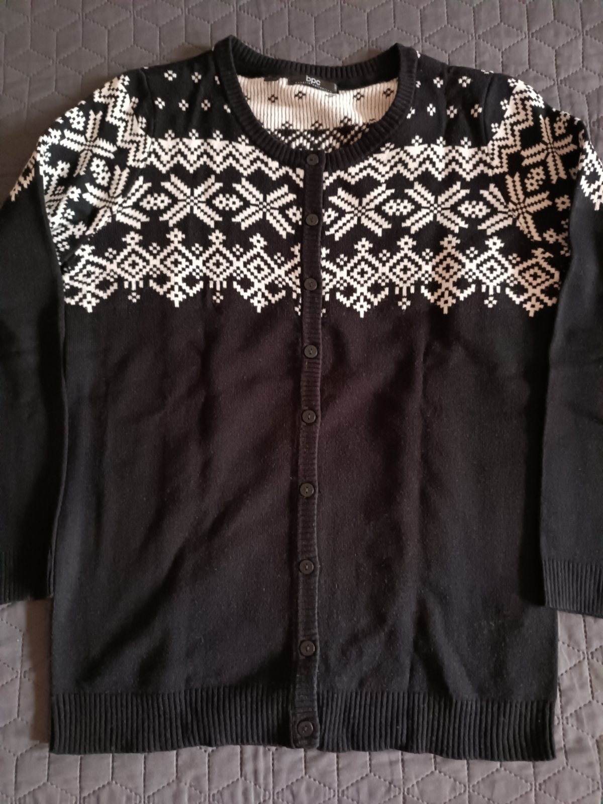 Veľmi dobrý stav, veľkosť 40/42. Pazuchy 52 cm, dĺžka okolo 70 cm. Rukáv od krku tiež okolo 70 cm. S vianočným motívom, na zapínanie. Cena 5 eur plus poštovné.